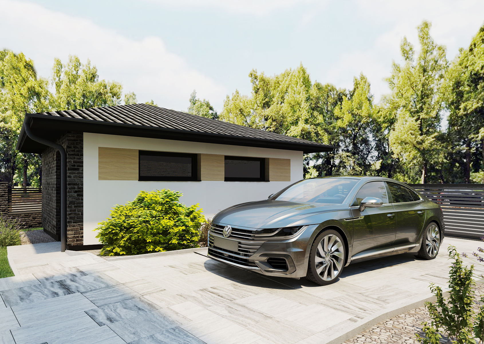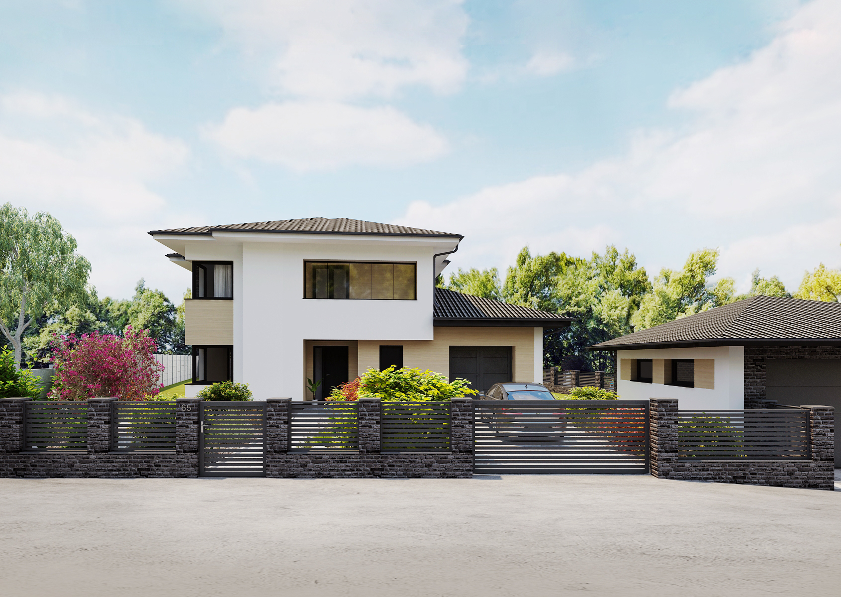 Rodinný domek s vlastní garáží a zahradním domkem nepostrádá vlastní příjezdovou cestu k domu a vjezd do garáže přímo z ulice. Kamenné sloupky s kovovým plotem nabízí vjezd pomocí automatické brány či vstup přes branku.