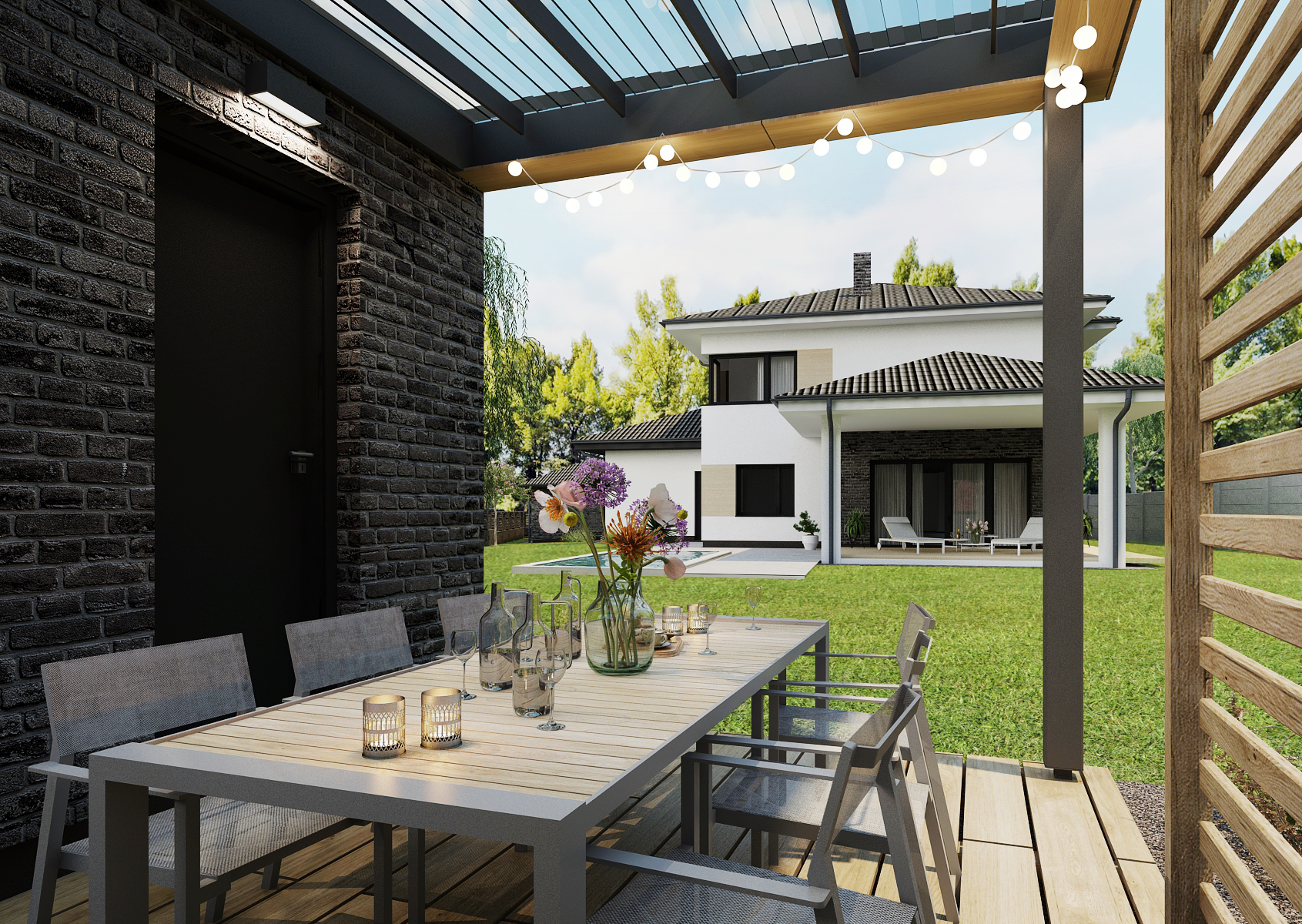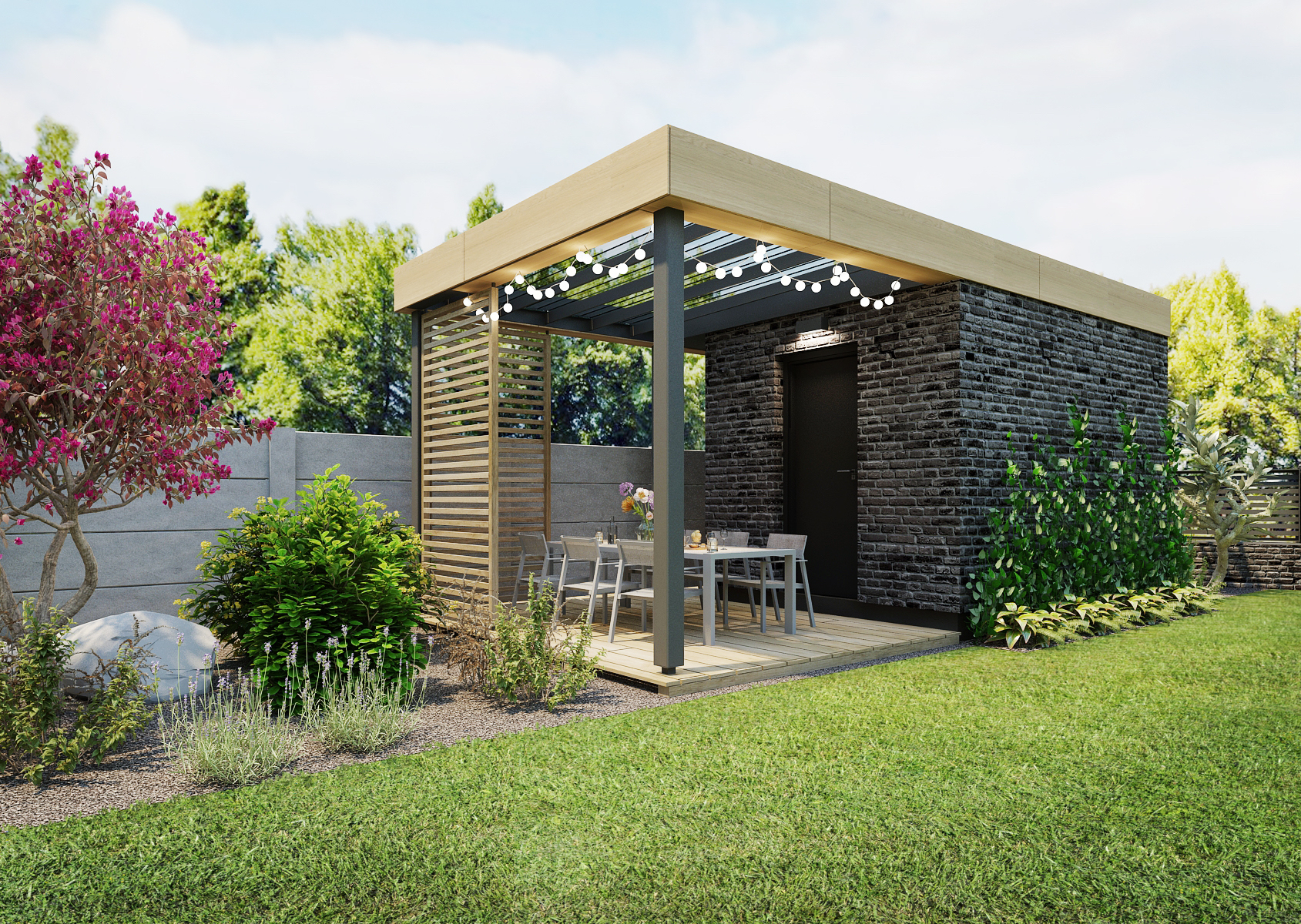Cihlový zahradní domek s terasou se nachází za rodinným domem na prostorné zahradě, je tak obklopen přírodou. Na terase se nachází posezení s přístřeškem, jehož střecha je vybavena otočnými žaluziemi, které se dají nastavit dle potřeby.