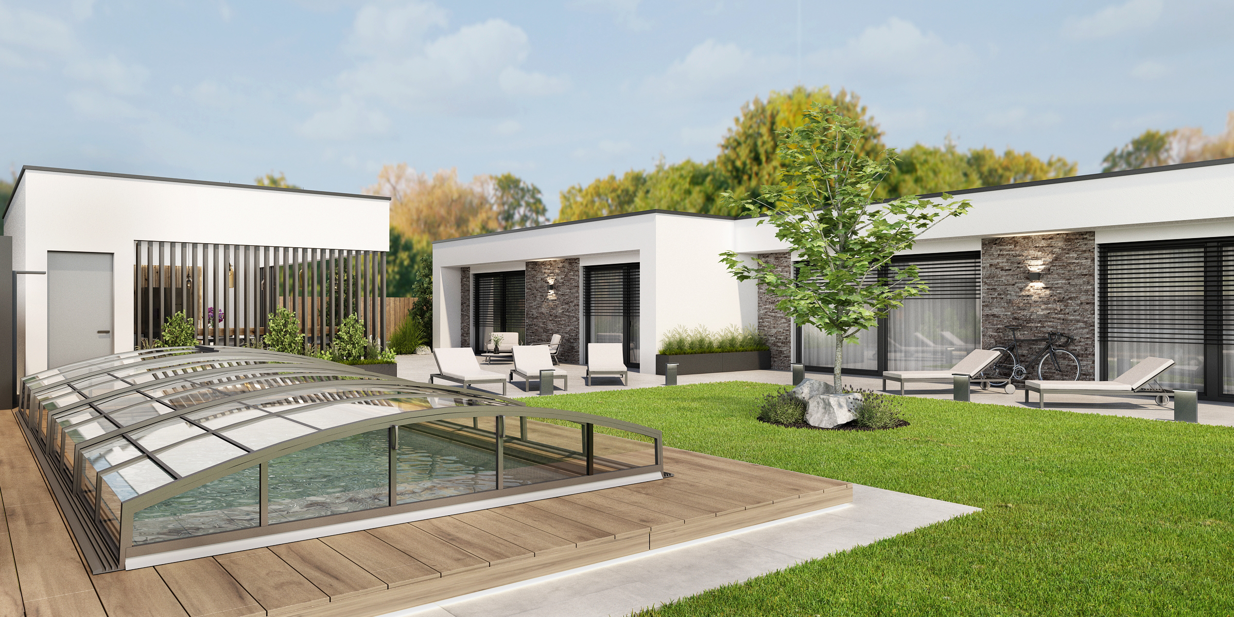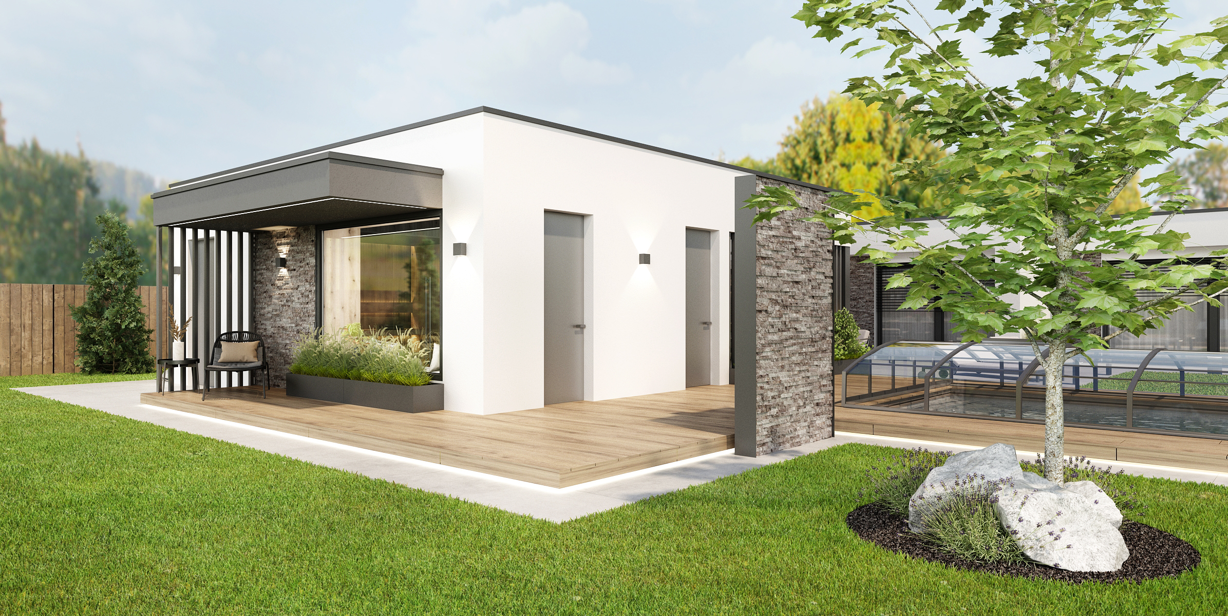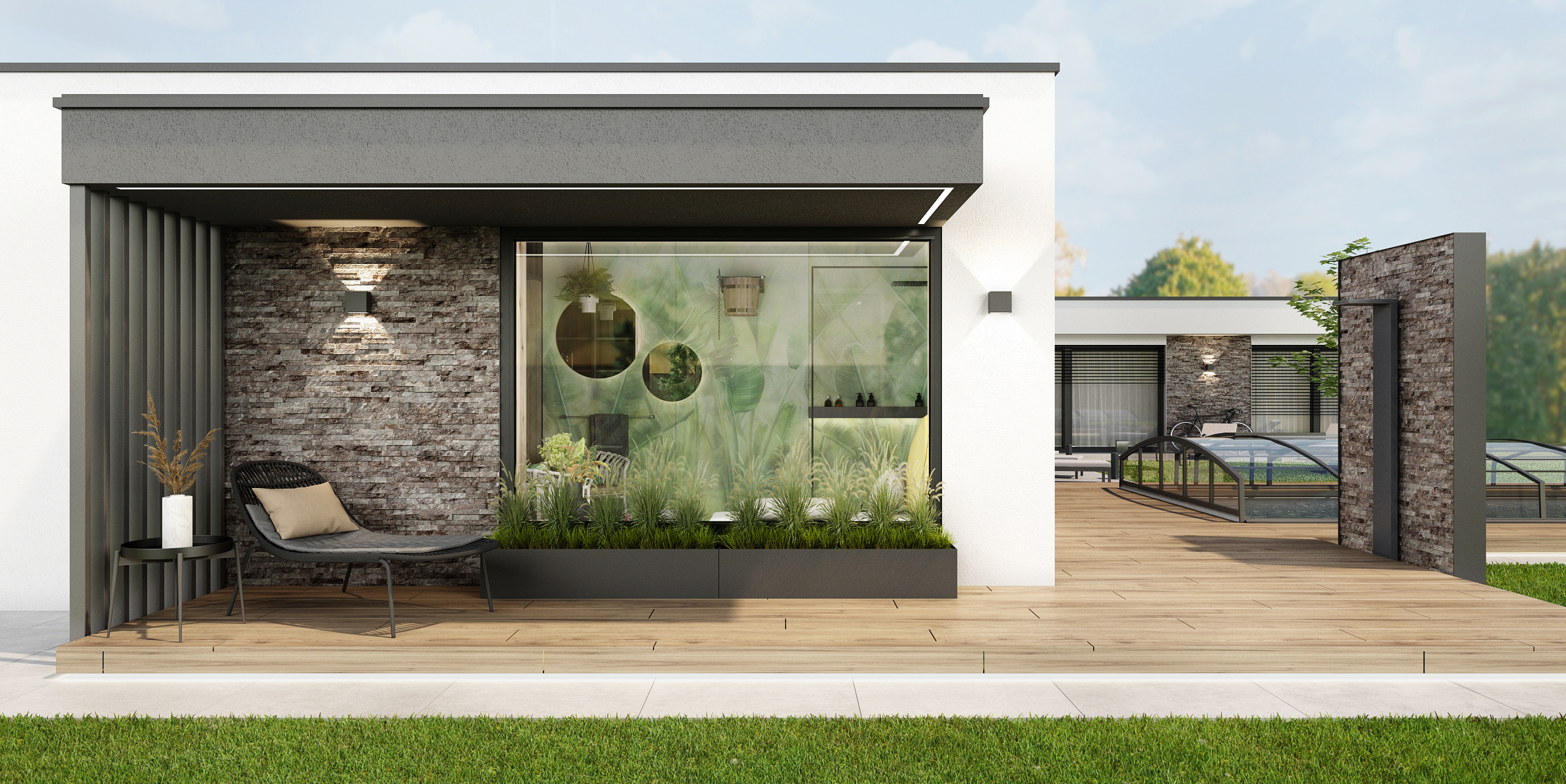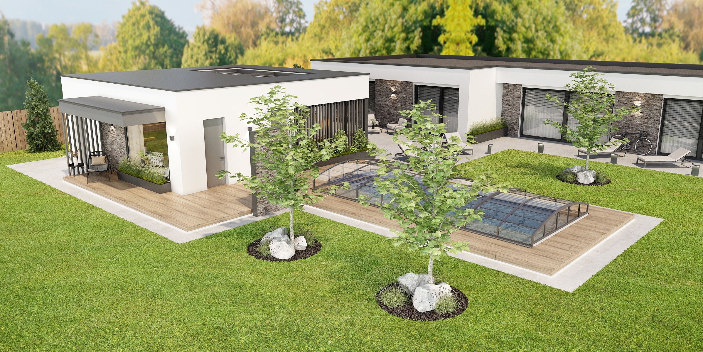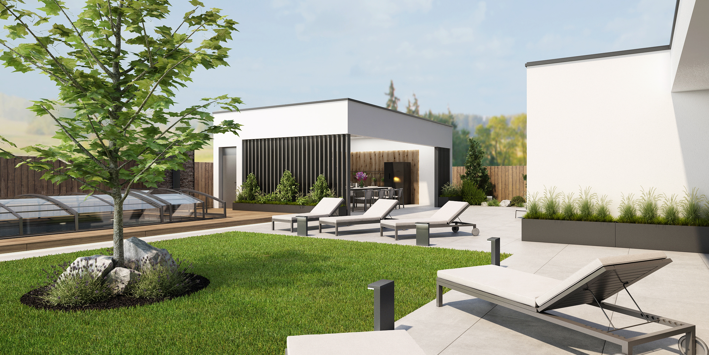 Světlá dlažba je pomyslným navigátorem po zahradě od domu až k zahradnímu domečku a krytému bazénu. Otevřený zahradní domek s lamelovým obložením poskytuje vše, co je potřeba k rodinnému či přátelskému setkání. Kromě velkého jídelního stolu s mnoha židličkami je zde k dispozici i masivní bar s kovovou podnoží a barovými židličkami.
