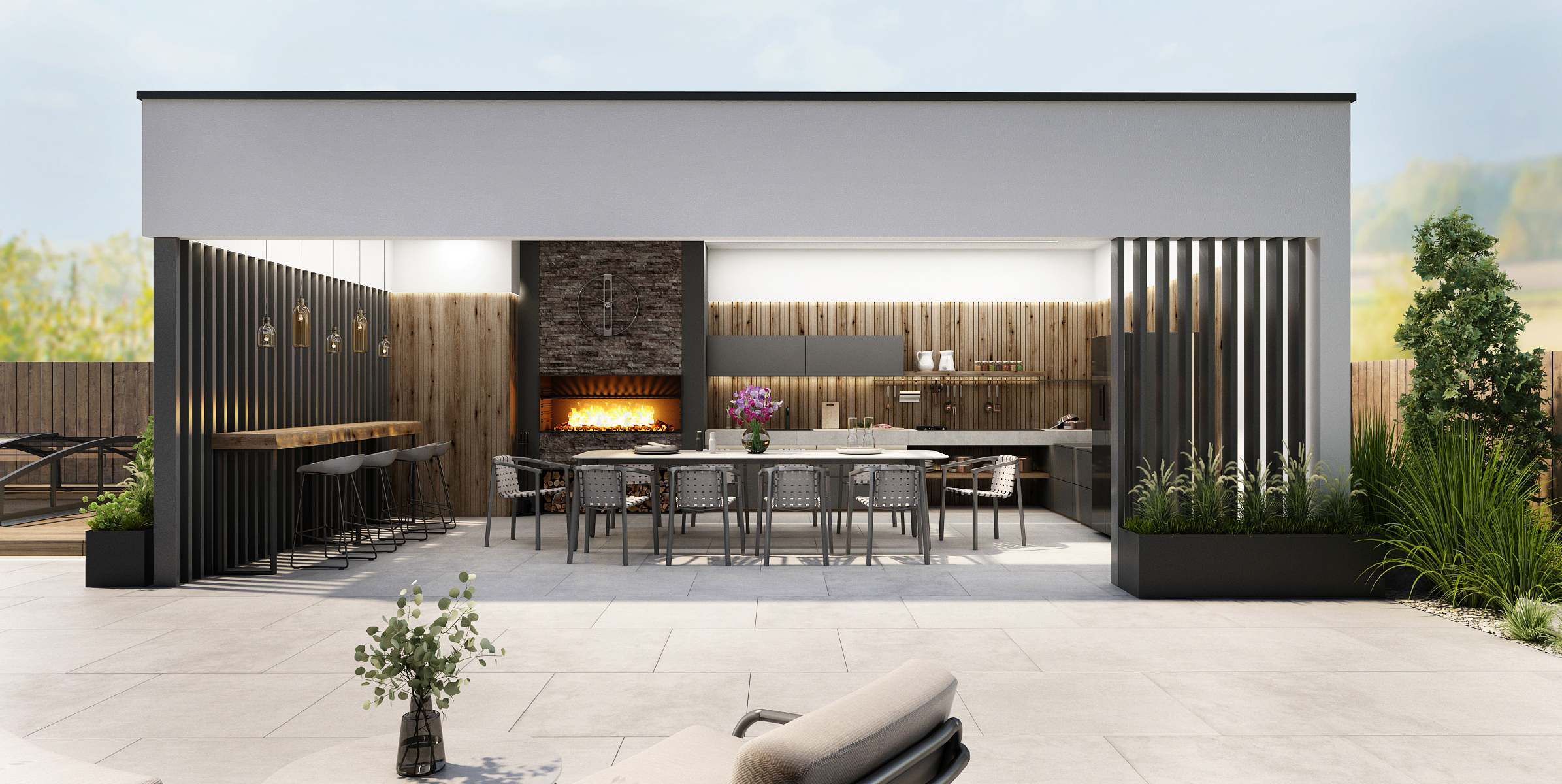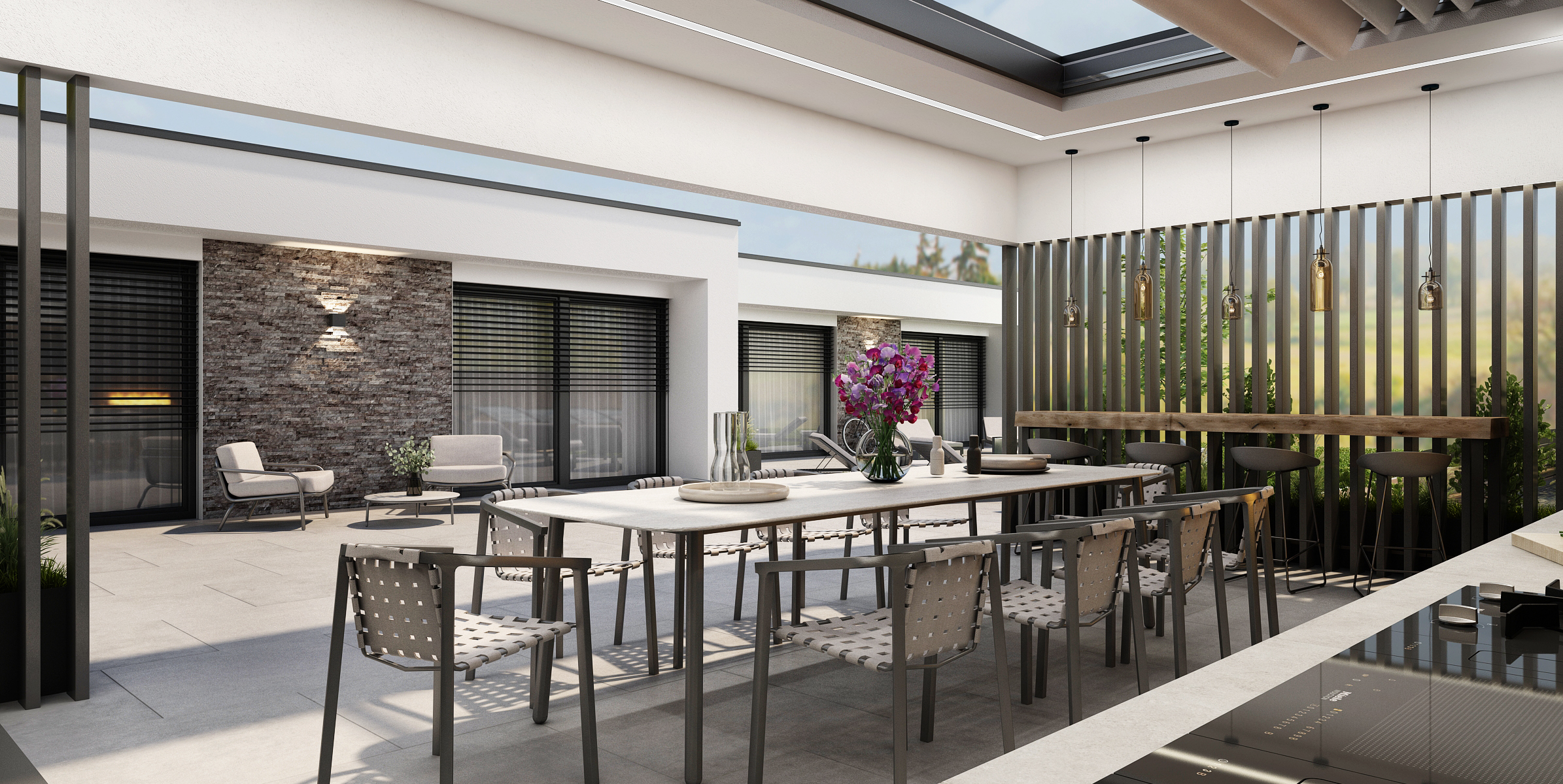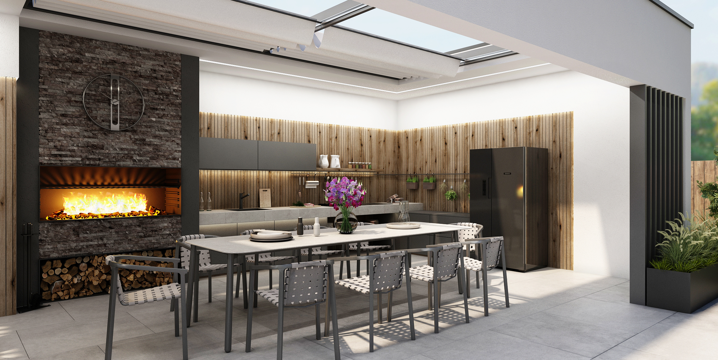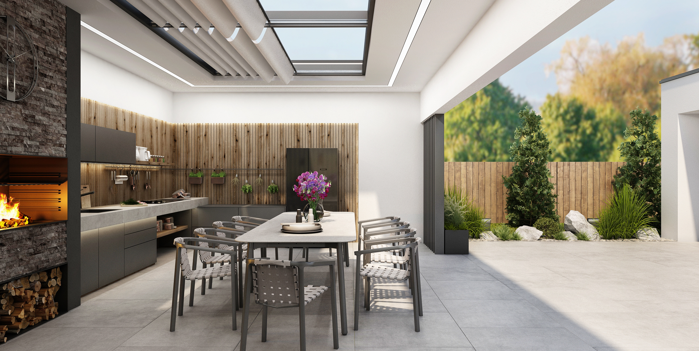 Prostorný gril s obložením z přírodního kamene je doplněn kuchyňskou linkou s kamennou deskou, americkou lednicí a spoustou úložného prostoru. Nechybí ani podsvícení polic a horních skříňek. Dominantou venkovní kuchyně je střešní okno s roletami, díky kterým lze regulovat světlo uvnitř. Zároveň v noci poskytuje výhled na noční oblohu.
