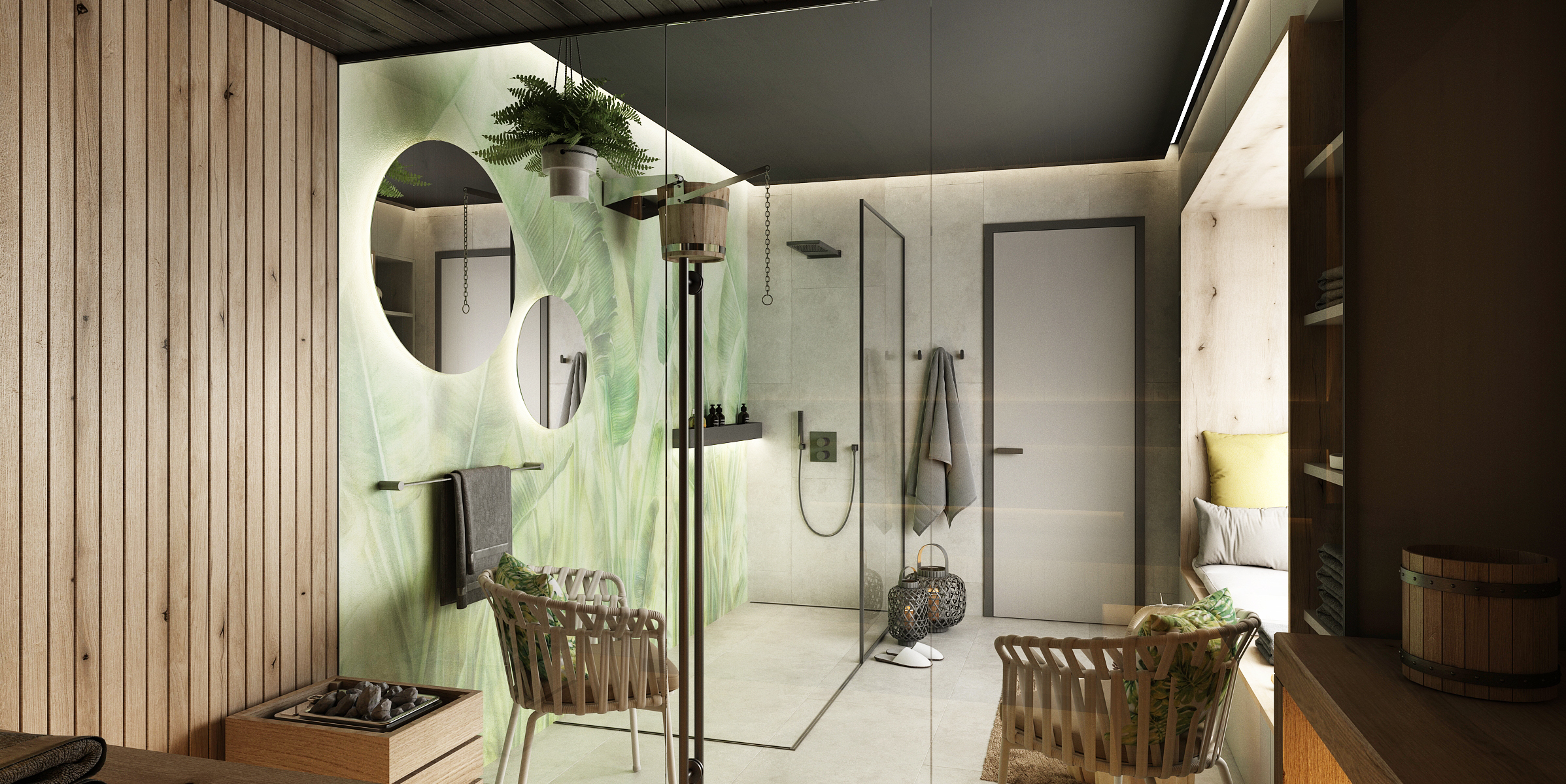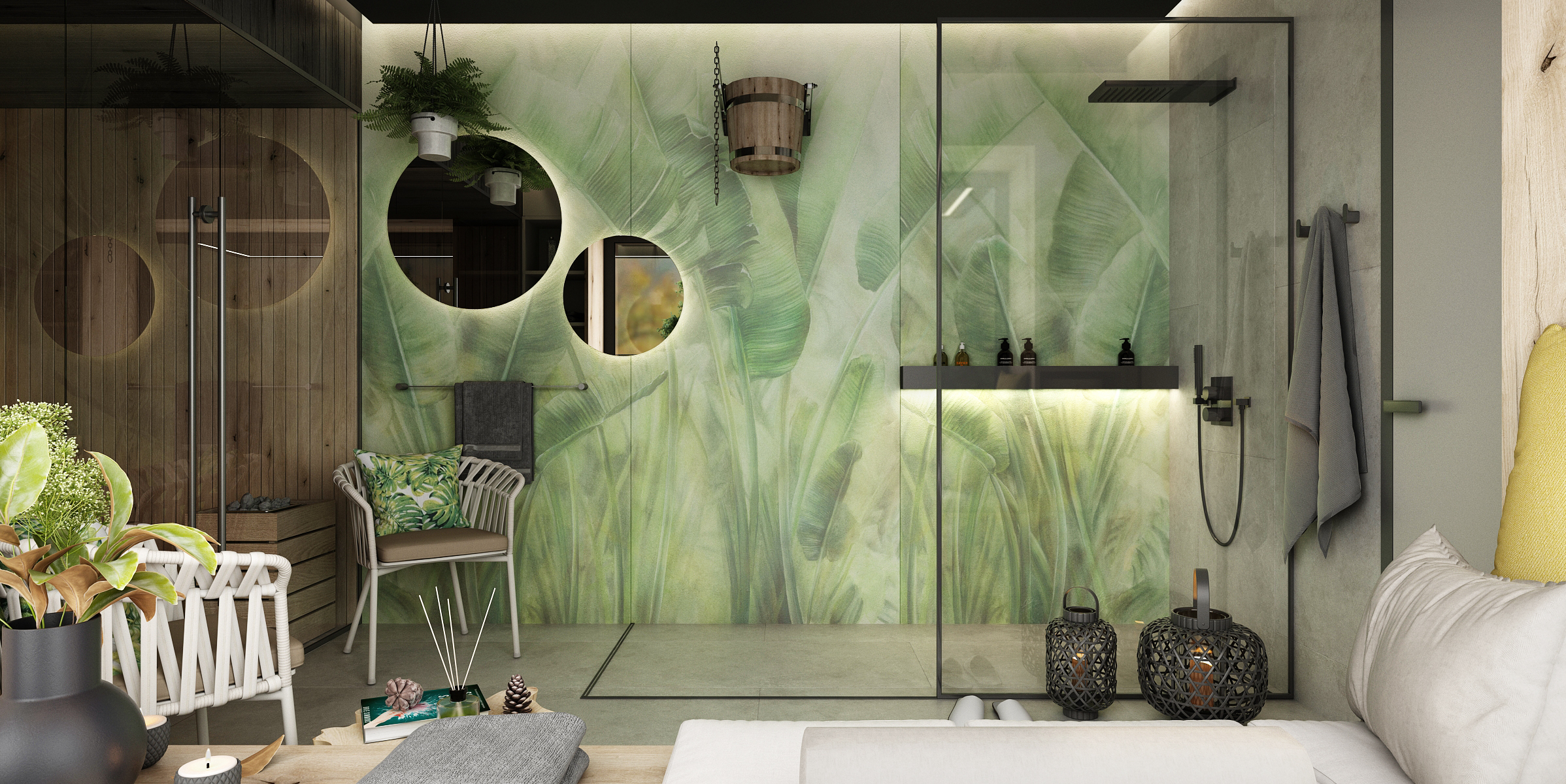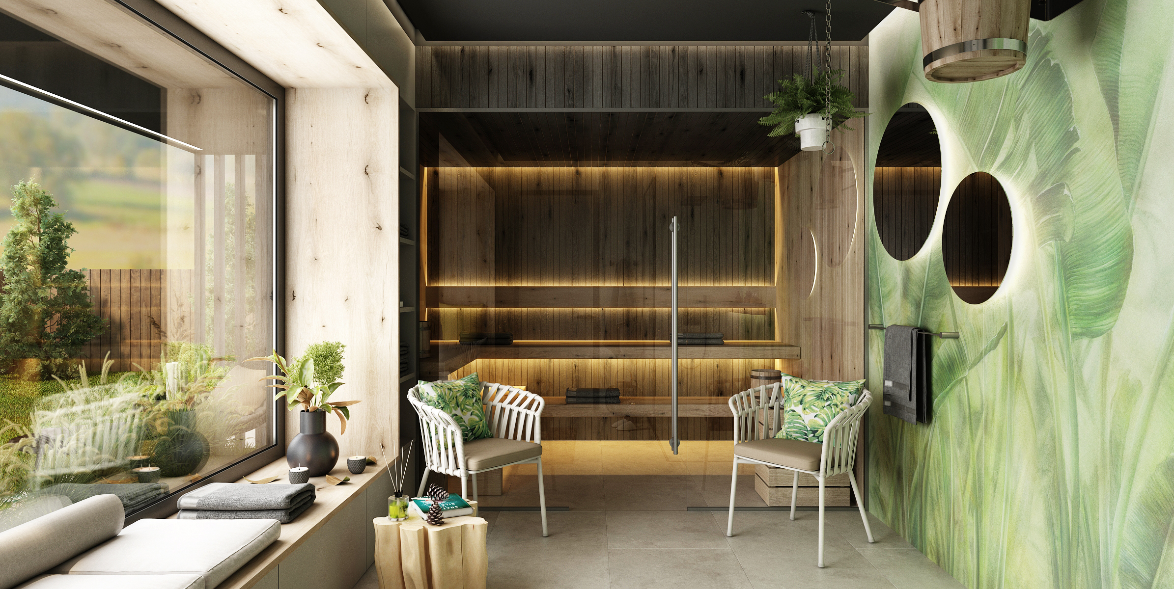 Co se vlastního wellness týče, z toho příroda jen vyzařuje. Ať už jde o použití přírodního dřeva či tapet a dekorací s motivem listů, nejzajímavějším doplňkem je zde odkládací stolek v podobě špalku. Kromě samotné sauny se zde nachází i walk-in sprcha a kbelík s vodou.