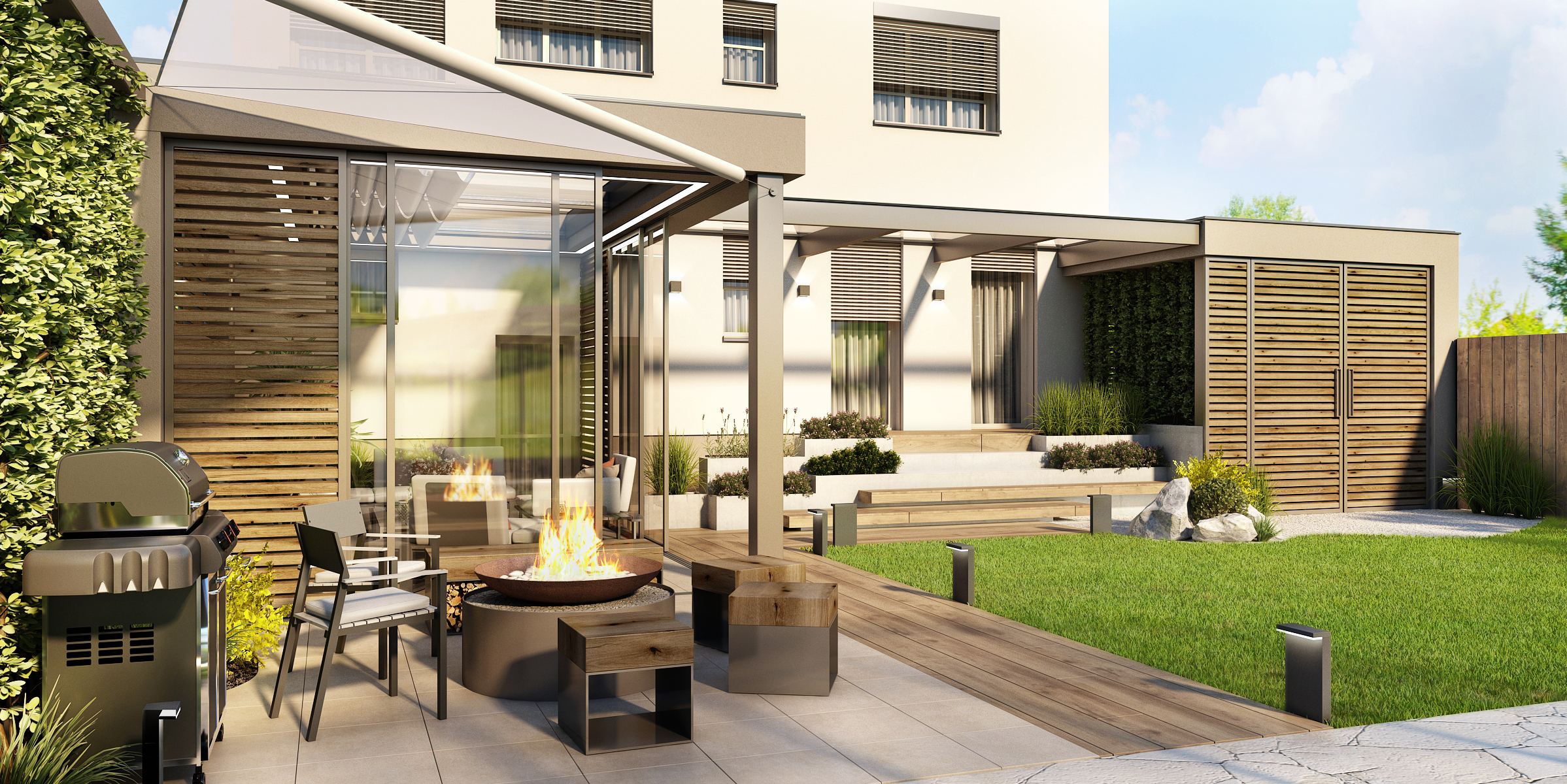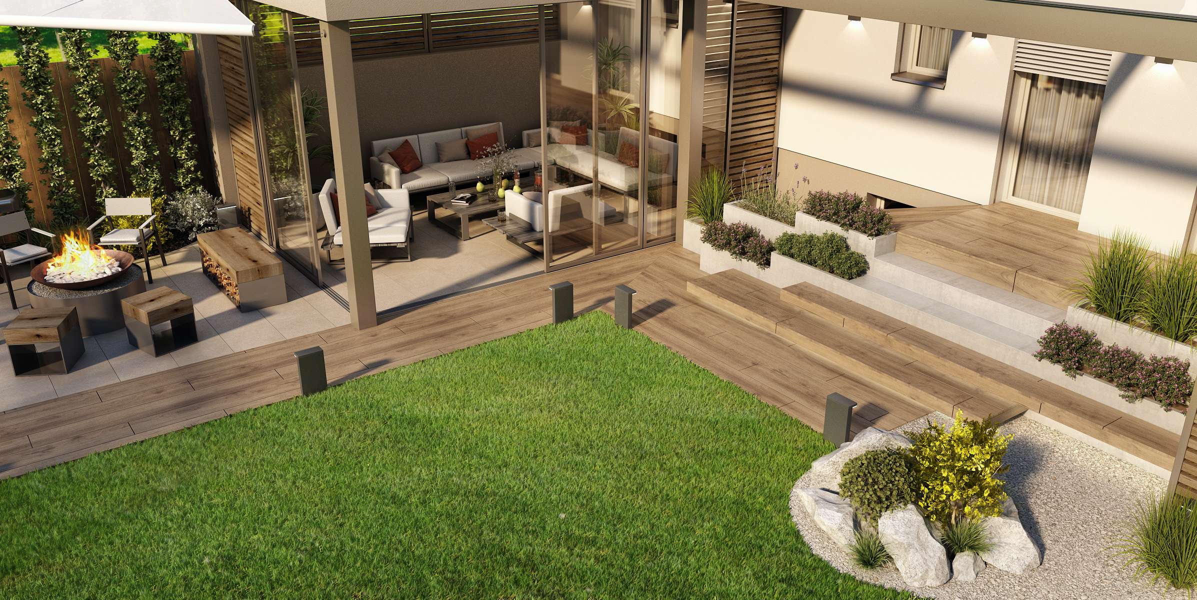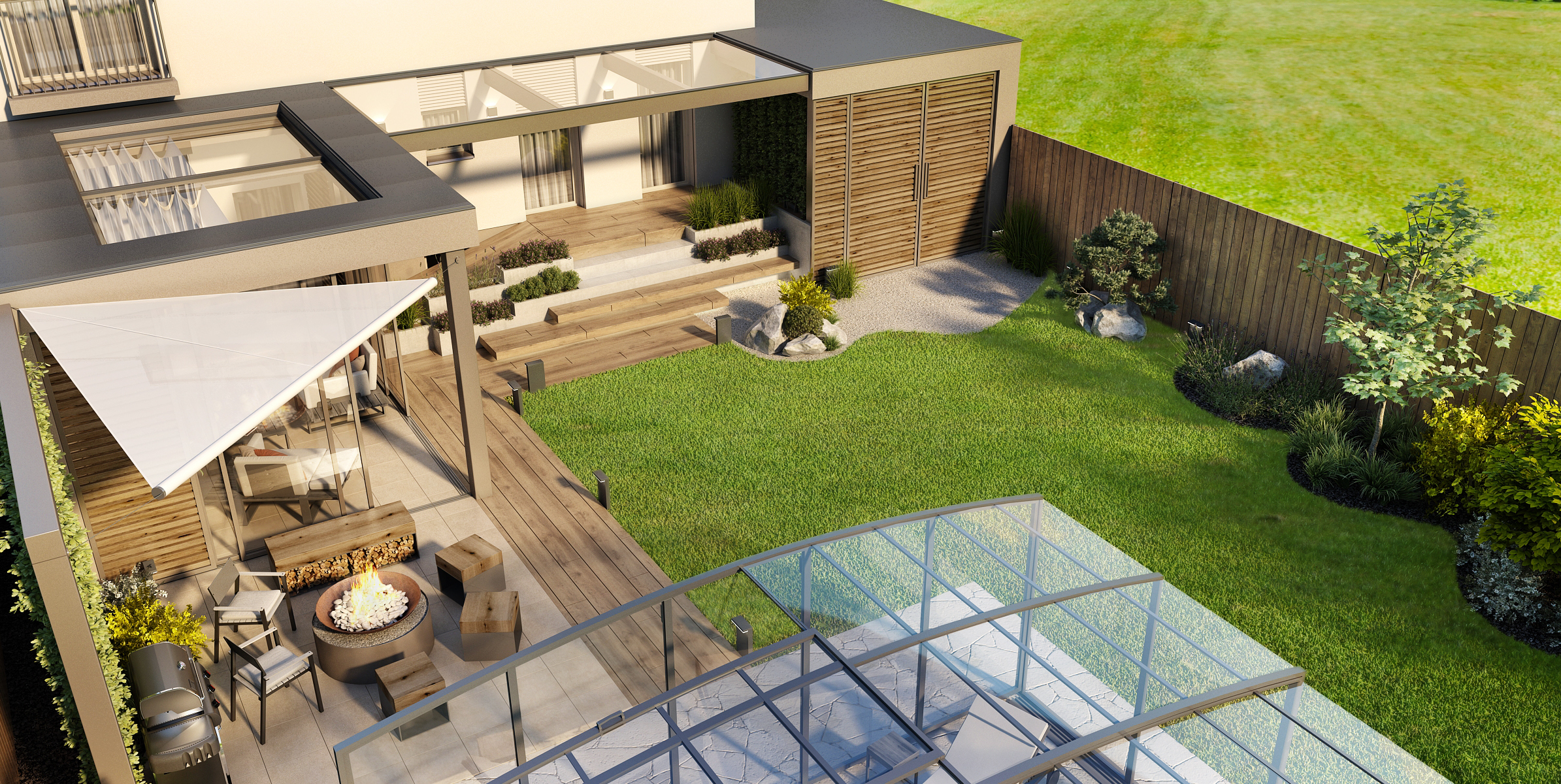 Prostorná terasa do tvaru L s přístřeškem poskytuje úkryt i v nepříznivém počasí. Prosklené posunovací dveře poskytují jak skvělý výhled na zahradu, tak i možnost průchodu k ohništi a grilu s posezením. Masivní lavice c kovovou podnoží nabízí úložný prostor ať už pro dřevo na zátop nebo jiné potřebné věci. Tato část je doplněna i o provizorní stěnu ze zeleně.