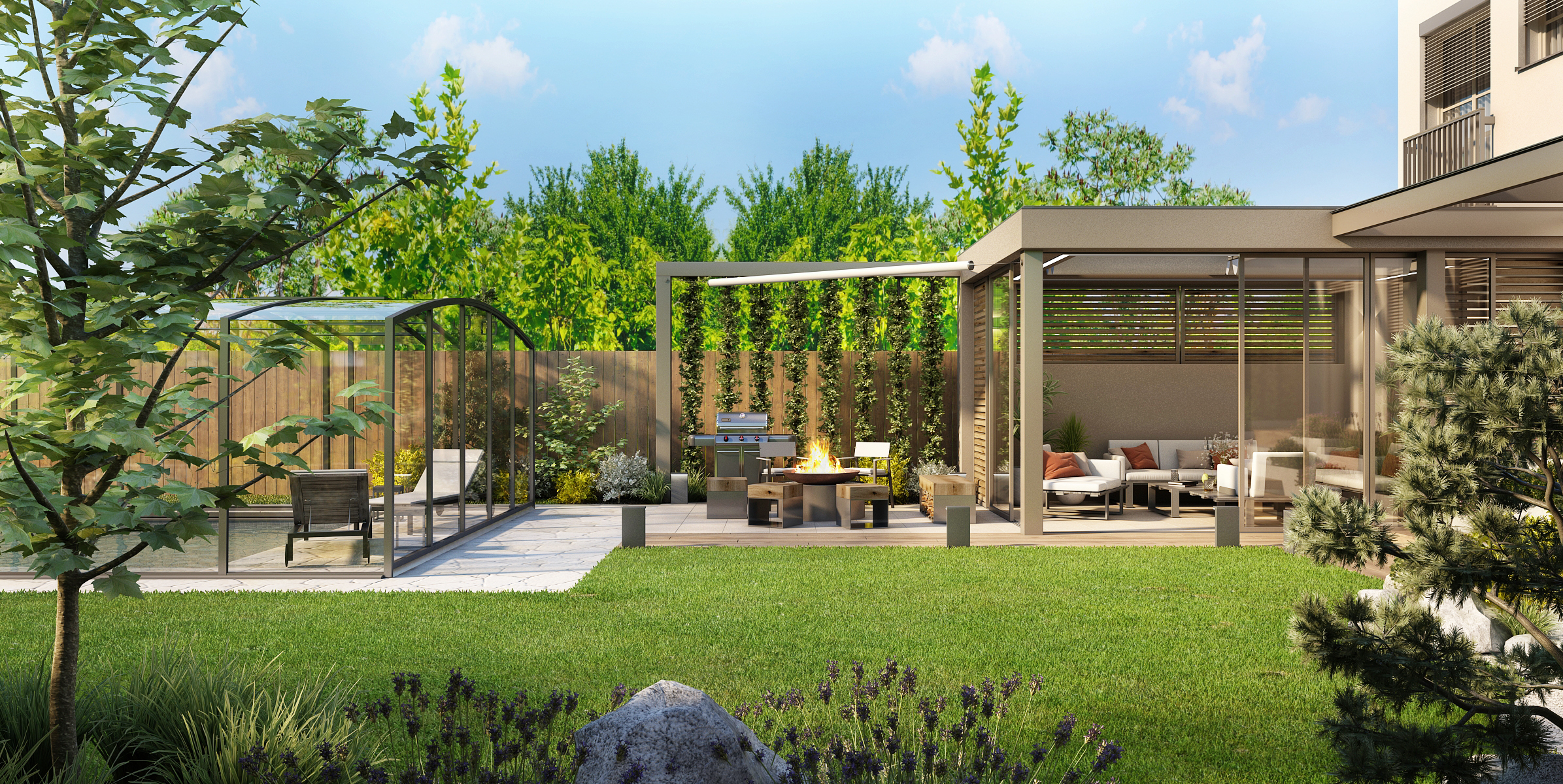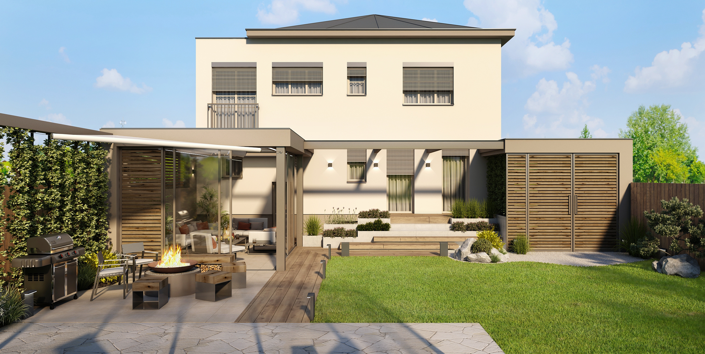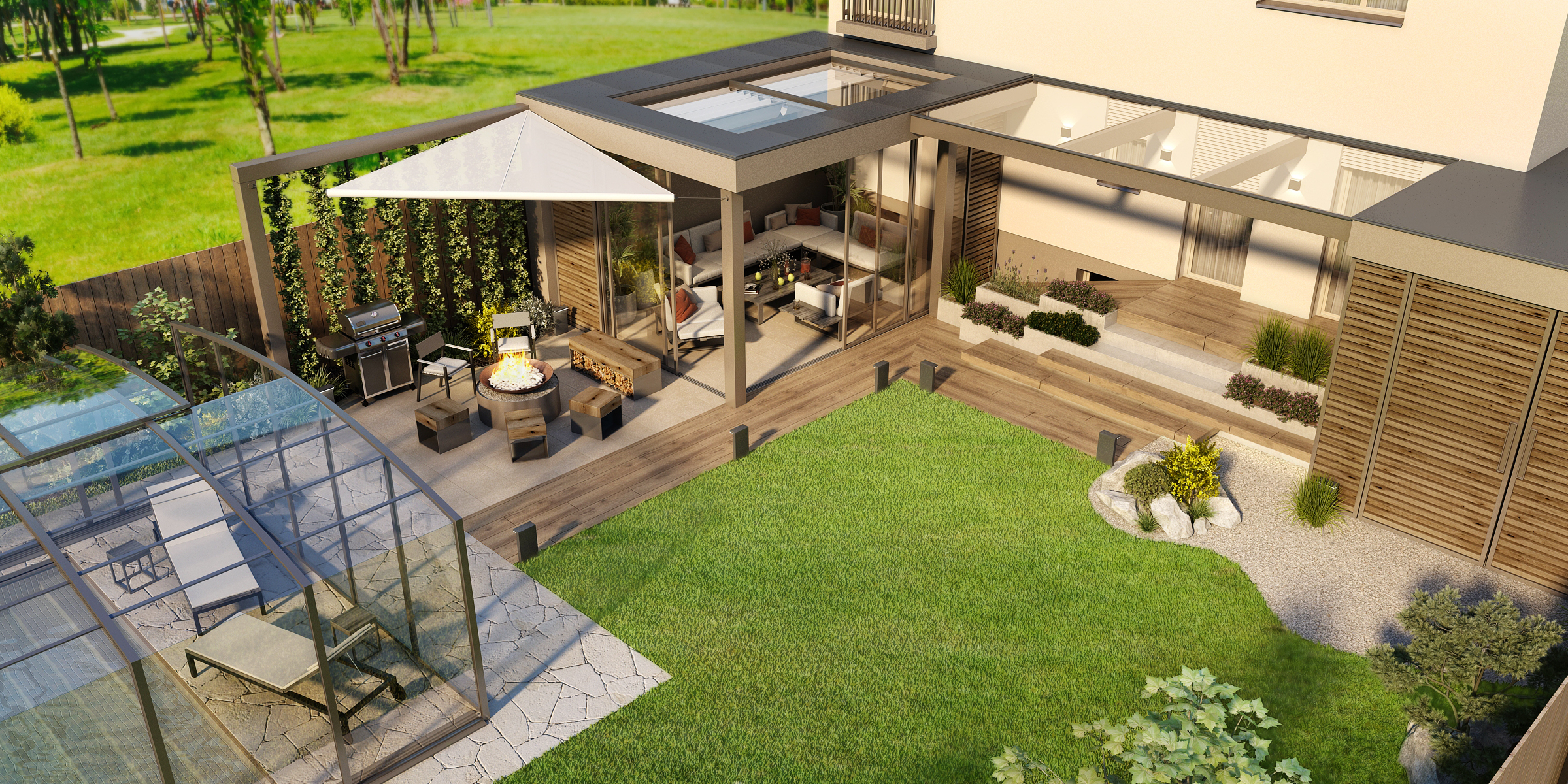 Prostorná terasa do tvaru L s přístřeškem poskytuje úkryt i v nepříznivém počasí. Prosklené posunovací dveře poskytují jak skvělý výhled na zahradu, tak i možnost průchodu k ohništi a grilu s posezením. Masivní lavice c kovovou podnoží nabízí úložný prostor ať už pro dřevo na zátop nebo jiné potřebné věci. Tato část je doplněna i o provizorní stěnu ze zeleně.