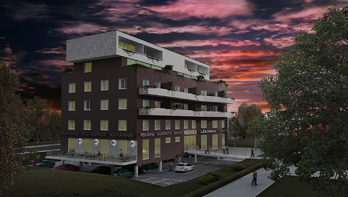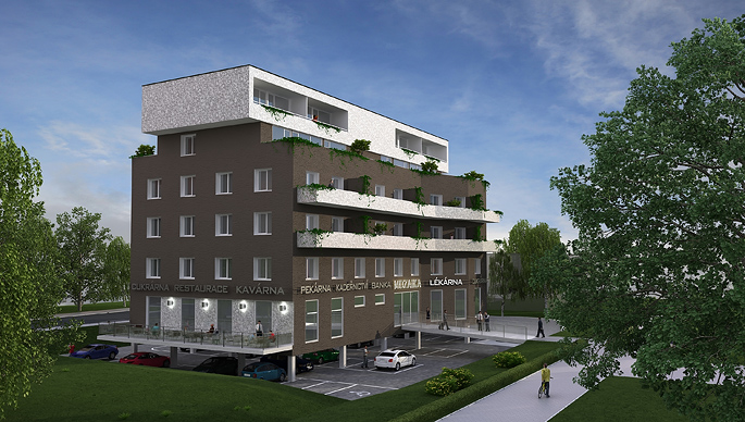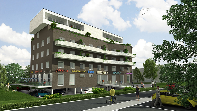 Polyfunkční dům Mozaika v Kuřimi. Ukázka architektonické vizualizace s detaily a osazením do prostředí.