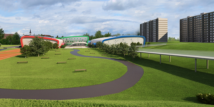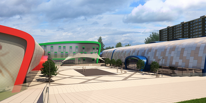 Studie multifunkčního sportovního areálu. Návrh zahrnuje 2 multifunkční sportvoní haly společne s hotelovou částí pro ubytování sportovců a návštěv a zabezpečení provozních potřeb komplexu. Díky terénním úpravám při stavbě vzniká prostor i pro venkovní sportovní vyžití např.tenisové kurty a futsalové hřiště. Vznikající park obkolesuje in-line dráha přístupná pro veřejnost. Celý komplex je propojen se stávajícími komunikacemi sustavou úrovňových lávek a chodníků.