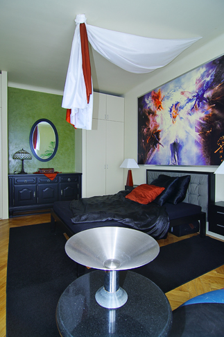 Dominantou pokoje je originální patrové spaní s bezpečnostní sítí, které slouží nejen k odpočinku, ale i ke hře. Přístup po schodech s úložnými prostory podporuje samostatnost dítěte a zároveň šetří místo.
