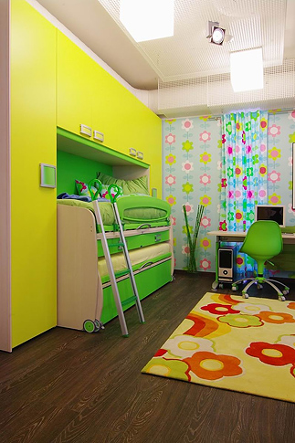 Dominantou pokoje je originální patrová postel připomínající lesní domeček mezi stromy, doplněná o síť proti pádu a žebřík v jemně zeleném odstínu. Kulaté zelené prvky na stropě evokují koruny stromů a společně s přírodními materiály vytvářejí pocit pohádkového lesa.