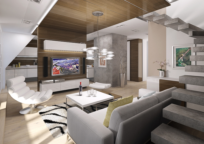 Moderně zařízený apartmán v minimalistickém duchu s dýhou wenge na nábytkových prvcích. Interiér působí lehce a umožňuje velmi pohodlné užívání. Betonová stěrka na schodech, stěnách a kuchyňské lince pak spojuje jednotlivé části apartmá. Ložnice je řešena opět v minimalistickém stlyu, okořeněného nádechem baroka. Chytrá kombinace stylů pak vytváří zajímavý celkový efekt. Design koupelny vychází z celkového konceptu apartmánu, pískovaná skleněná zástěna sprchového koutu pomáhá opticky rozdělit nepříznivou dispozici koupelny.