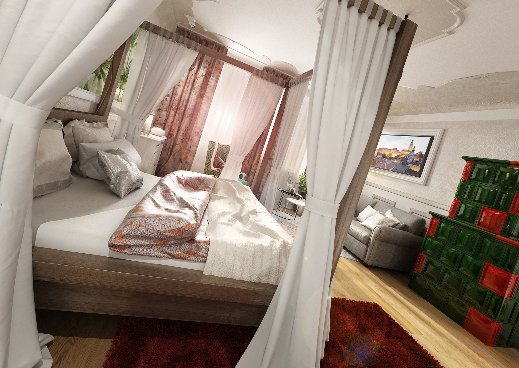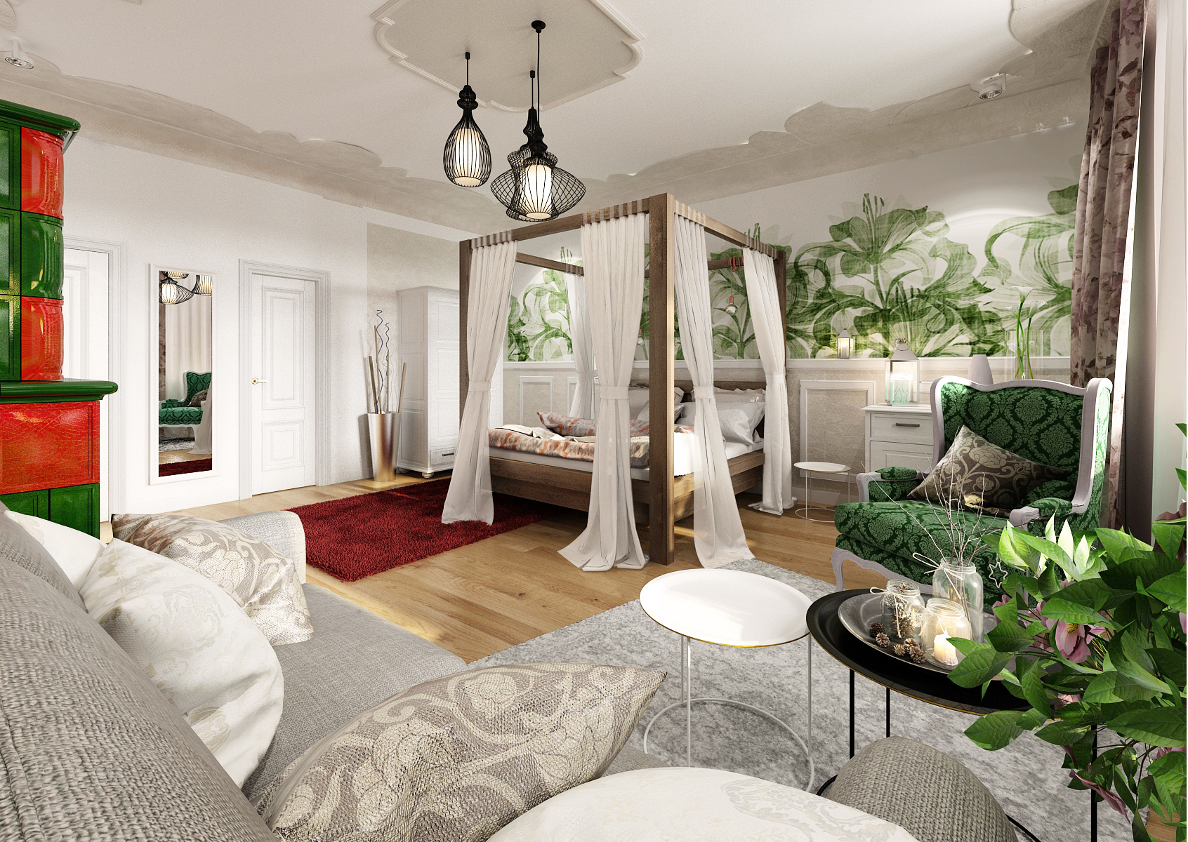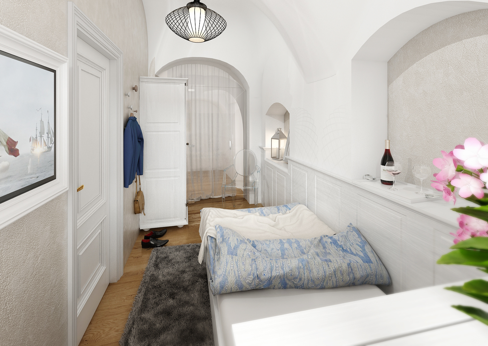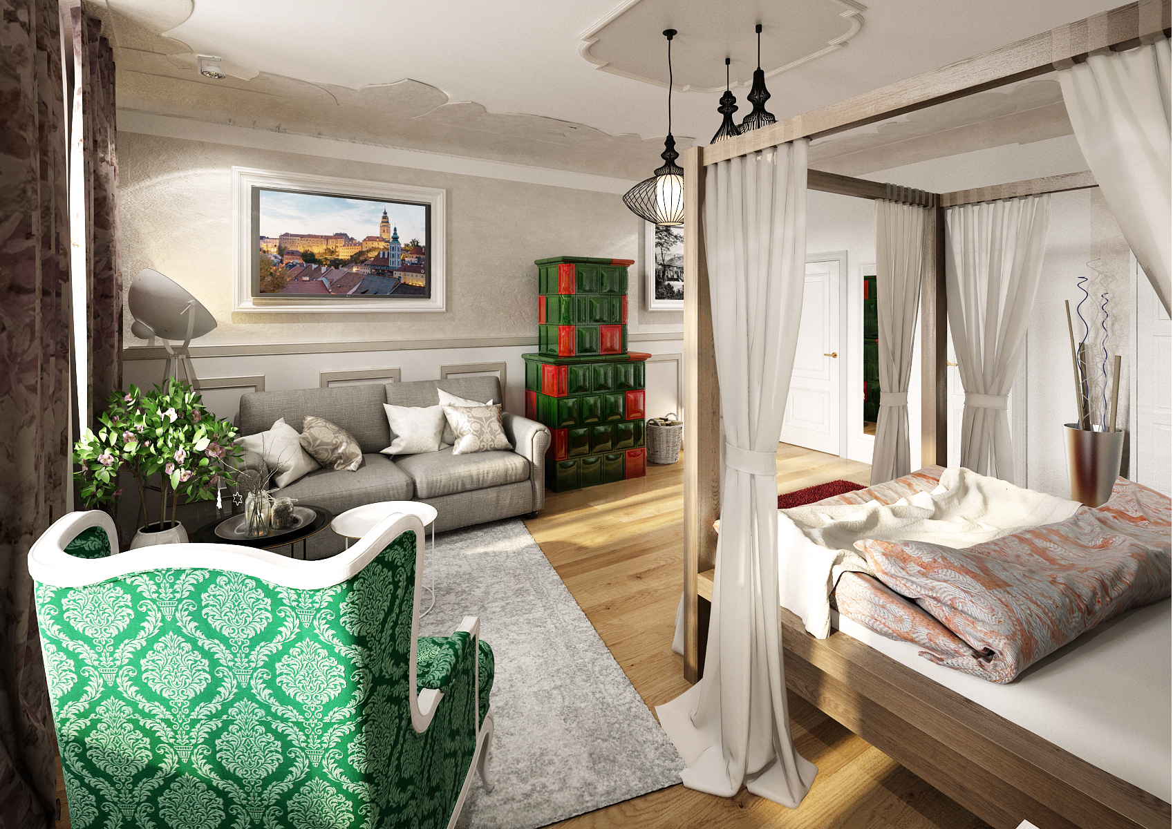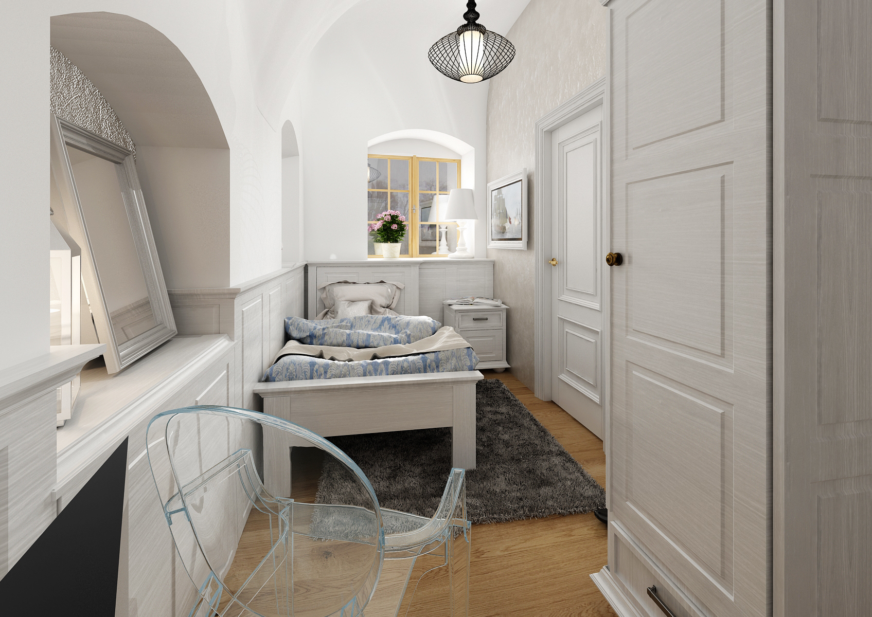 Renesanční dům s jistou historií stojící na náměstí, jehož klenbový zdobí malované erby, si přímo žádal o zařízení v romantickém duchu. Každý pokoj je laděn v jiném žánru, v odlišné barevné kombinaci a zpracování. Postele jsou zvoleny čalouněné i masivní, s nebesy i bez, nejsou podceněny ani úložné prostory, psací stolek či koutek pro posezení v křesle. Bytový textil a dekorace velice jemně dokreslují příjemnou atmosféru pro pohádkový relax.