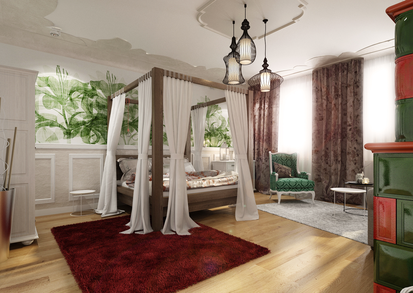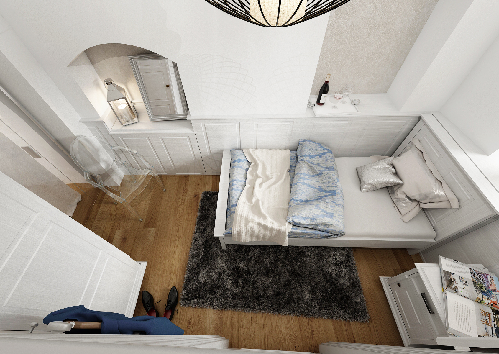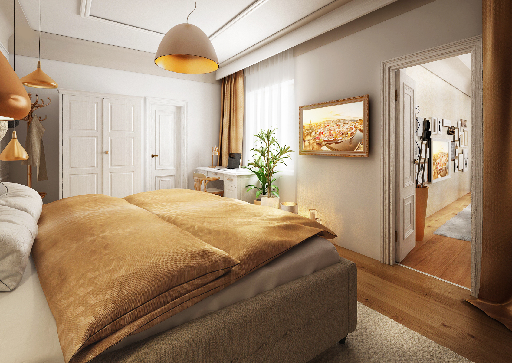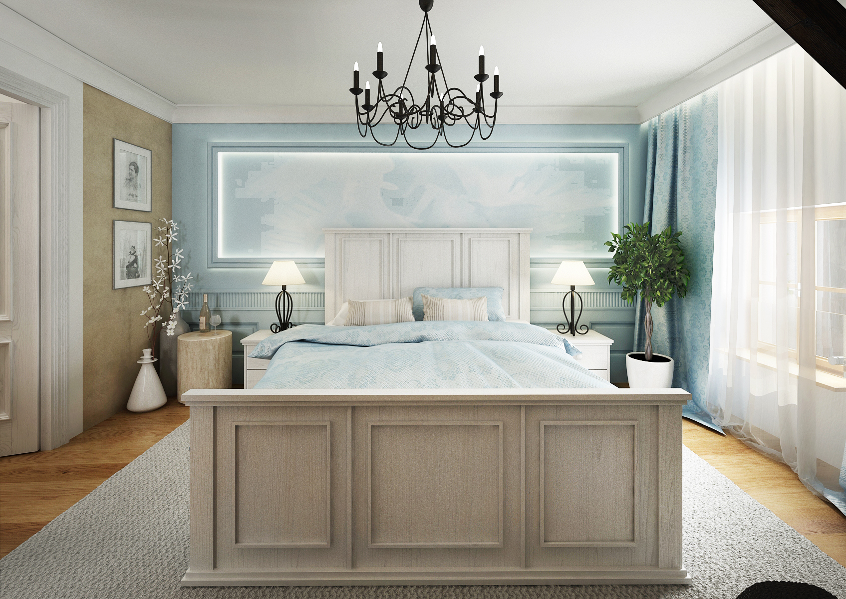 Renesanční dům s jistou historií stojící na náměstí, jehož klenbový zdobí malované erby, si přímo žádal o zařízení v romantickém duchu. Každý pokoj je laděn v jiném žánru, v odlišné barevné kombinaci a zpracování. Postele jsou zvoleny čalouněné i masivní, s nebesy i bez, nejsou podceněny ani úložné prostory, psací stolek či koutek pro posezení v křesle. Bytový textil a dekorace velice jemně dokreslují příjemnou atmosféru pro pohádkový relax.