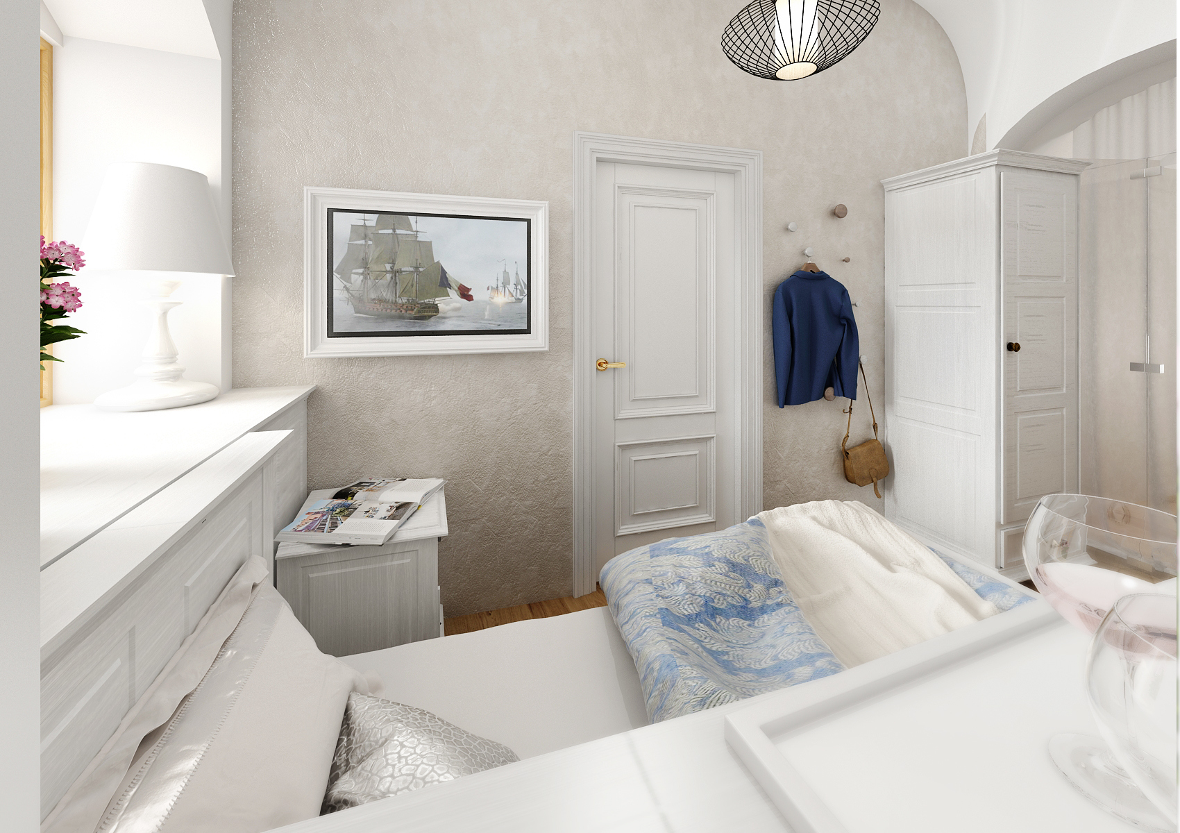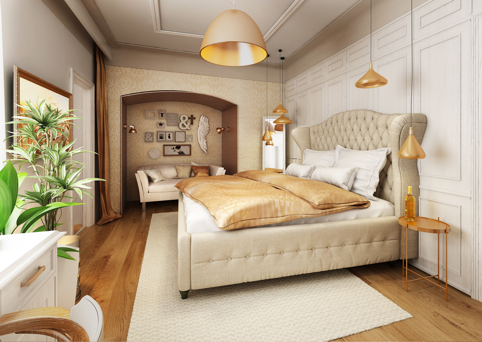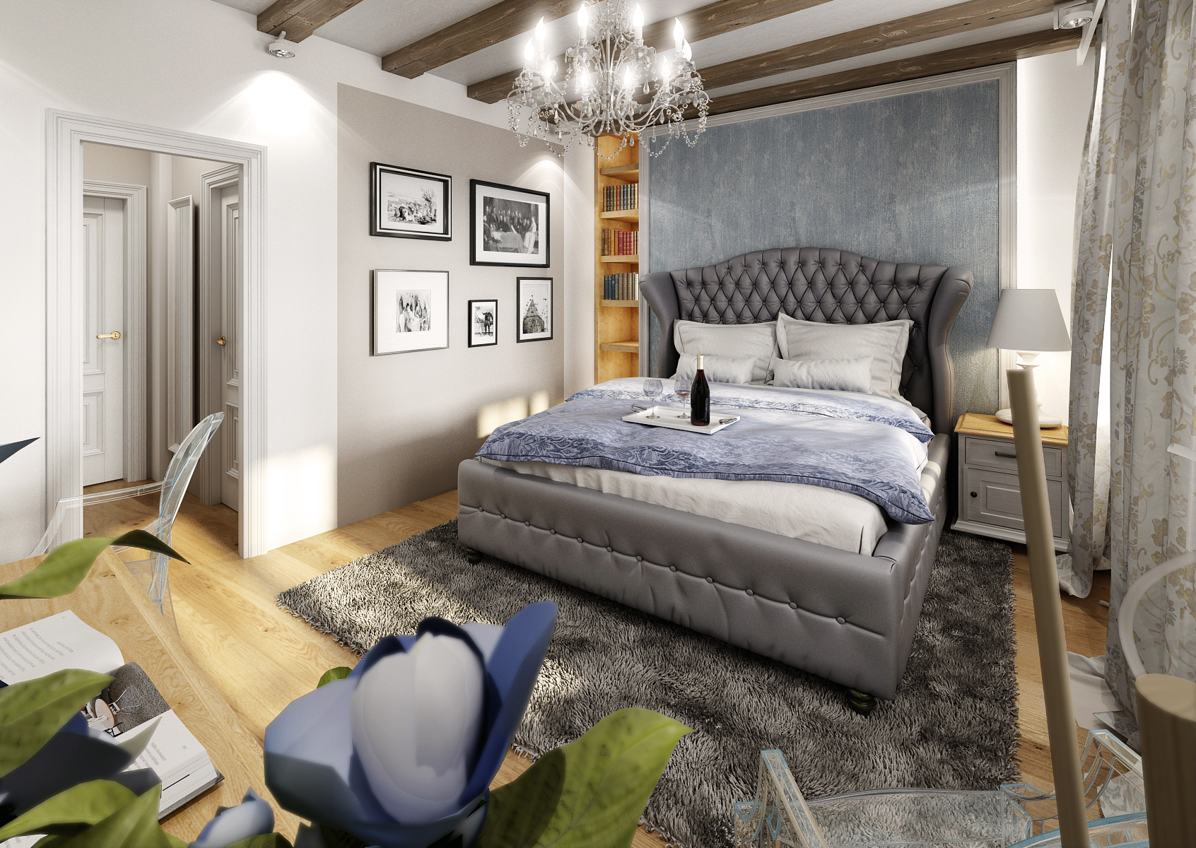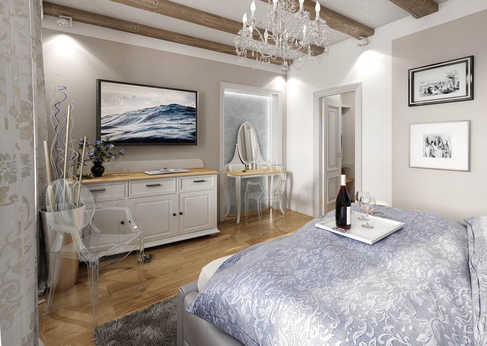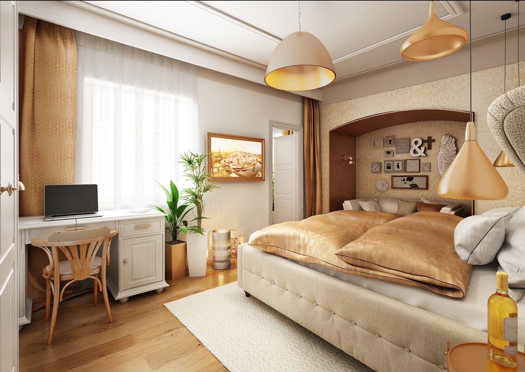 Renesanční dům s jistou historií stojící na náměstí, jehož klenbový zdobí malované erby, si přímo žádal o zařízení v romantickém duchu. Každý pokoj je laděn v jiném žánru, v odlišné barevné kombinaci a zpracování. Postele jsou zvoleny čalouněné i masivní, s nebesy i bez, nejsou podceněny ani úložné prostory, psací stolek či koutek pro posezení v křesle. Bytový textil a dekorace velice jemně dokreslují příjemnou atmosféru pro pohádkový relax.
