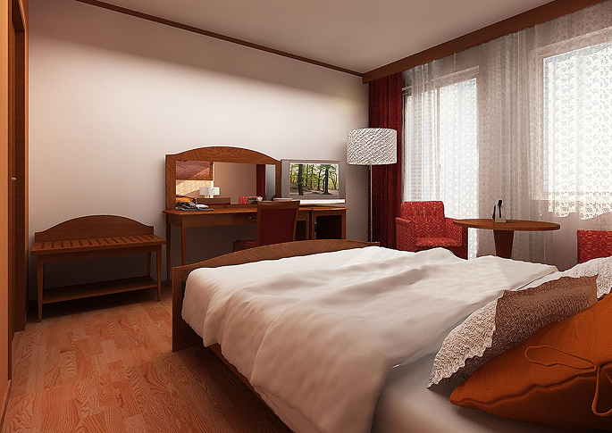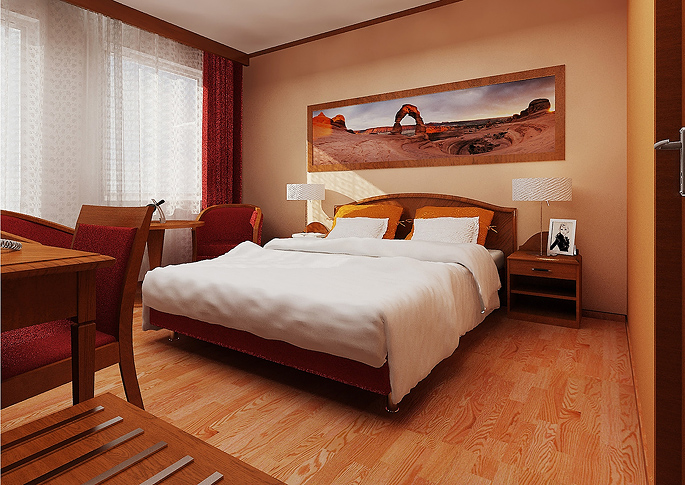 Hotelový pokoj je řešen v rustikálním stylu. Objevuje se zde kombinace bílé a béžové výmalby, tmavého dřeva cilhlové barvy a naoranžovělé podlahy. Prostor je zpestřen červenými a bílými doplňky.