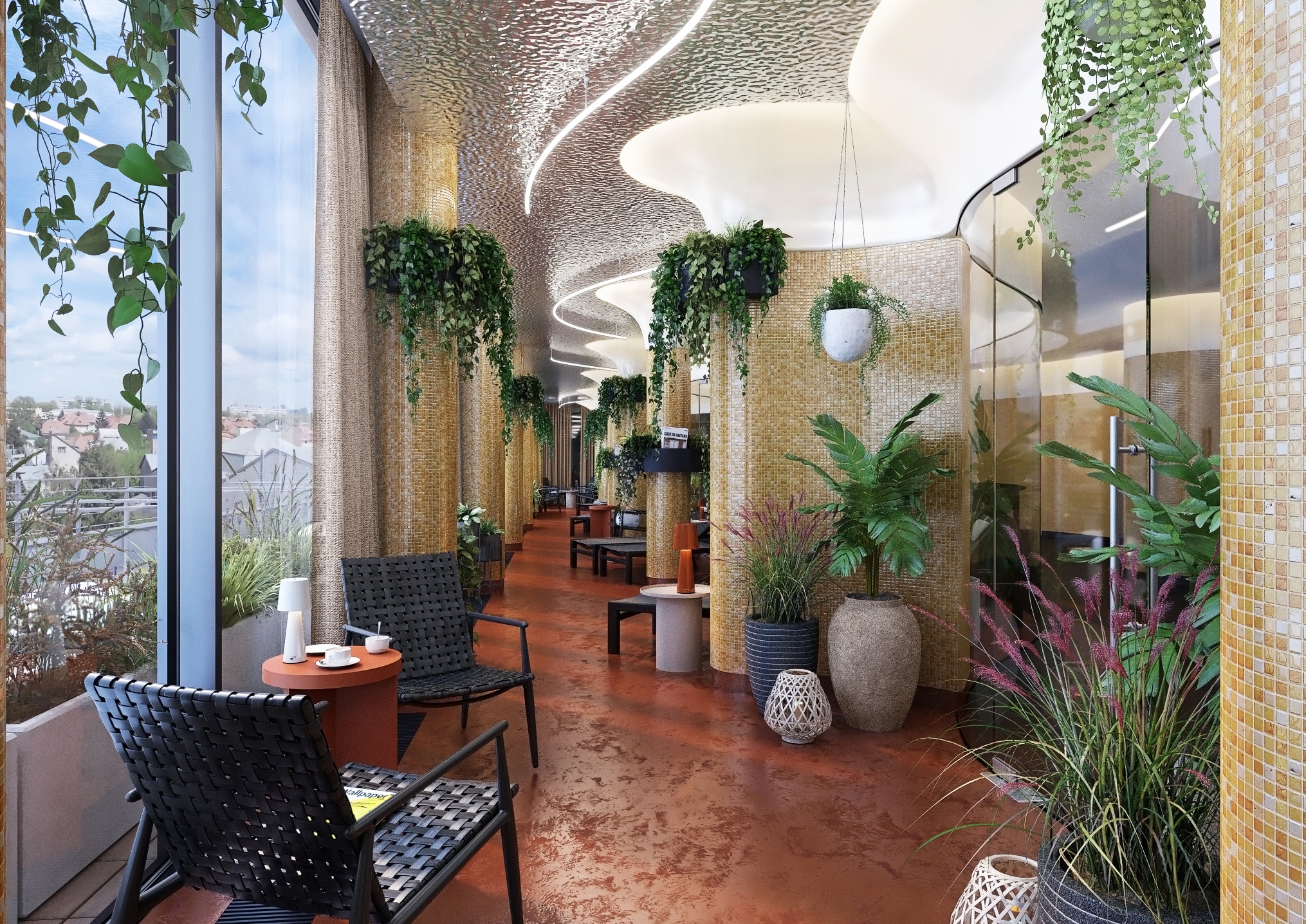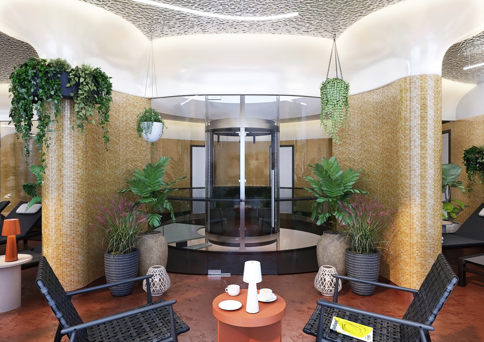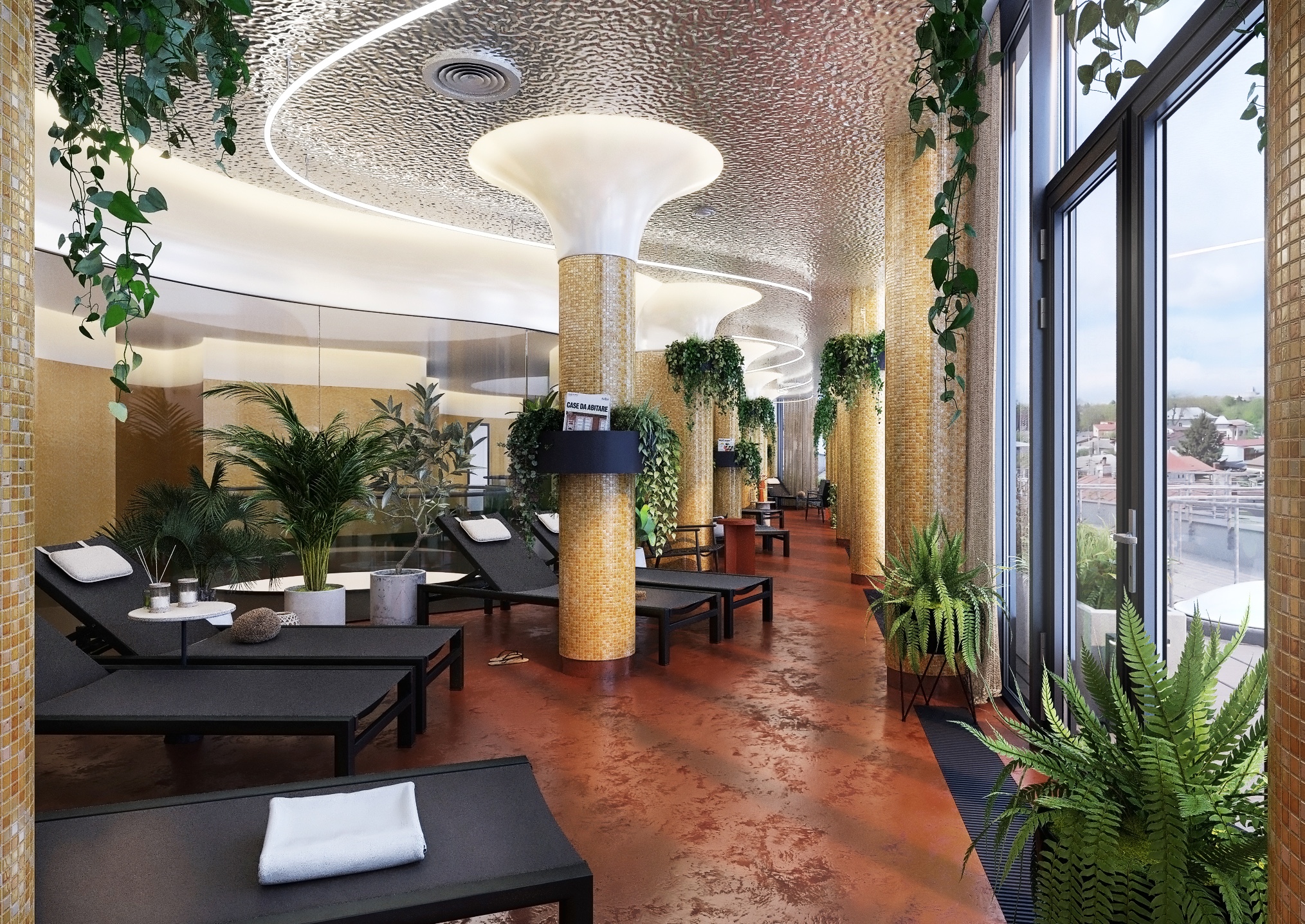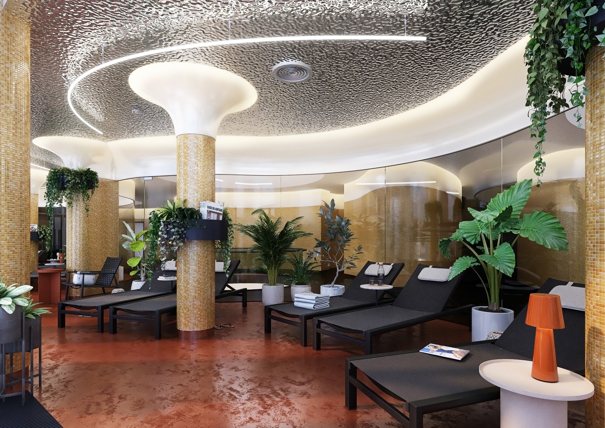 Stropní světelné prvky, které vytvářejí jemné křivky, spolu s lesklým povrchem stropu, dodávají prostoru futuristický nádech. Sloupy obložené mozaikovými dlaždicemi přinášejí do místnosti texturu a barevný kontrast, zatímco pohodlná lehátka rozmístěná po celém prostoru zvou k relaxaci. Živé rostliny, umístěné strategicky kolem celého interiéru, přidávají přírodní prvek a zajišťují uklidňující atmosféru.