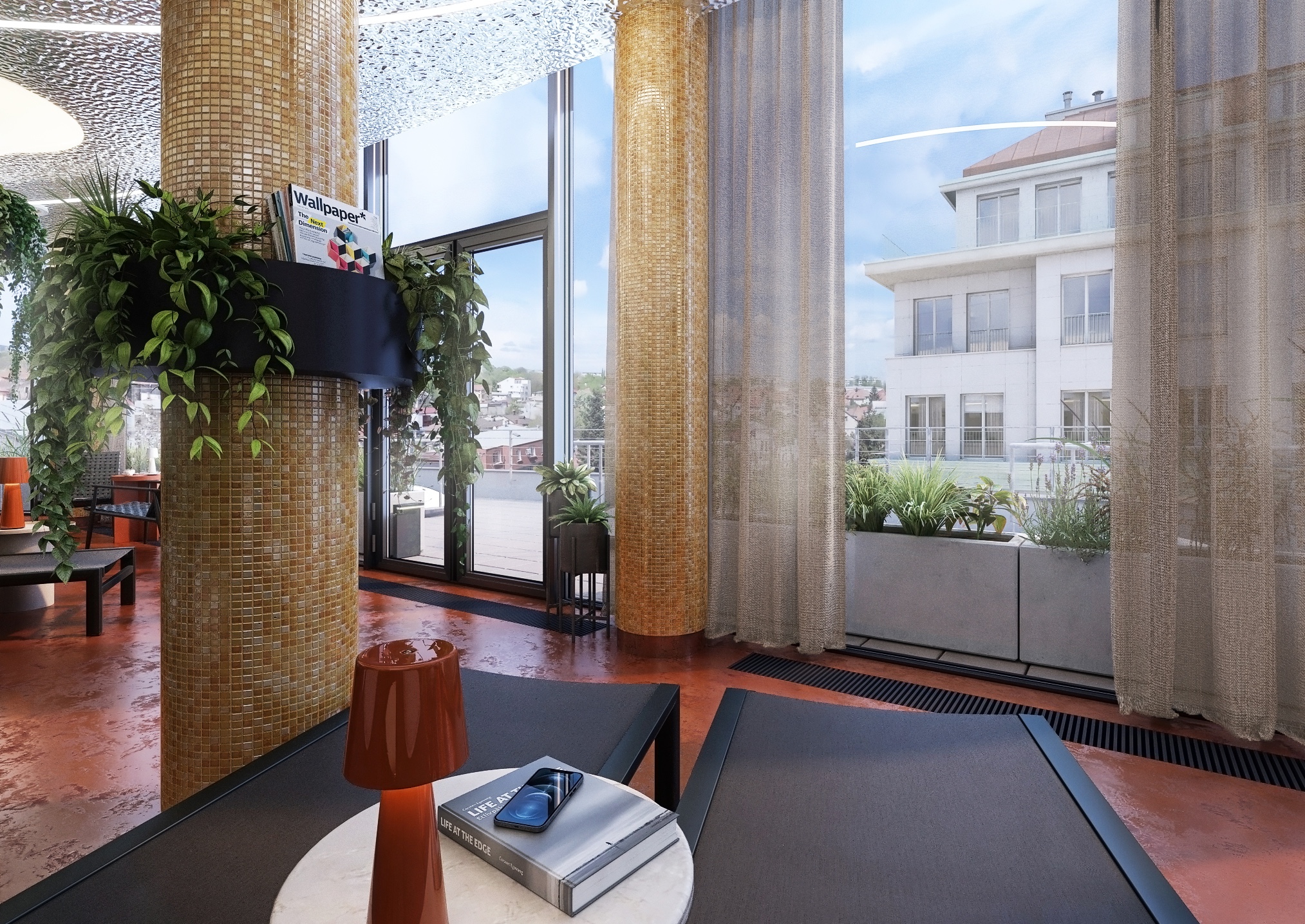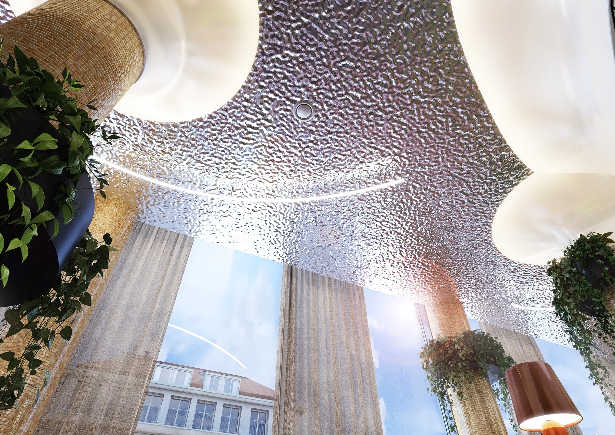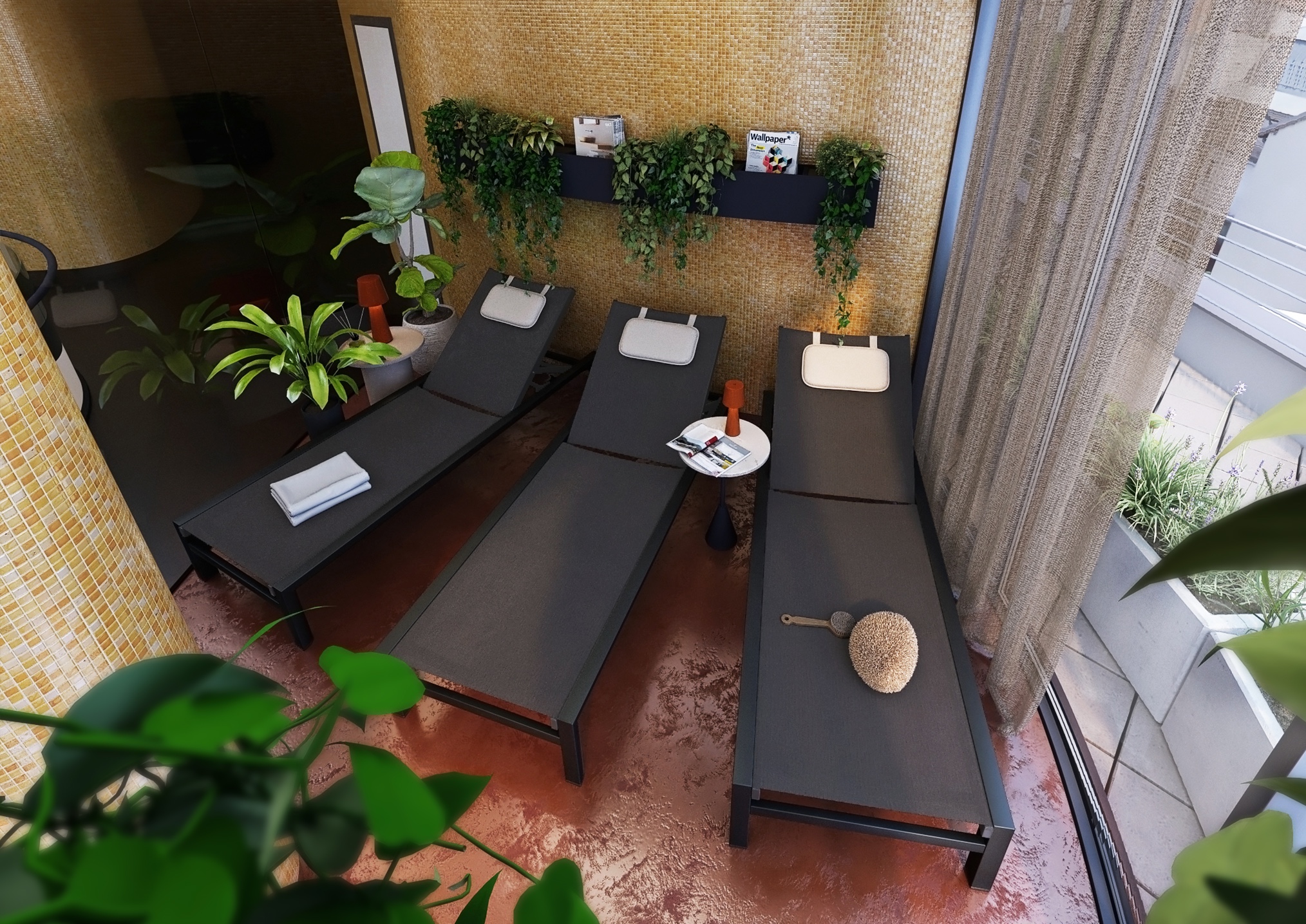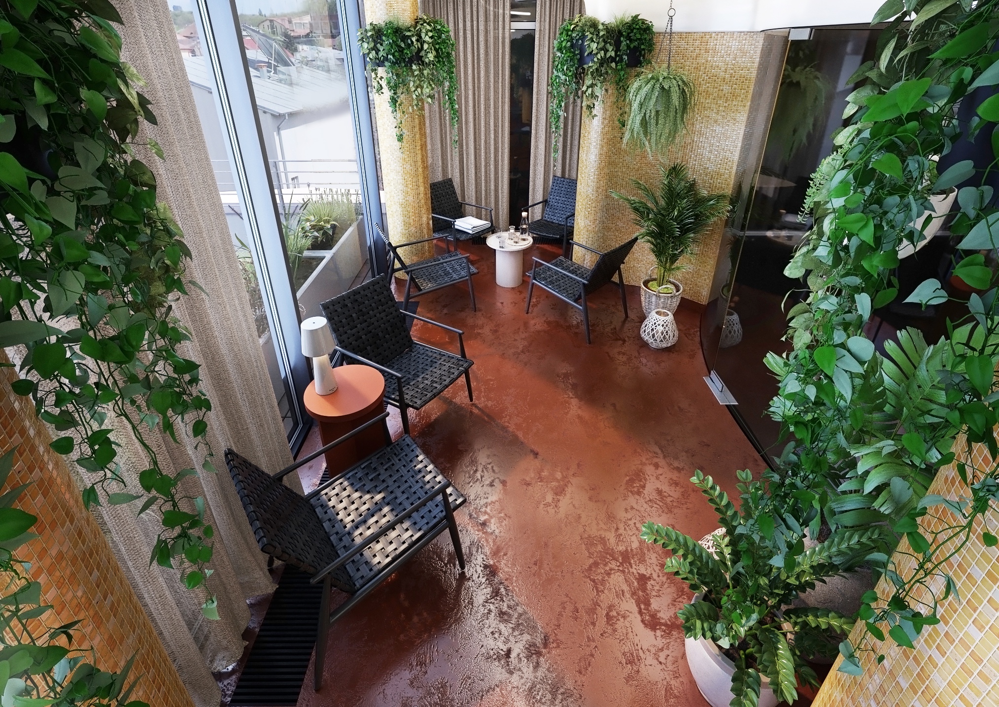 Stropní světelné prvky, které vytvářejí jemné křivky, spolu s lesklým povrchem stropu, dodávají prostoru futuristický nádech. Sloupy obložené mozaikovými dlaždicemi přinášejí do místnosti texturu a barevný kontrast, zatímco pohodlná lehátka rozmístěná po celém prostoru zvou k relaxaci. Živé rostliny, umístěné strategicky kolem celého interiéru, přidávají přírodní prvek a zajišťují uklidňující atmosféru.