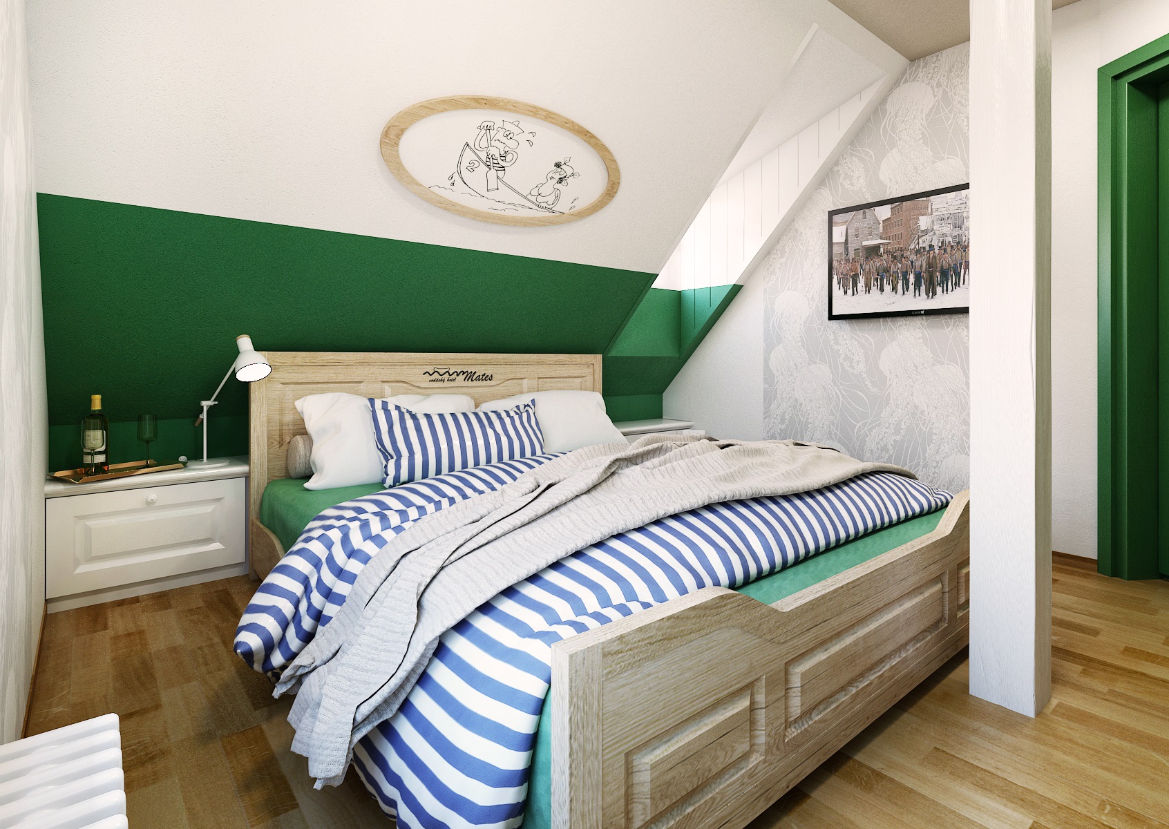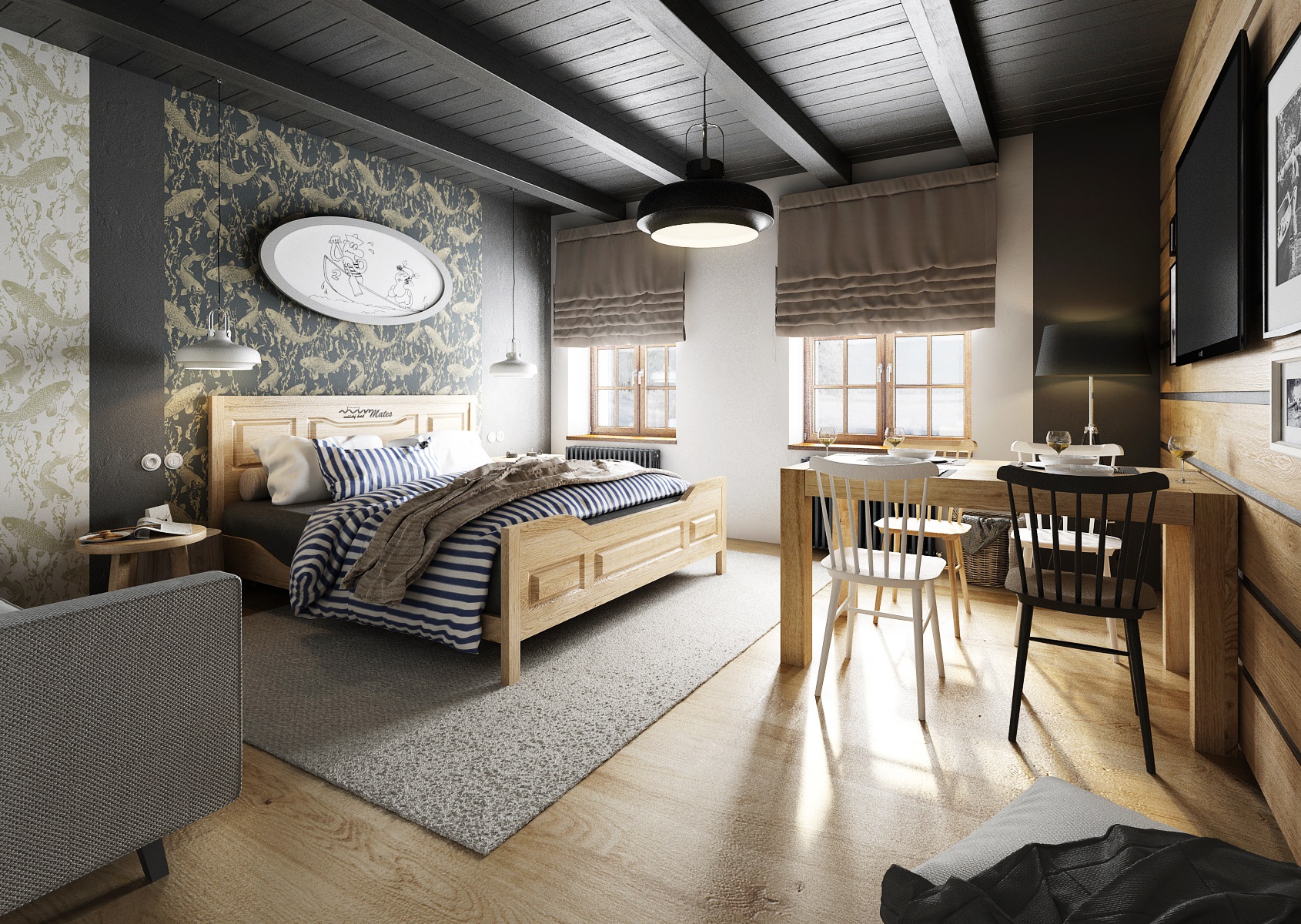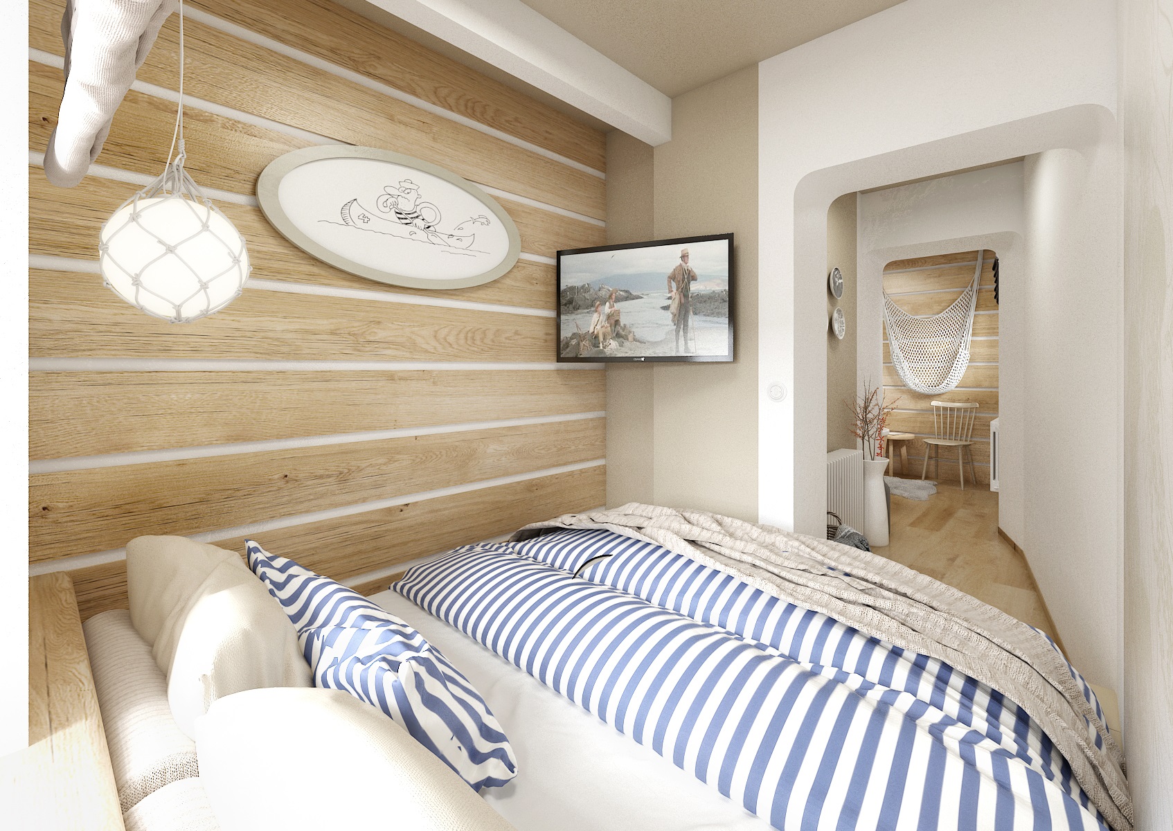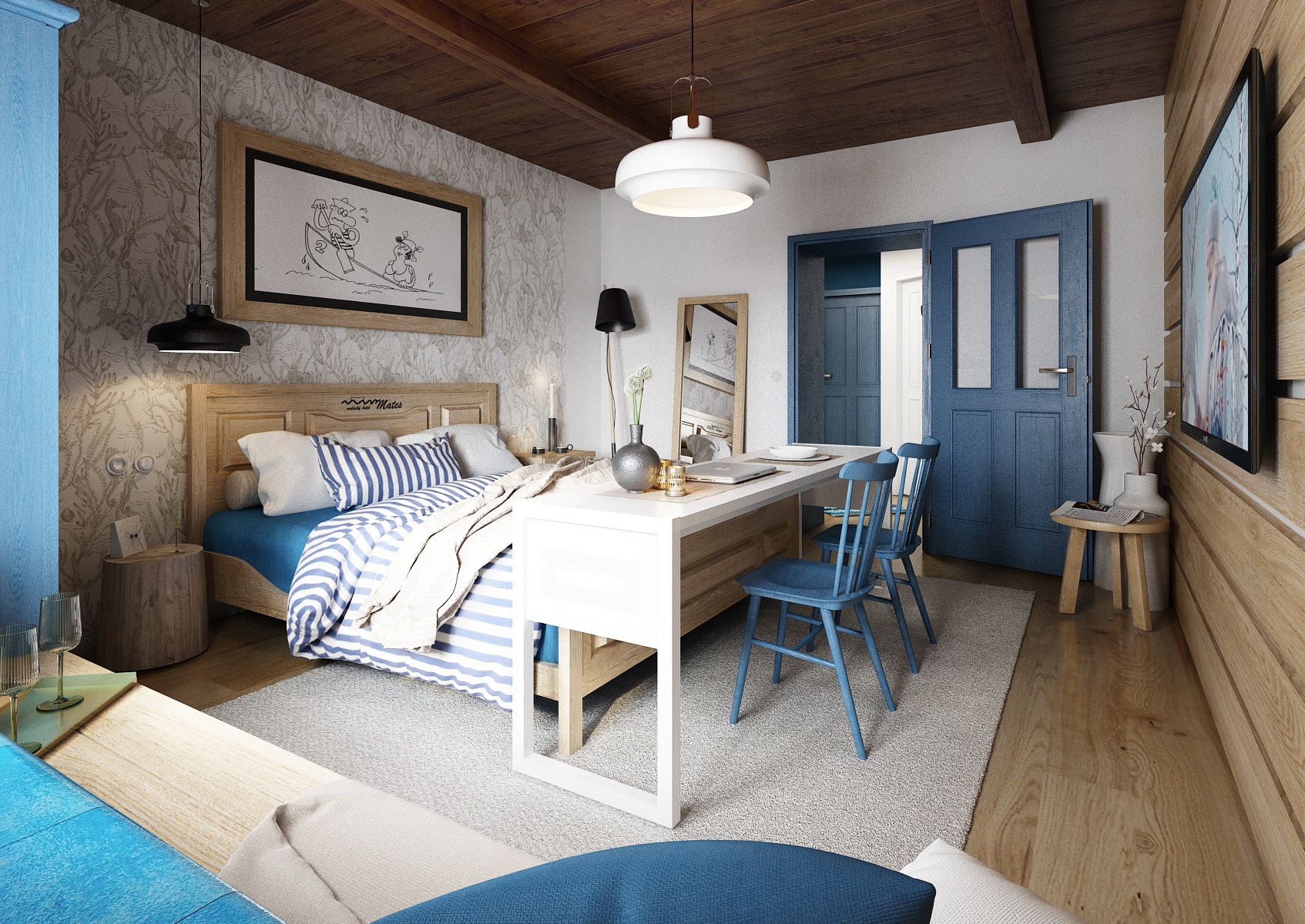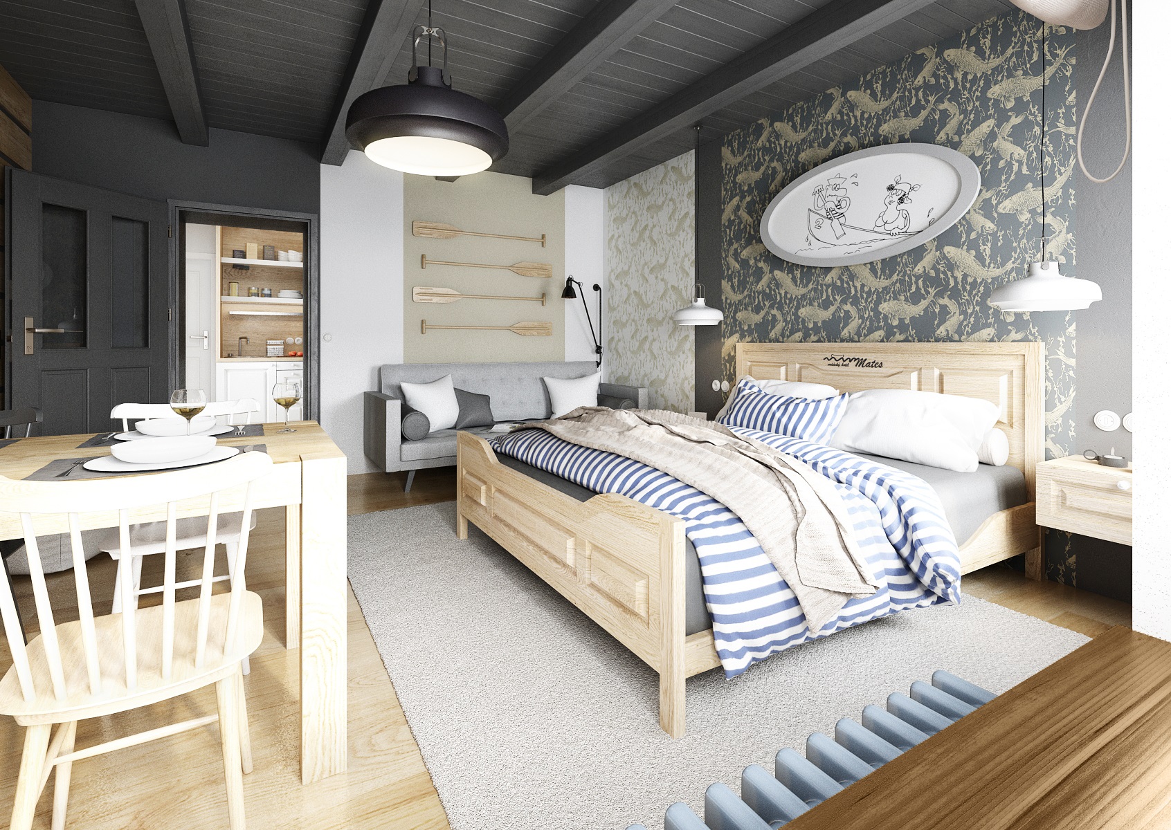 vodácká tématika. Jednotlivé pokoje jsou vždy koncipovány do určité barevnosti. Venkovský masivní nábytek je kombinován s TOM židlemi Ironica, nástěnné obložení z přírodního dubu doplňuje barevnou výmalbou a tapety. Některých pokojích jsou postele koncipovány jako "poležení na peci". Nechybí ani stylové vodácko-rybářské dekorace, v podobě pádel, sítí, dřevěného vědra nebo originálního svítidla v síti.