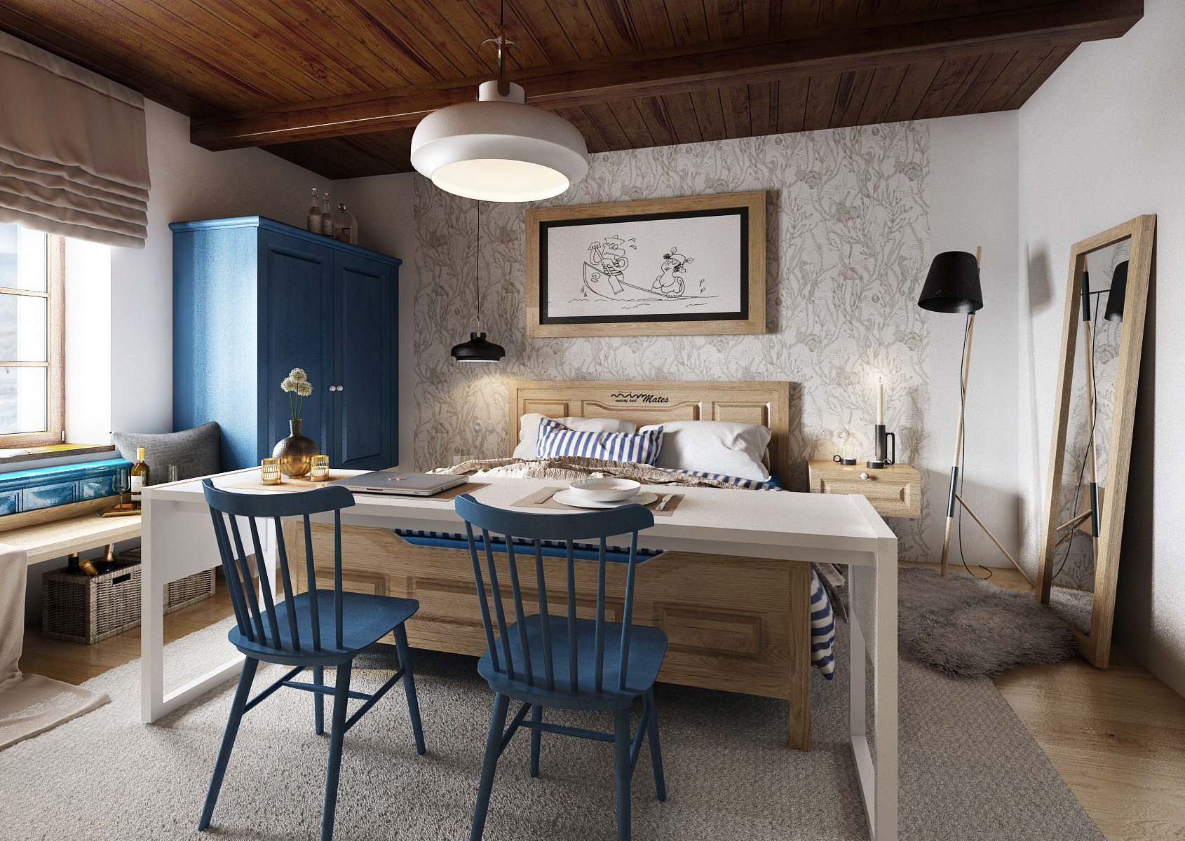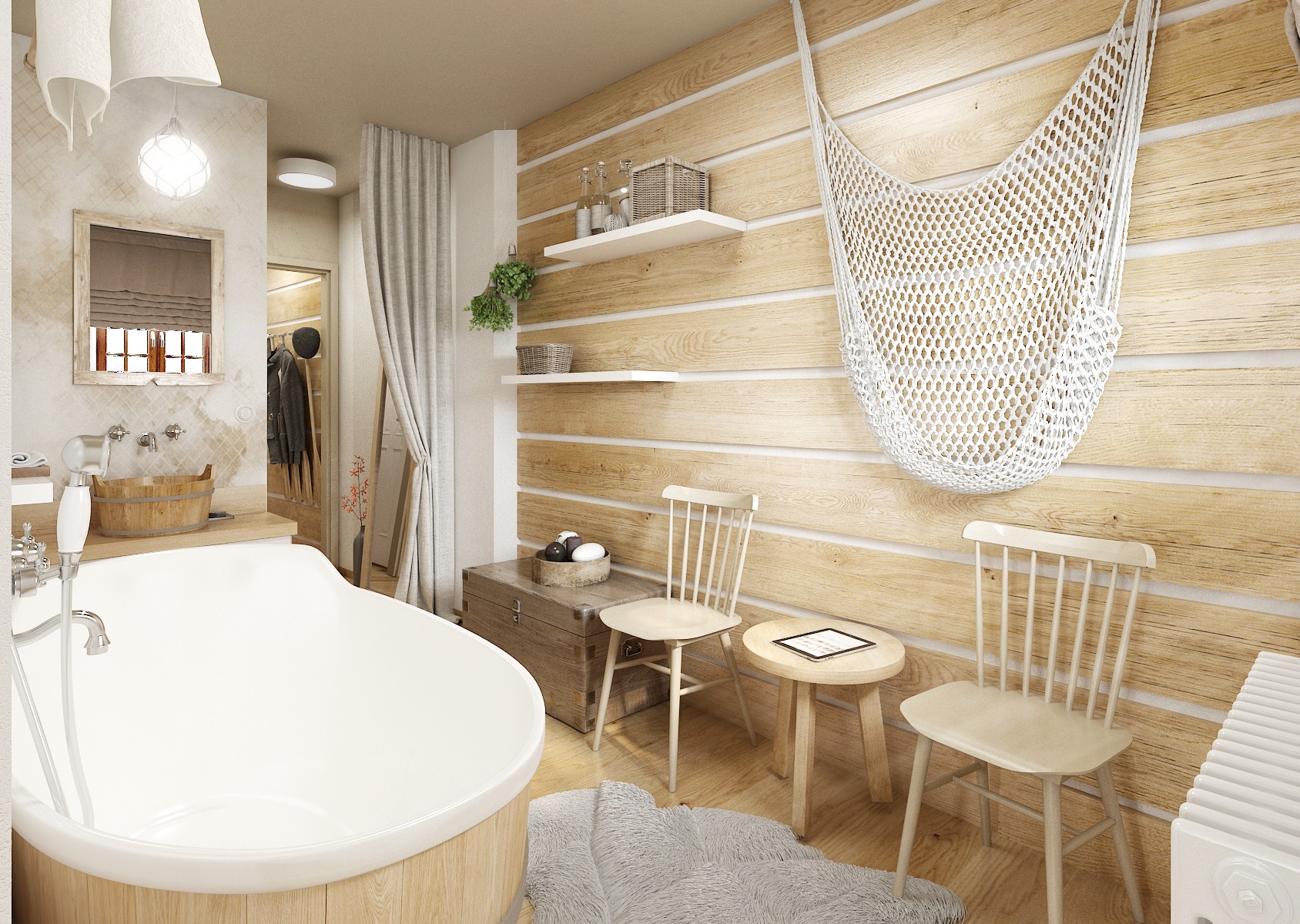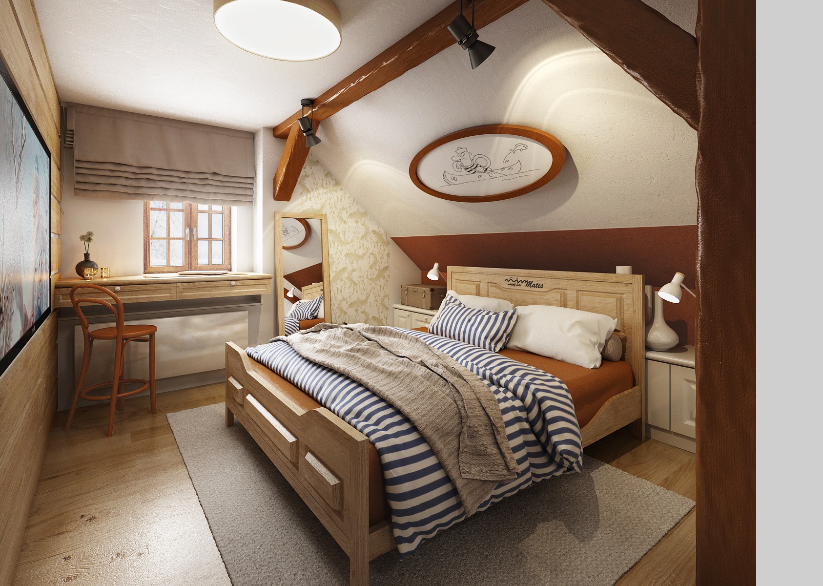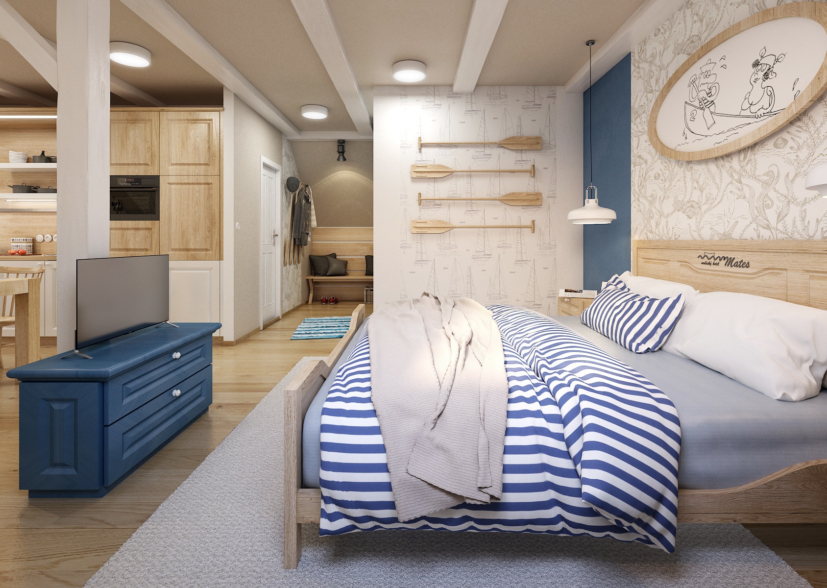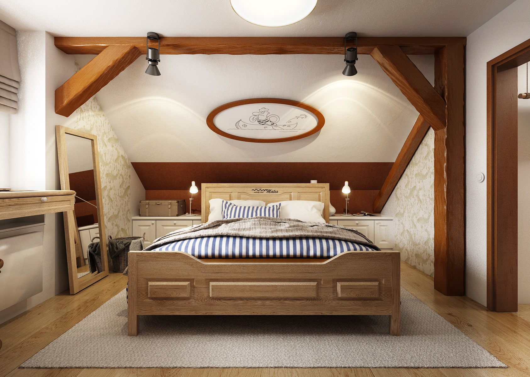 vodácká tématika. Jednotlivé pokoje jsou vždy koncipovány do určité barevnosti. Venkovský masivní nábytek je kombinován s TOM židlemi Ironica, nástěnné obložení z přírodního dubu doplňuje barevnou výmalbou a tapety. Některých pokojích jsou postele koncipovány jako "poležení na peci". Nechybí ani stylové vodácko-rybářské dekorace, v podobě pádel, sítí, dřevěného vědra nebo originálního svítidla v síti.