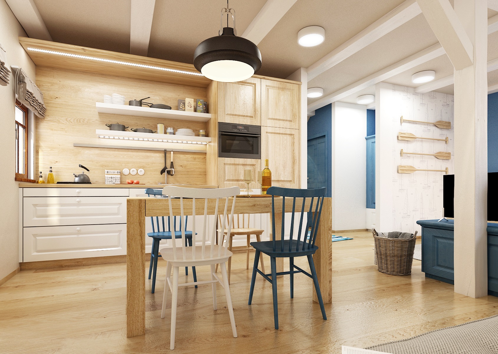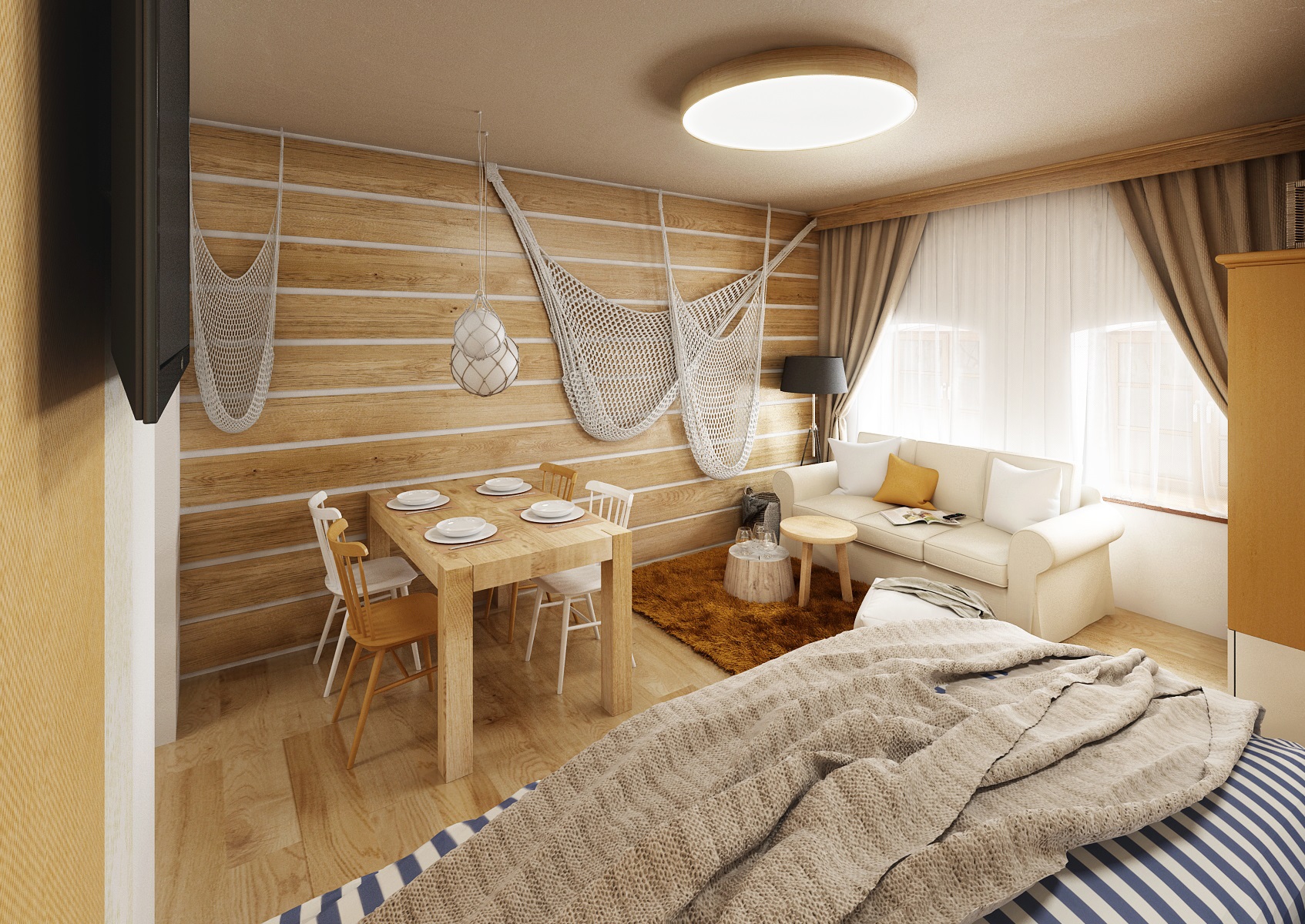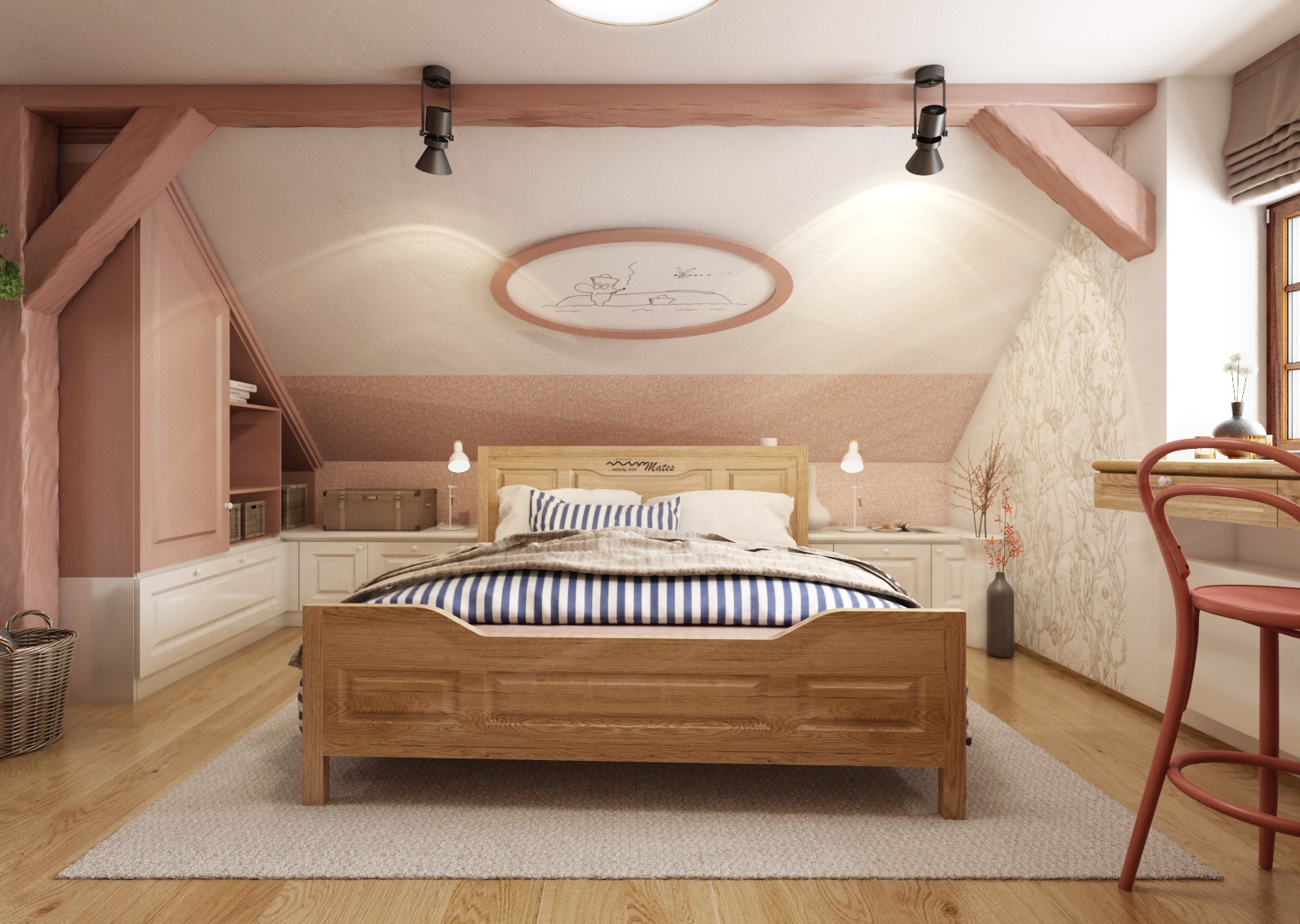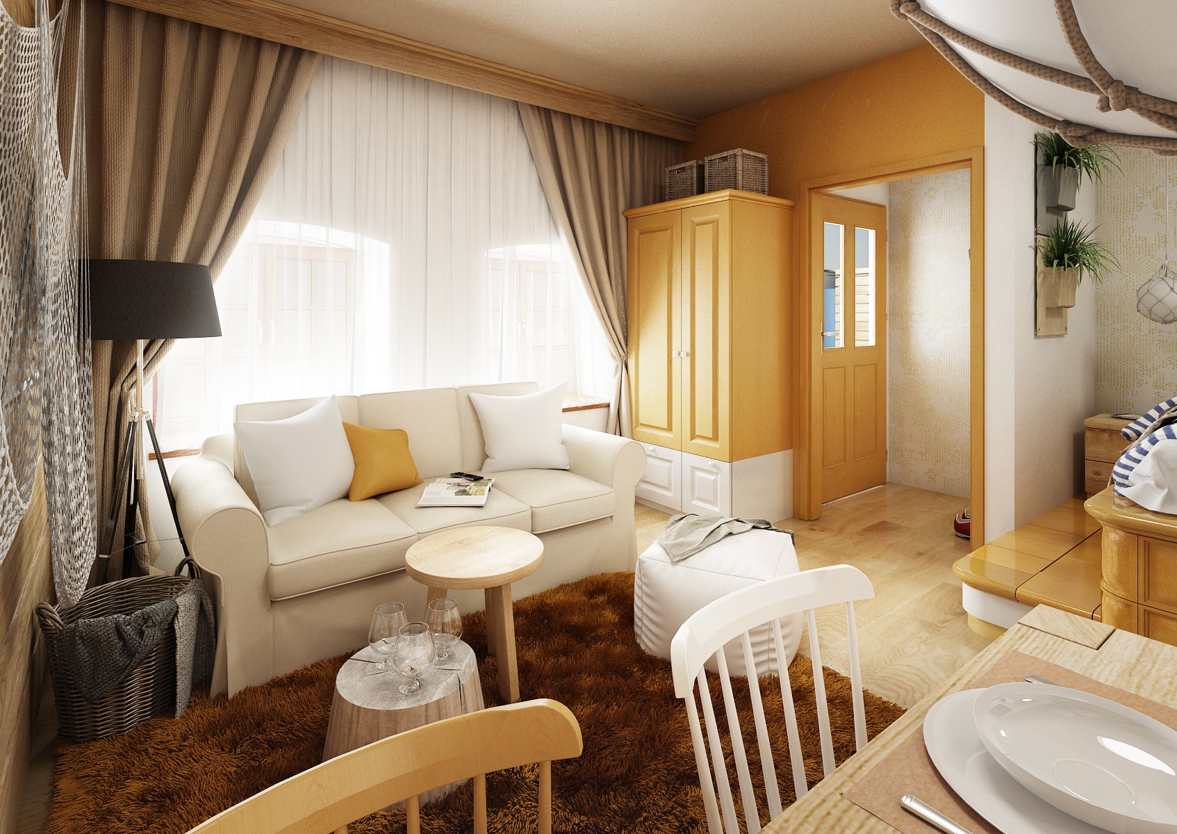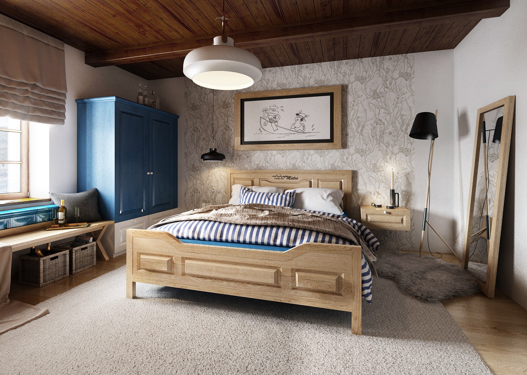 vodácká tématika. Jednotlivé pokoje jsou vždy koncipovány do určité barevnosti. Venkovský masivní nábytek je kombinován s TOM židlemi Ironica, nástěnné obložení z přírodního dubu doplňuje barevnou výmalbou a tapety. Některých pokojích jsou postele koncipovány jako "poležení na peci". Nechybí ani stylové vodácko-rybářské dekorace, v podobě pádel, sítí, dřevěného vědra nebo originálního svítidla v síti.