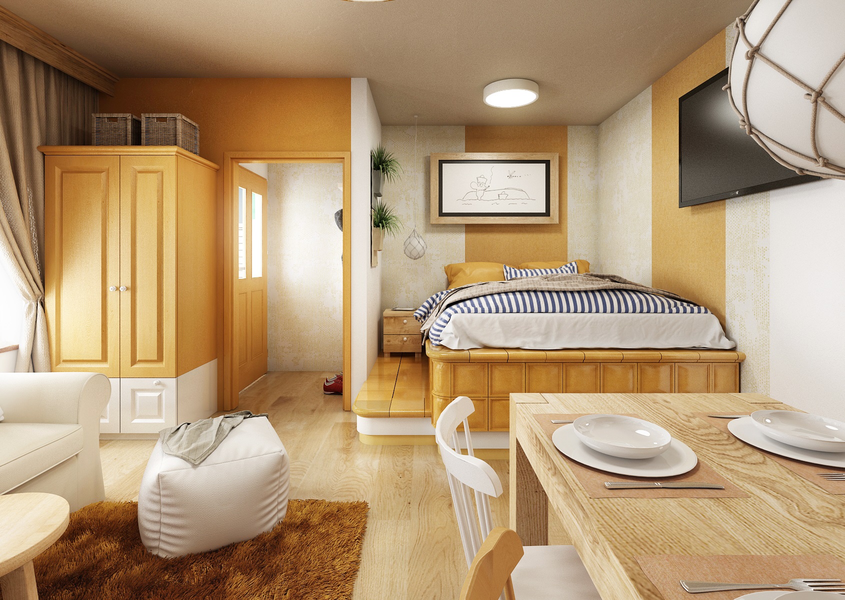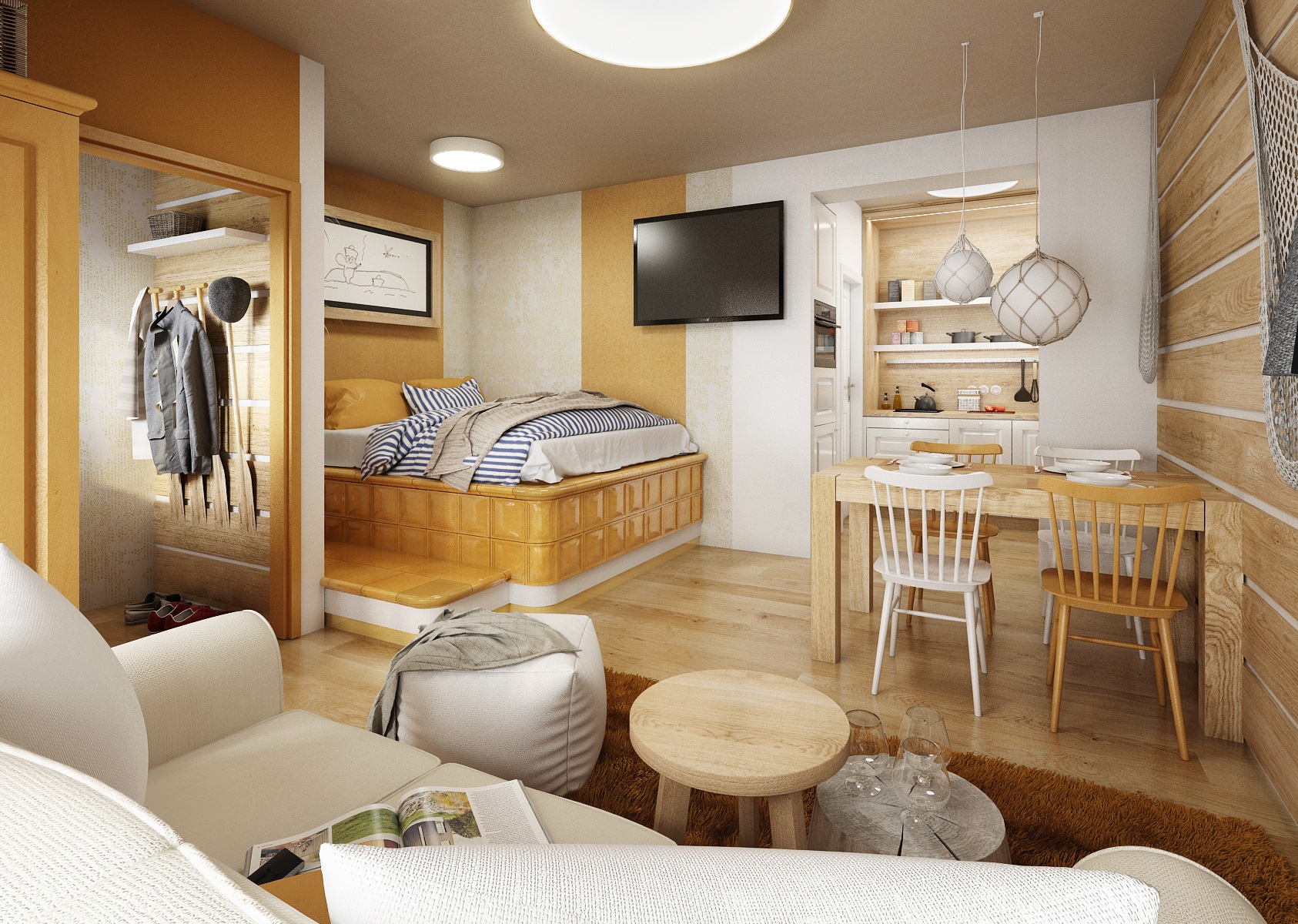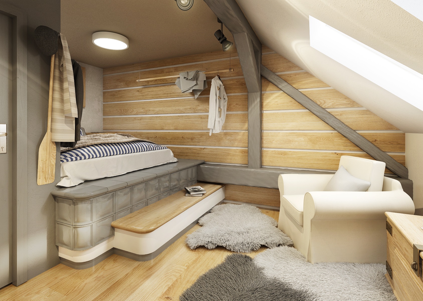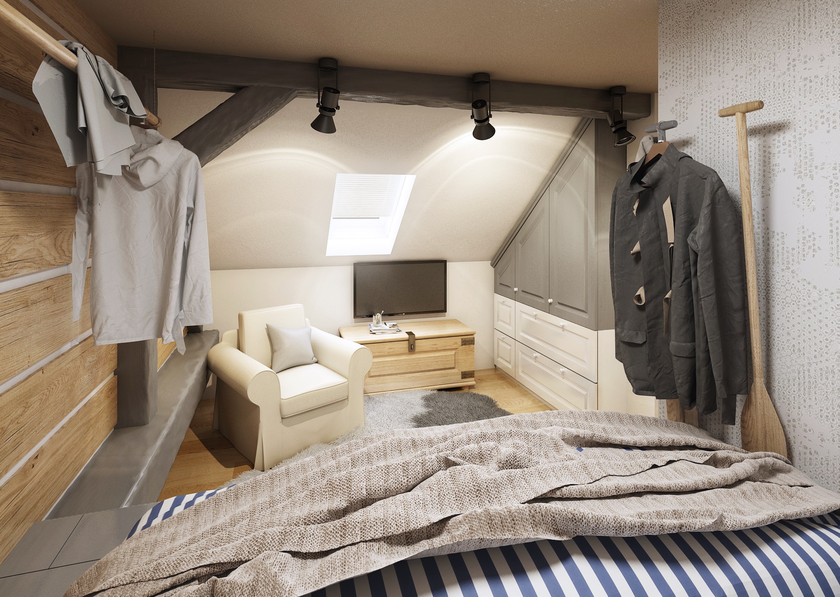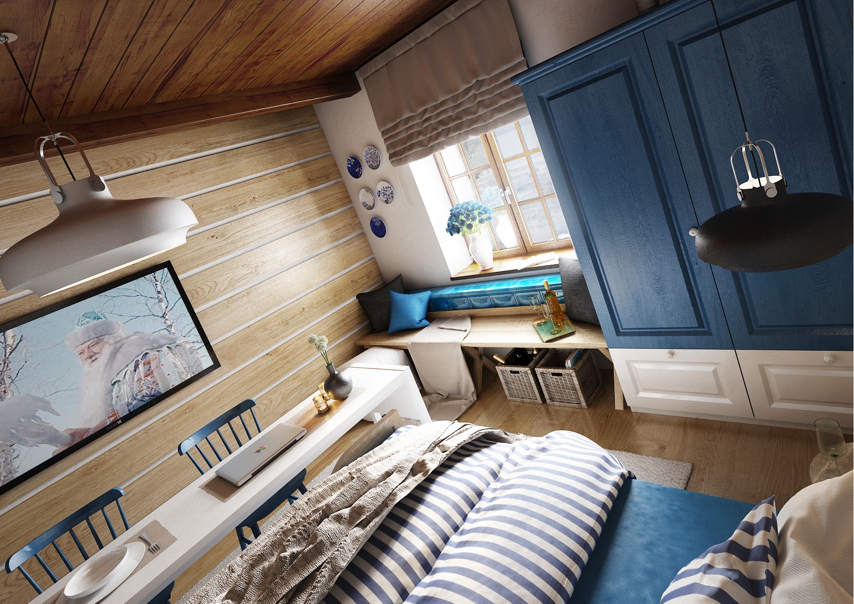 vodácká tématika. Jednotlivé pokoje jsou vždy koncipovány do určité barevnosti. Venkovský masivní nábytek je kombinován s TOM židlemi Ironica, nástěnné obložení z přírodního dubu doplňuje barevnou výmalbou a tapety. Některých pokojích jsou postele koncipovány jako "poležení na peci". Nechybí ani stylové vodácko-rybářské dekorace, v podobě pádel, sítí, dřevěného vědra nebo originálního svítidla v síti.