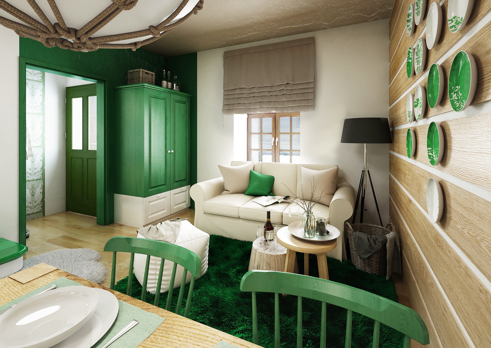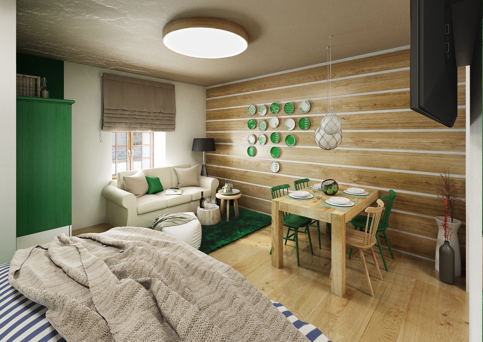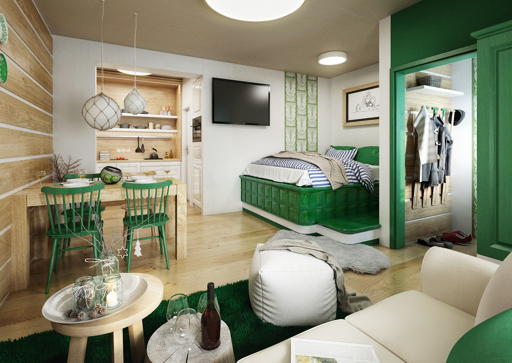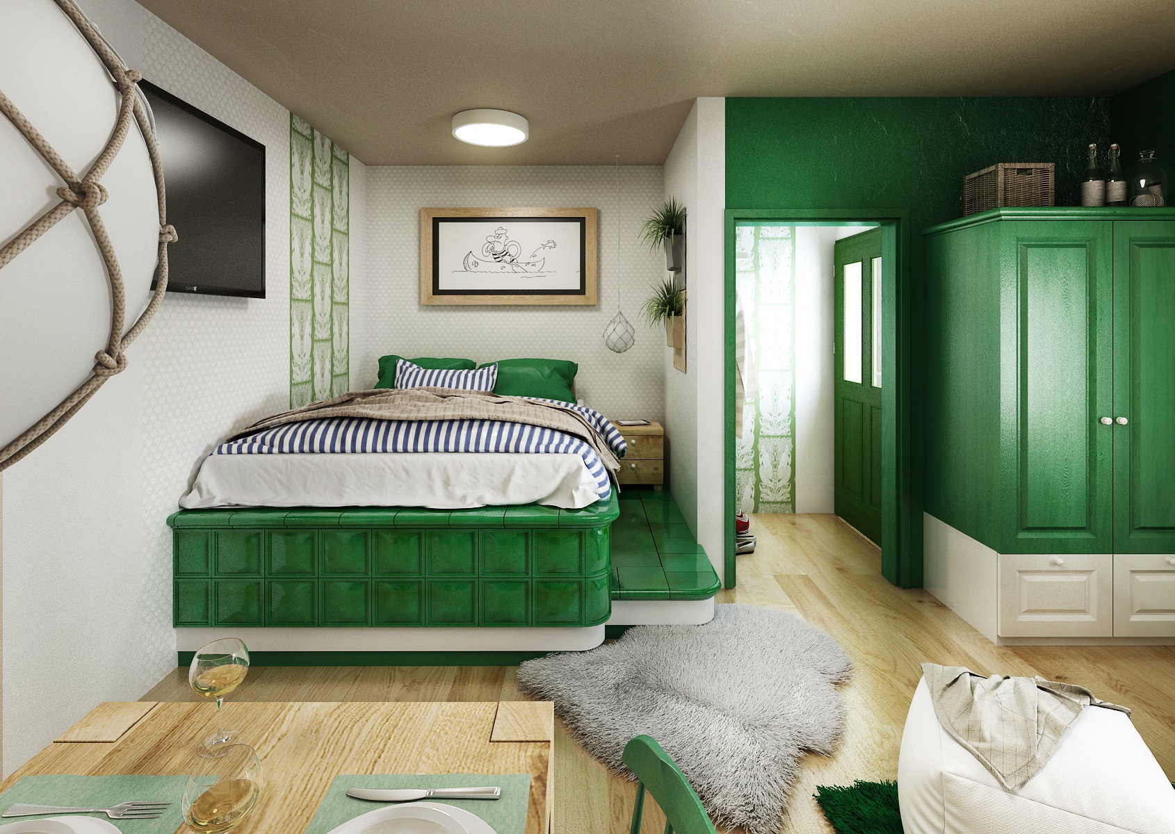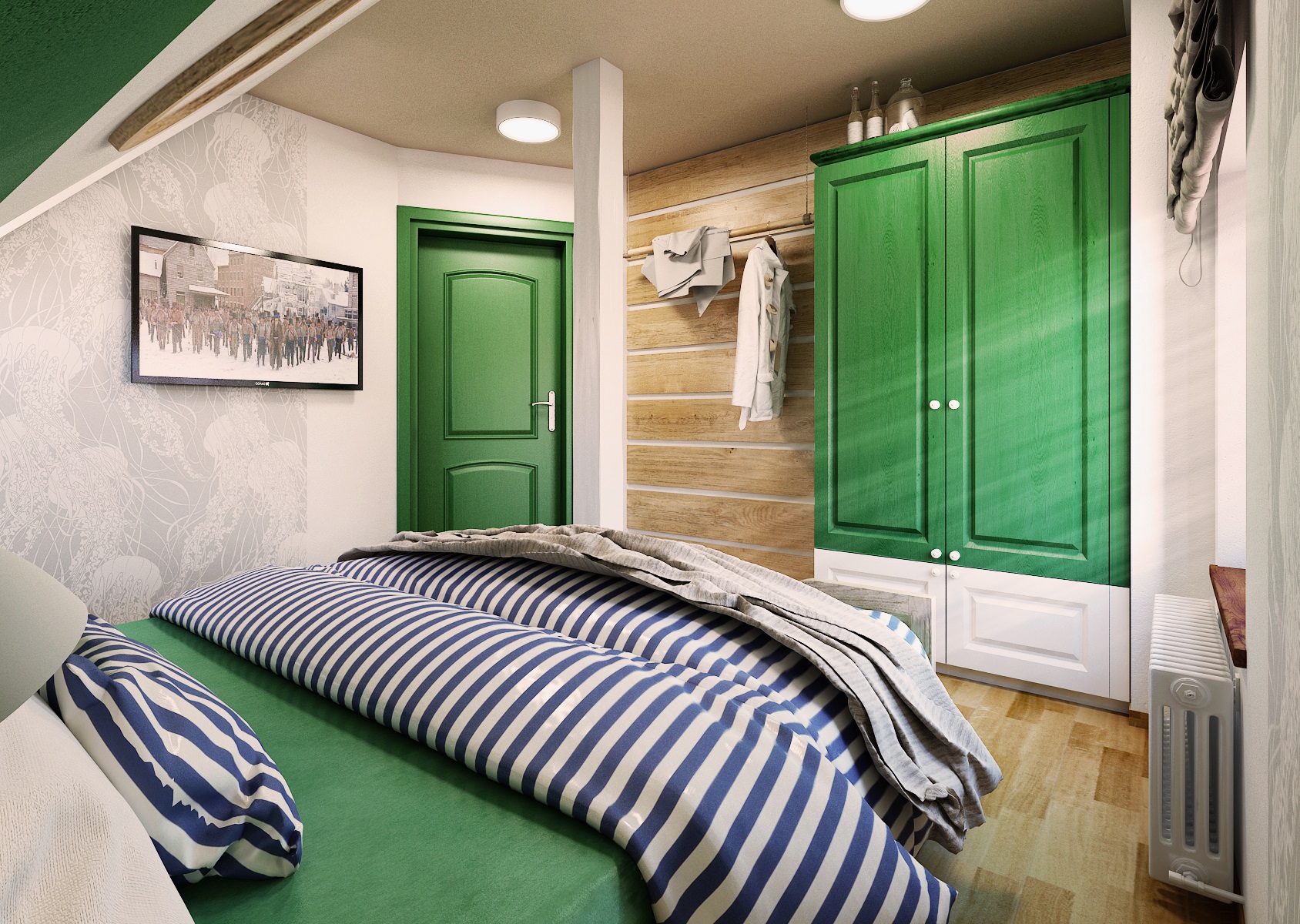 vodácká tématika. Jednotlivé pokoje jsou vždy koncipovány do určité barevnosti. Venkovský masivní nábytek je kombinován s TOM židlemi Ironica, nástěnné obložení z přírodního dubu doplňuje barevnou výmalbou a tapety. Některých pokojích jsou postele koncipovány jako "poležení na peci". Nechybí ani stylové vodácko-rybářské dekorace, v podobě pádel, sítí, dřevěného vědra nebo originálního svítidla v síti.