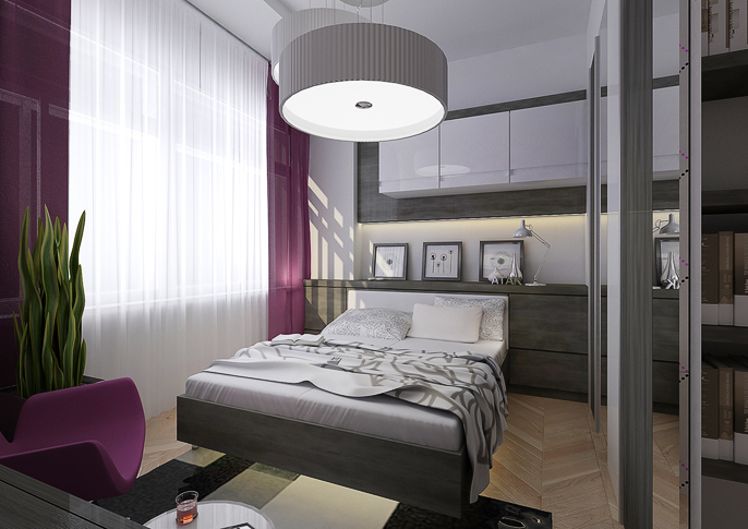 Hotelový pokoj je laděn do světlých barev. Naleznete zde kombinaci bíélé a šedivé. Prostor je zpestřen o fialové doplňky a tmavě šedohnědý nábytek. Zrcadlová dvířka na skříni místnost opticky zvětšují. Zajímavým prvkem je světlá tapeta s vzorem, která působí elegntně v kombinai s podsvícenou stěnou za komodu.