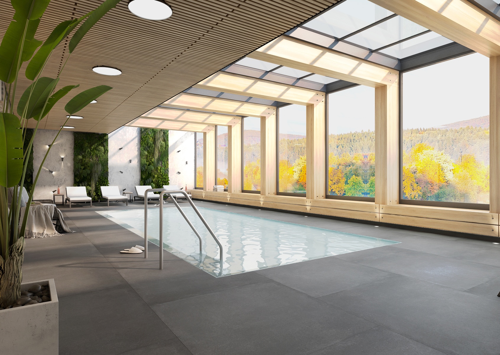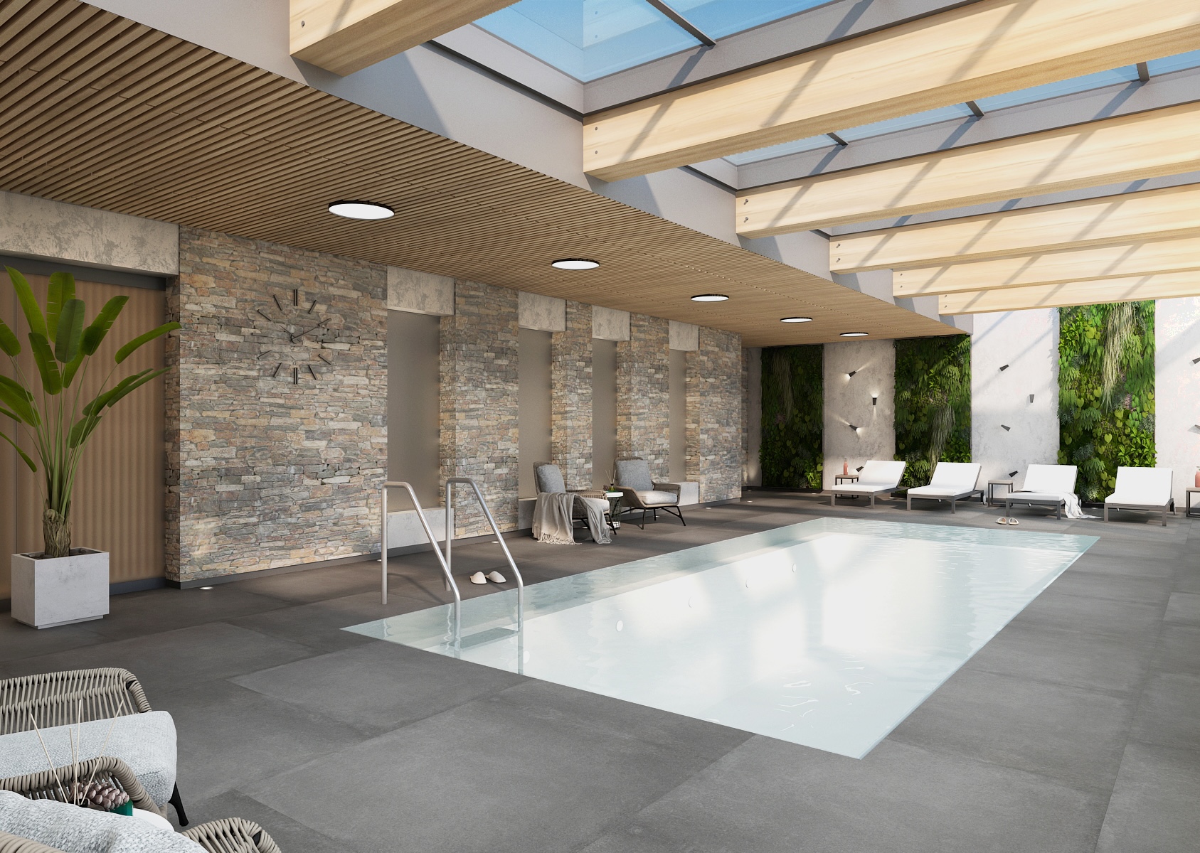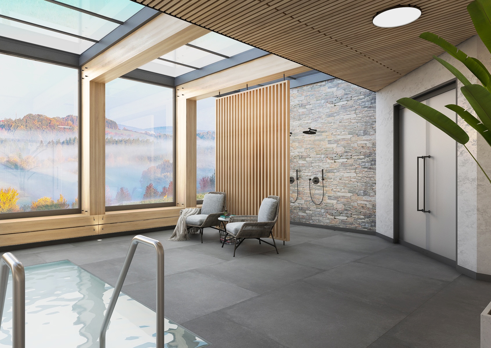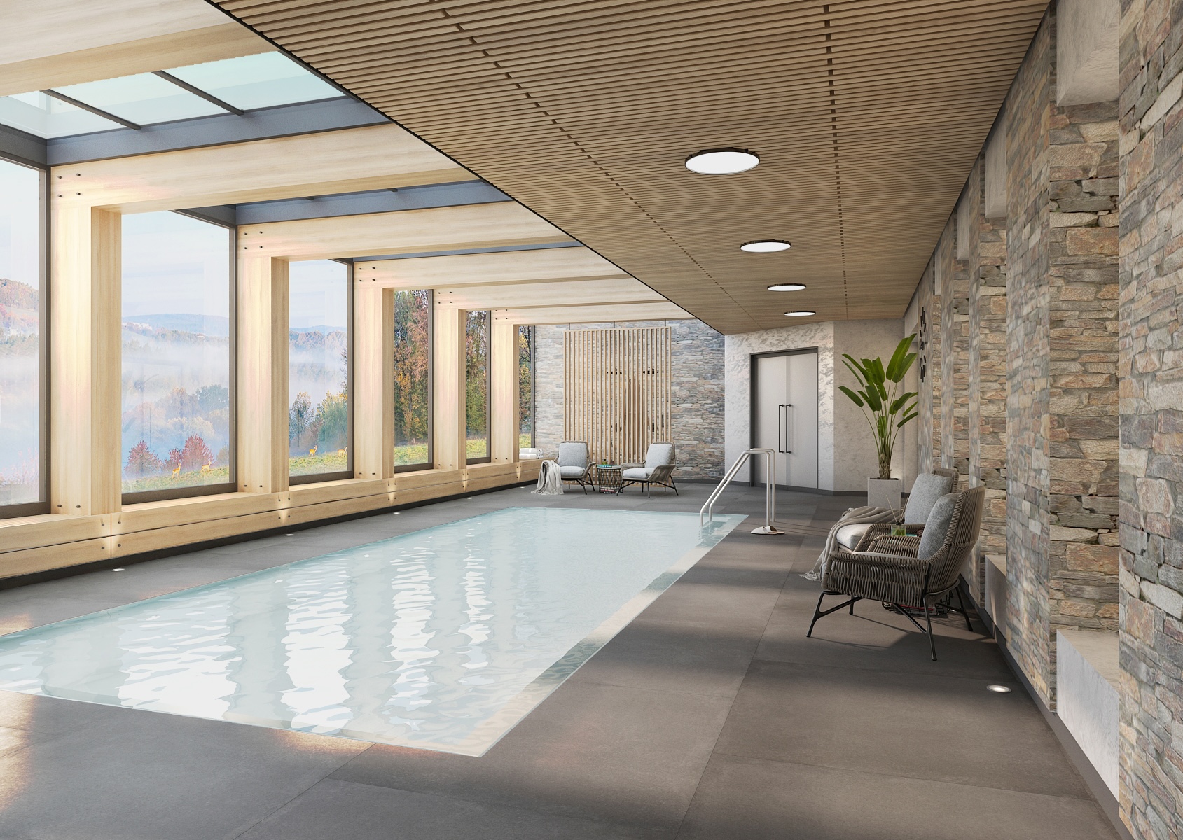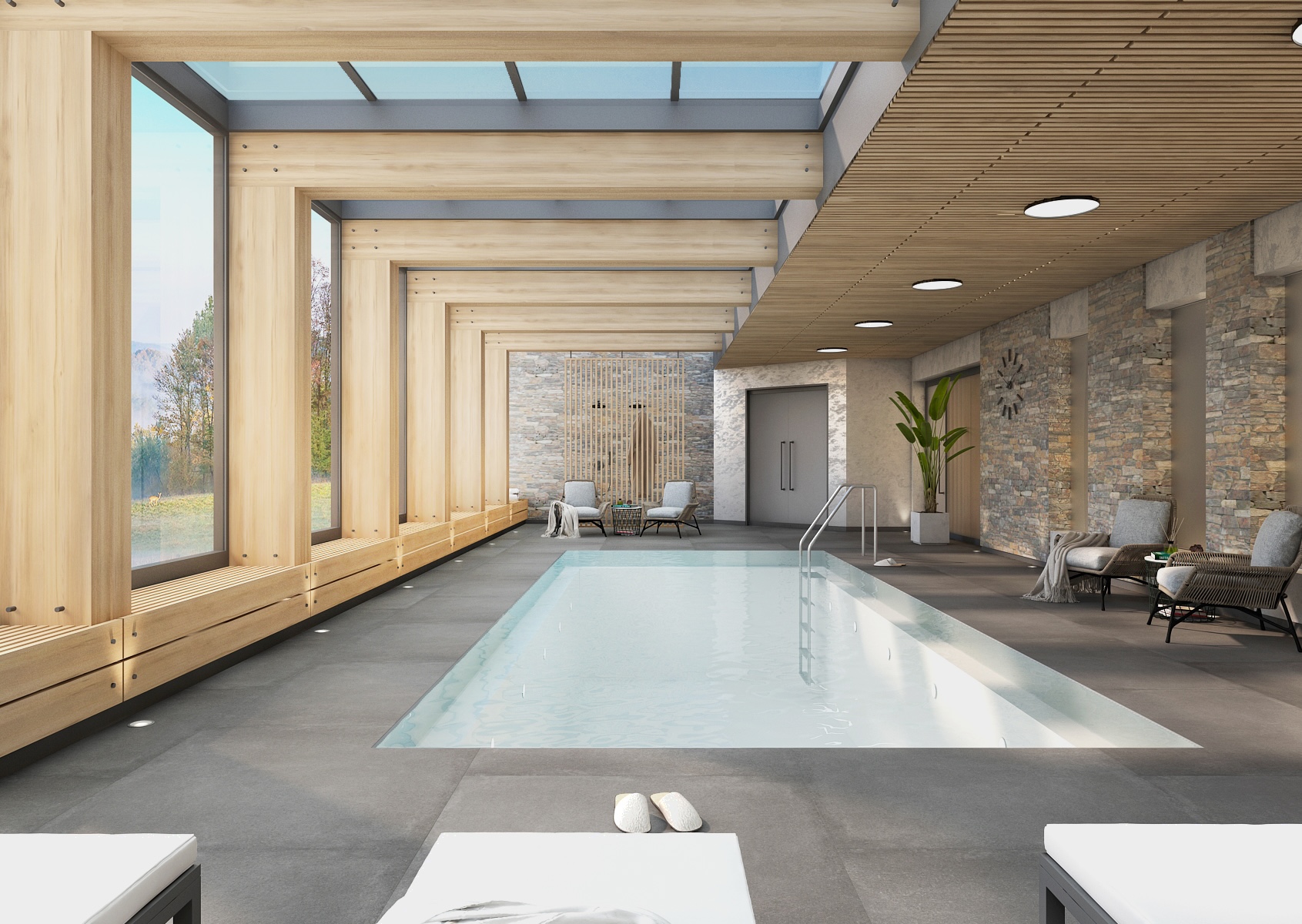 Hlavní relaxační zóně dominuje krytý bazén obklopený dřevěnou konstrukcí a velkoformátovými okny, které přivádějí do prostoru dostatek přirozeného světla. Kombinace světlého dřeva, šedé dlažby a kamenných akcentů vytváří vyvážený a harmonický celek.