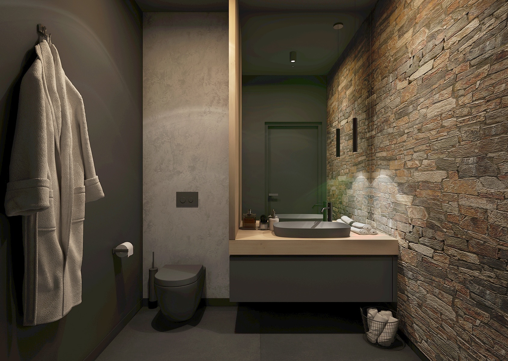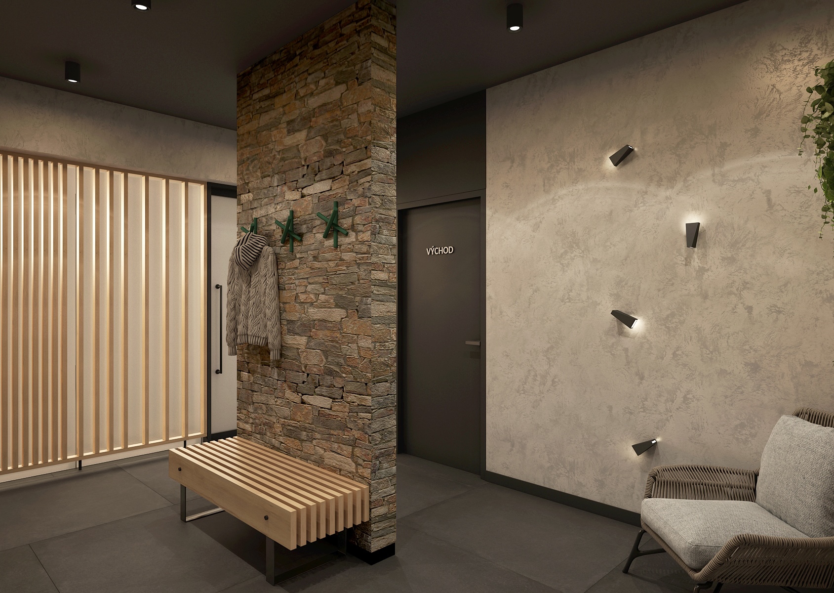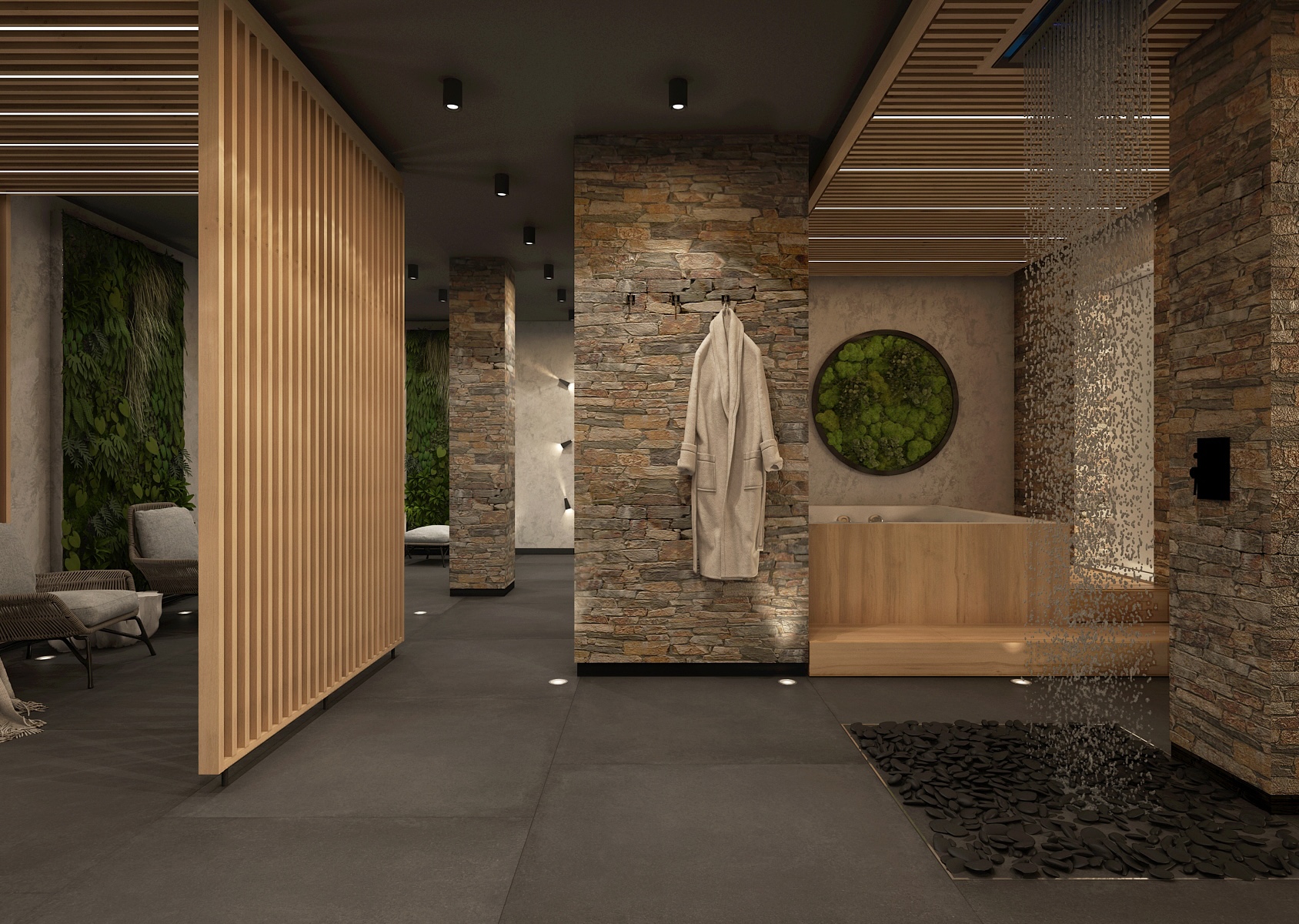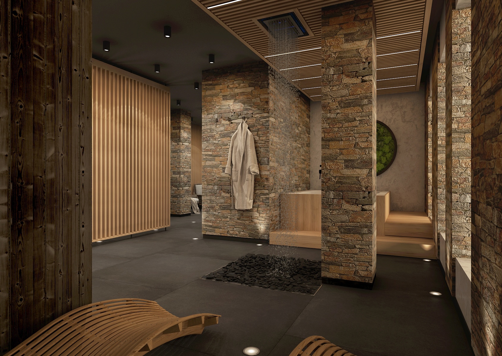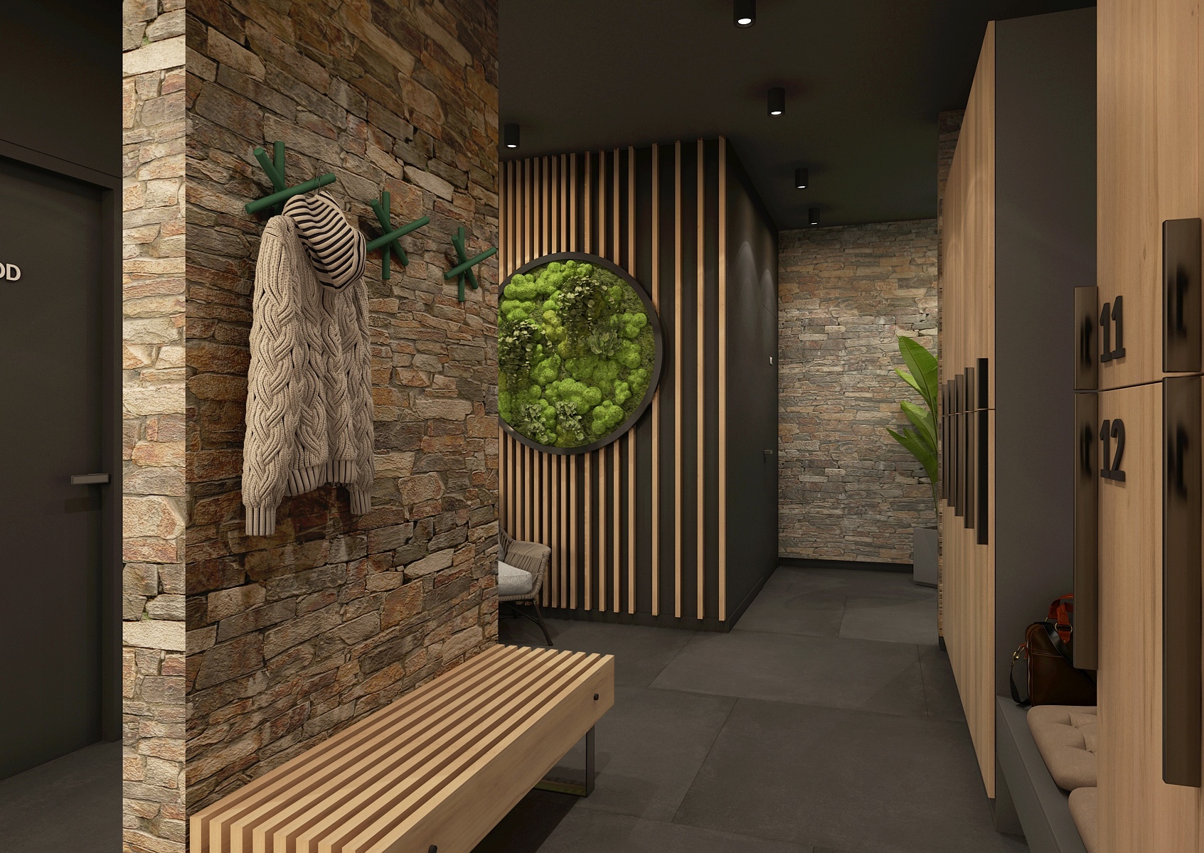 Šatna působí intimním a útulným dojmem díky použití teplého dřeva, přiznaného kamene a přírodních dekorací, jako je mechový obraz. Tlumené osvětlení a decentní design přispívají k pocitu soukromí a klidu.