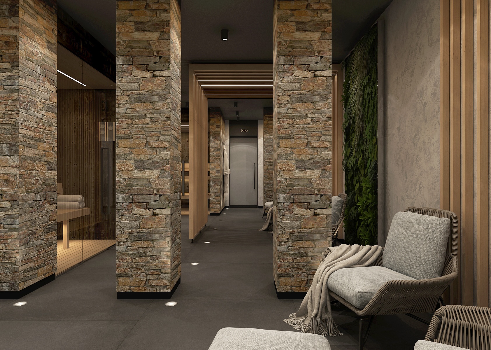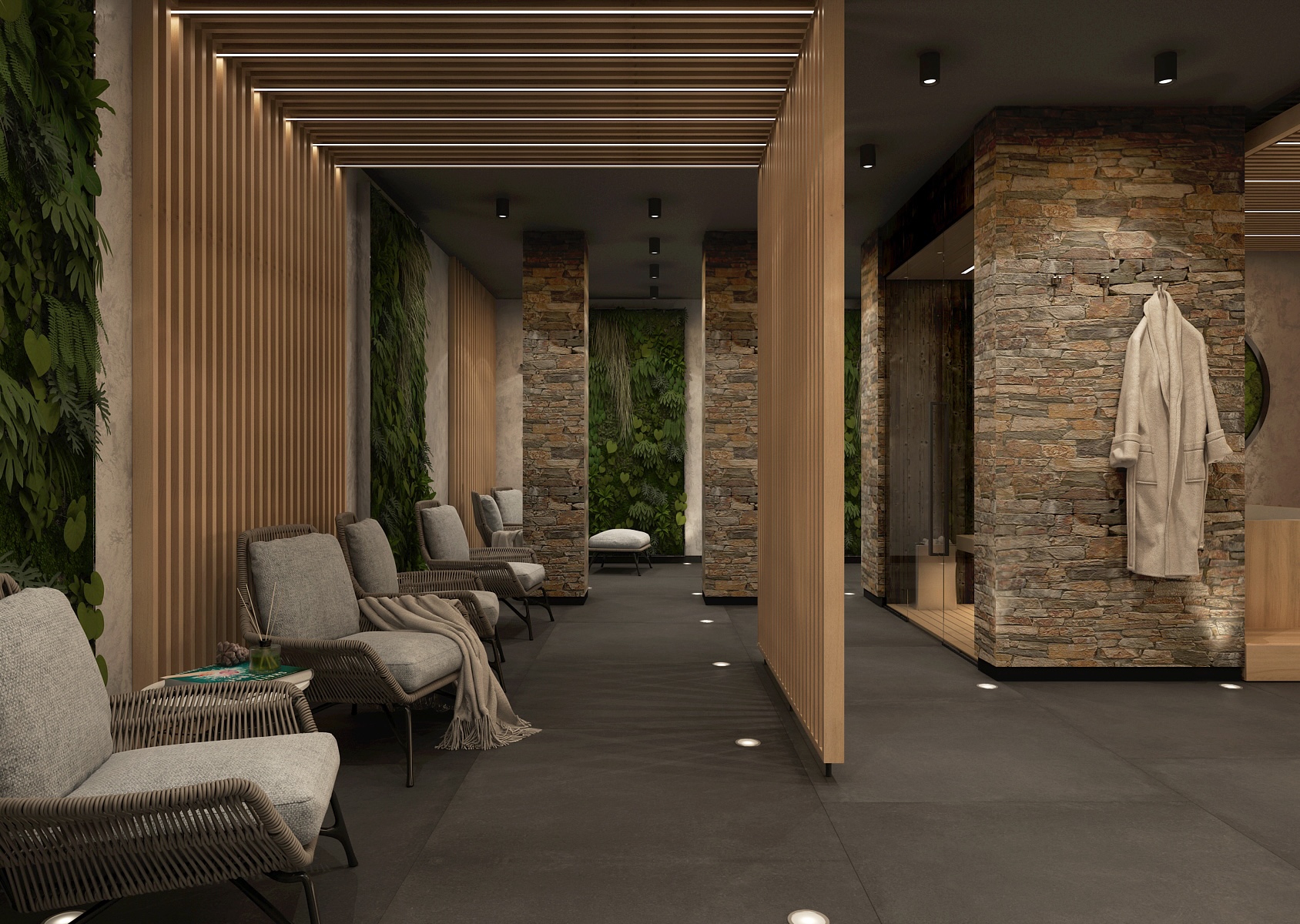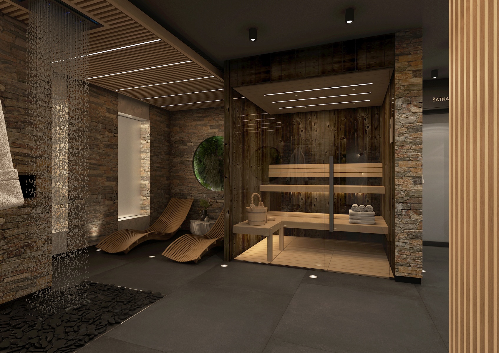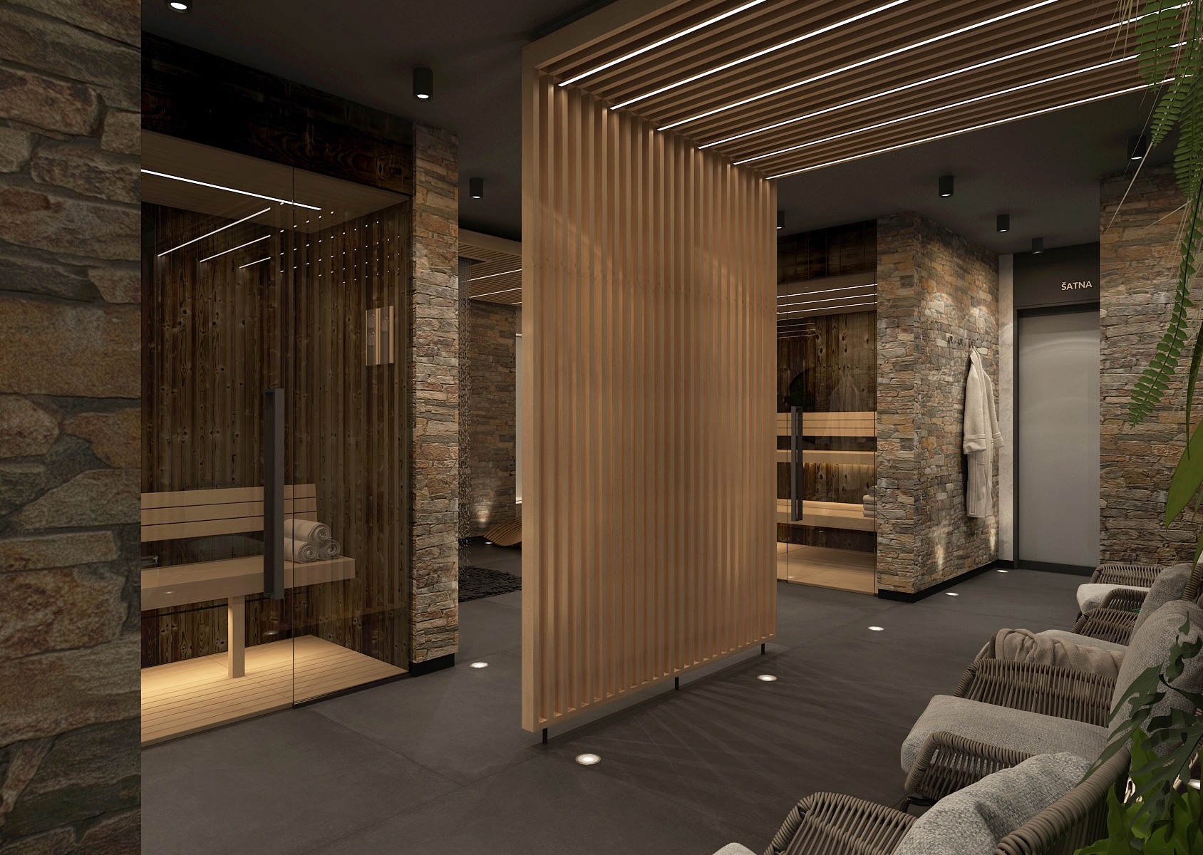 Saunová část nabízí kombinaci dřeva a kamene v elegantním tlumeném osvětlení, které podporuje celkový odpočinek a uvolnění. Prostor je členěn pomocí dřevěných lamel, které dodávají interiéru na dynamice a zároveň zachovávají příjemné soukromí.