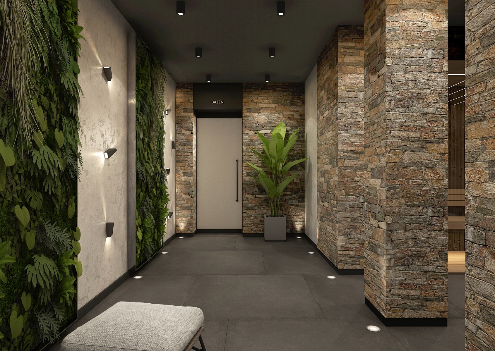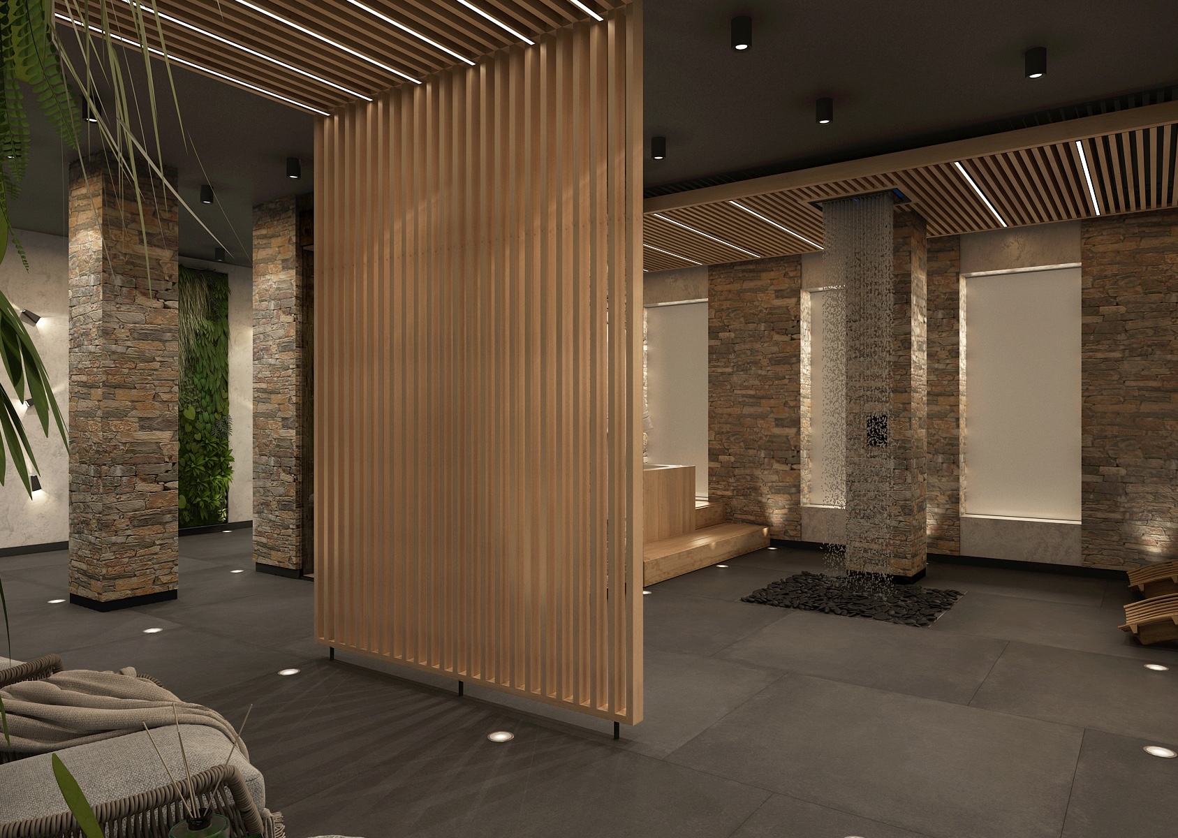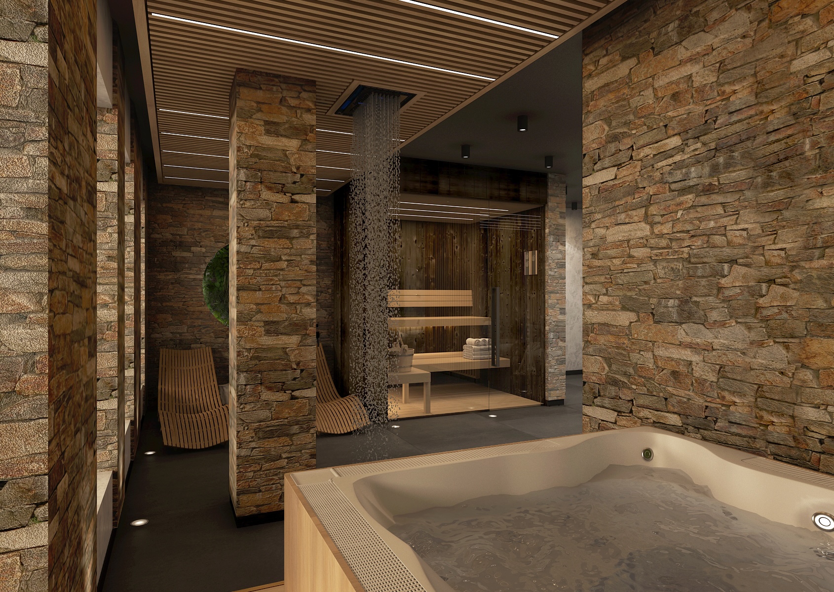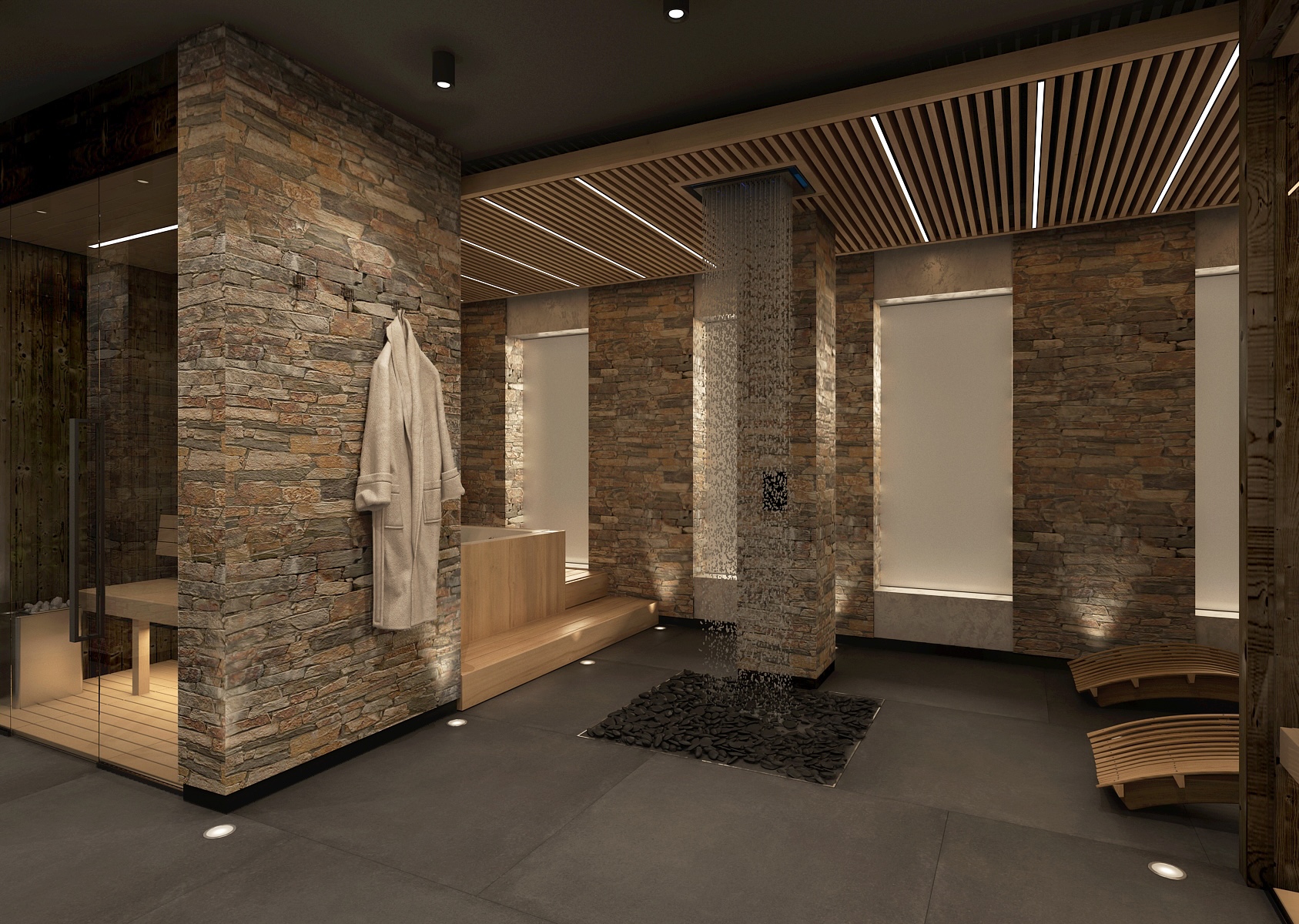 Saunová část nabízí kombinaci dřeva a kamene v elegantním tlumeném osvětlení, které podporuje celkový odpočinek a uvolnění. Prostor je členěn pomocí dřevěných lamel, které dodávají interiéru na dynamice a zároveň zachovávají příjemné soukromí.