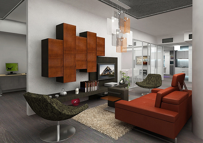 Showroom je návazně rozdělen pomocí příček s obklady z přírodního kamene nebo s luxusní tapetou, které doplňují vystavený designový nábytek v jednotlivých částech interiéru. Jednotlivé části prostoru jsou navrhovány pro konkrétní sadu výrobků. Kvalitní vinylová podlaha v šedavé barvě dává vyniknout jak exponátům, tak zpracování příček a stěn.