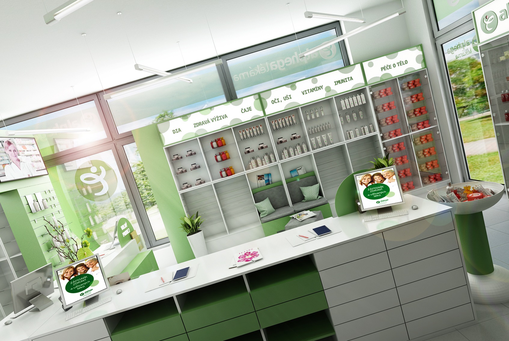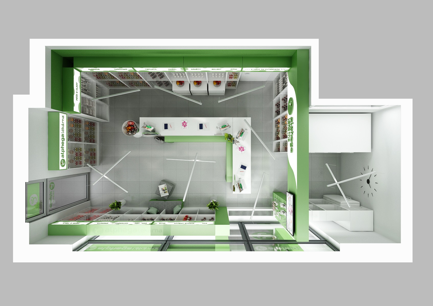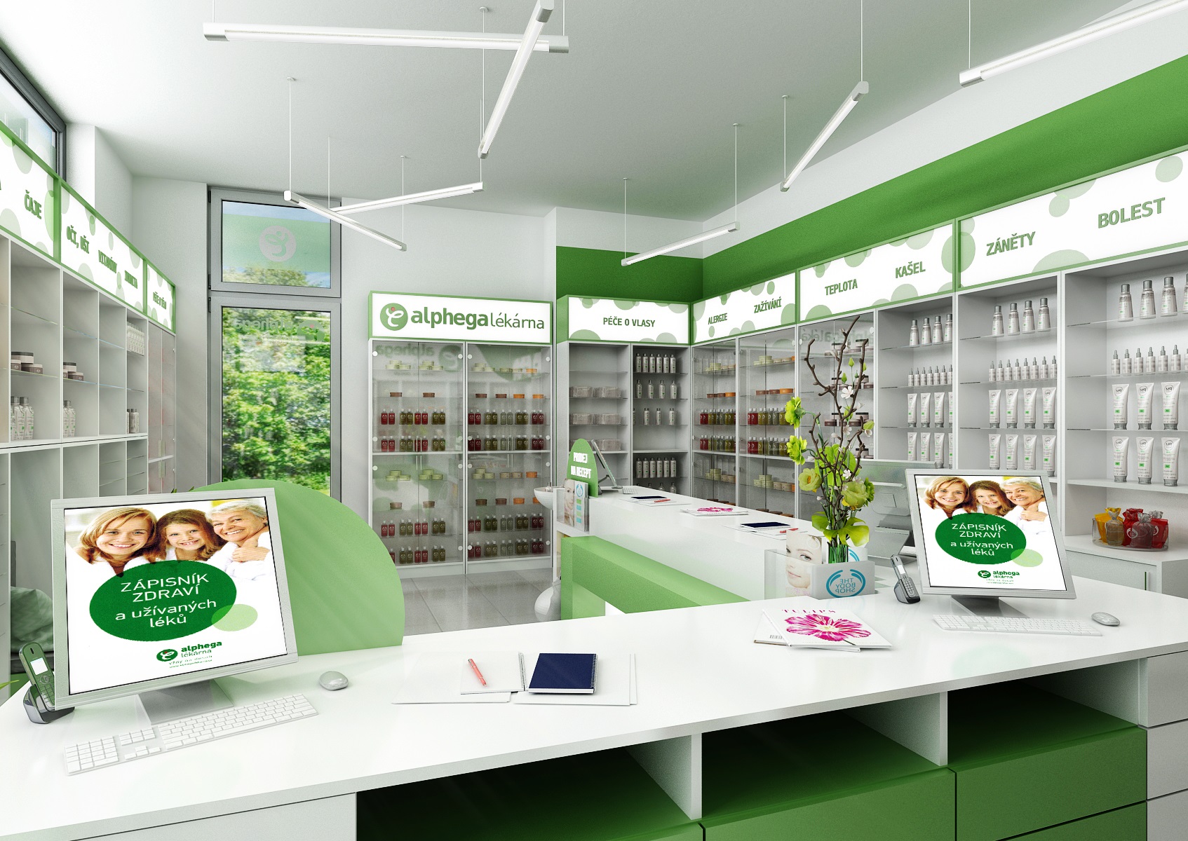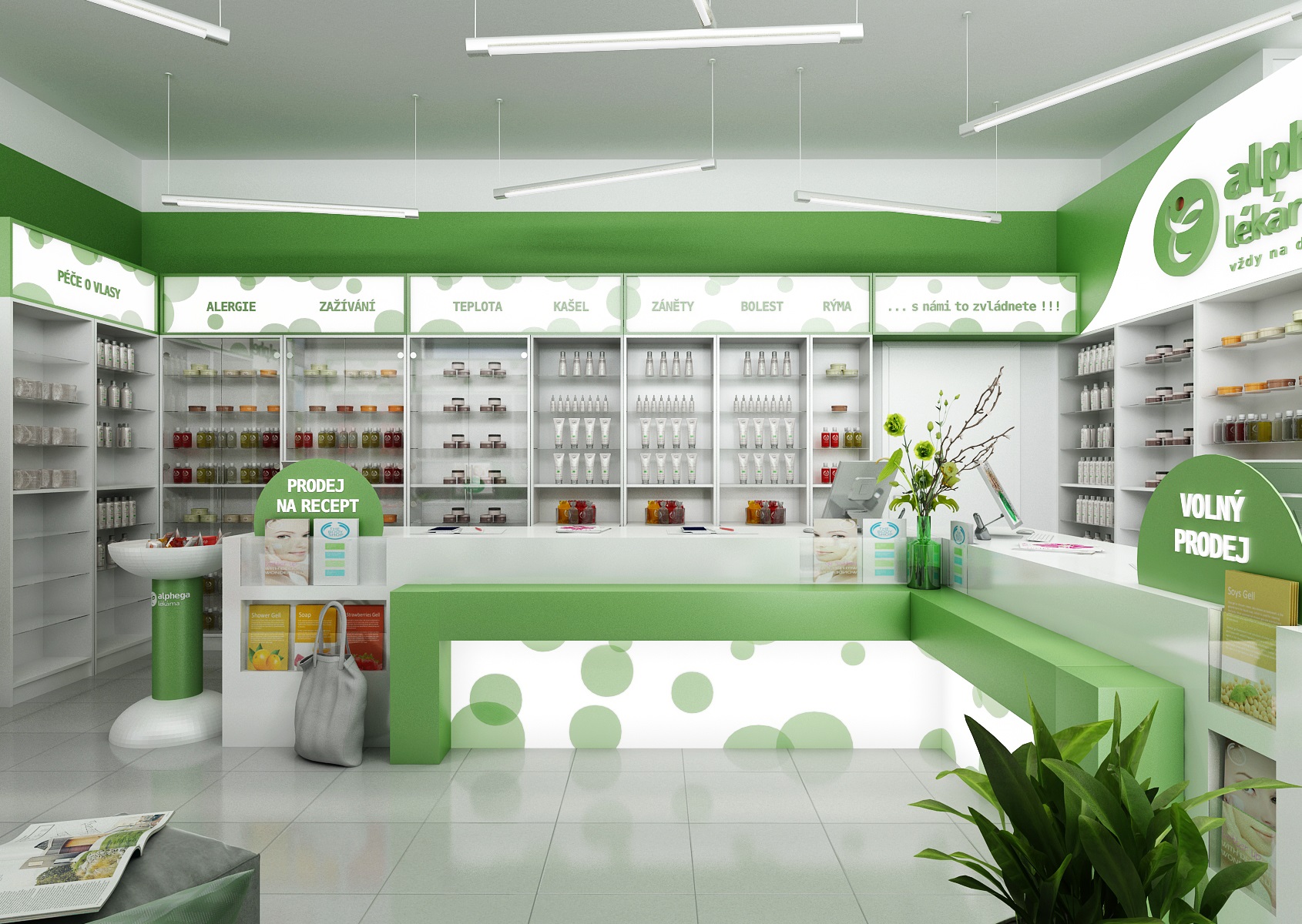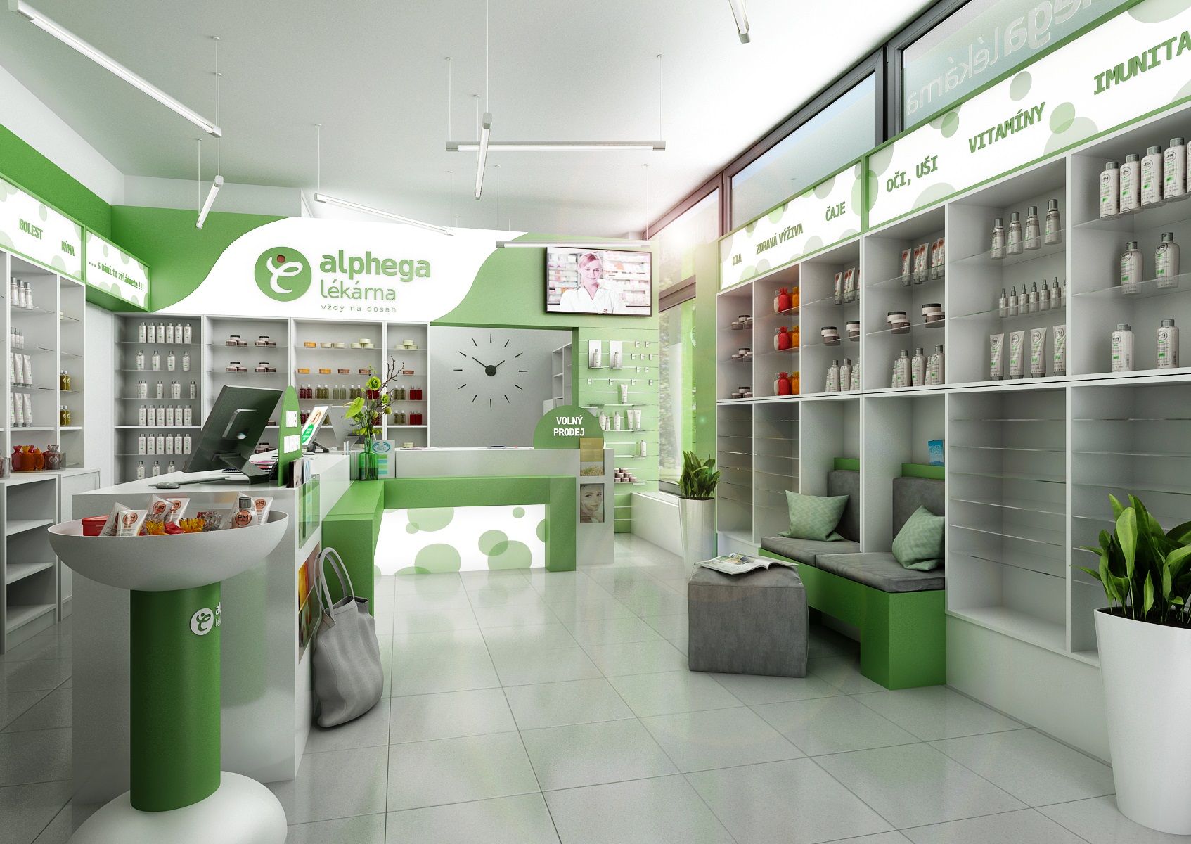Renovace interiéru lékárny Alphega v Praze vycházející z firemního design manuálu. Jak už lékárny bývají i tato je laděná do bílé barvy se zelenými prvky jak u regálů tak i u prodejního pultu. Bílé podsvícené pozadí je dekorováno zelenými kruhy, které se překrývají. Místnost působí čistě a jednoduše.