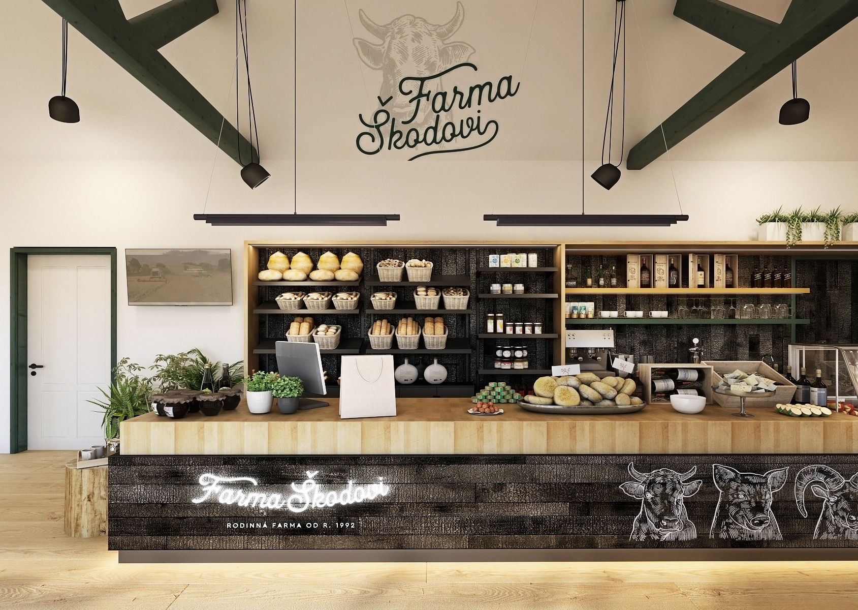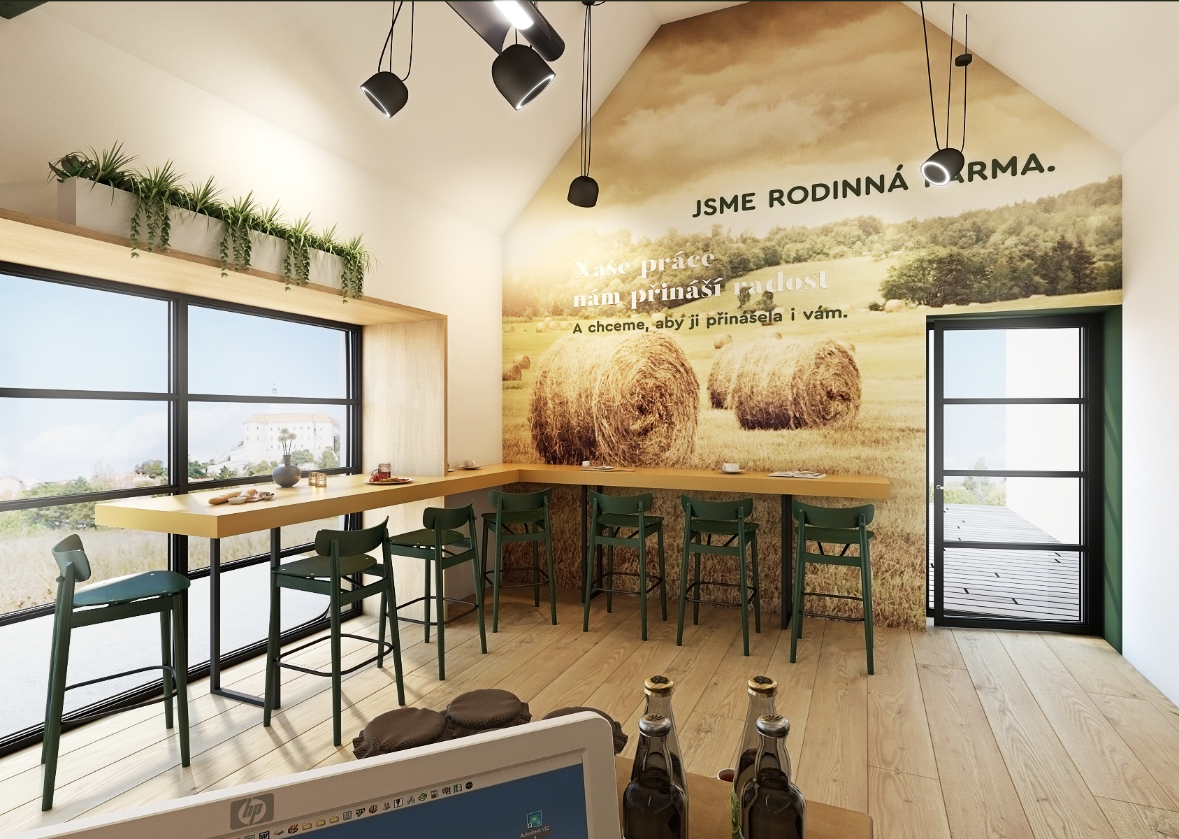 Při designu interiéru prodejny rodinné farmy bylo využito přírodních materiálů, které podrthují celou myšlenku návrhu, a dominantními barvami se stala břidlicově zelená a hořčicově žlutá.