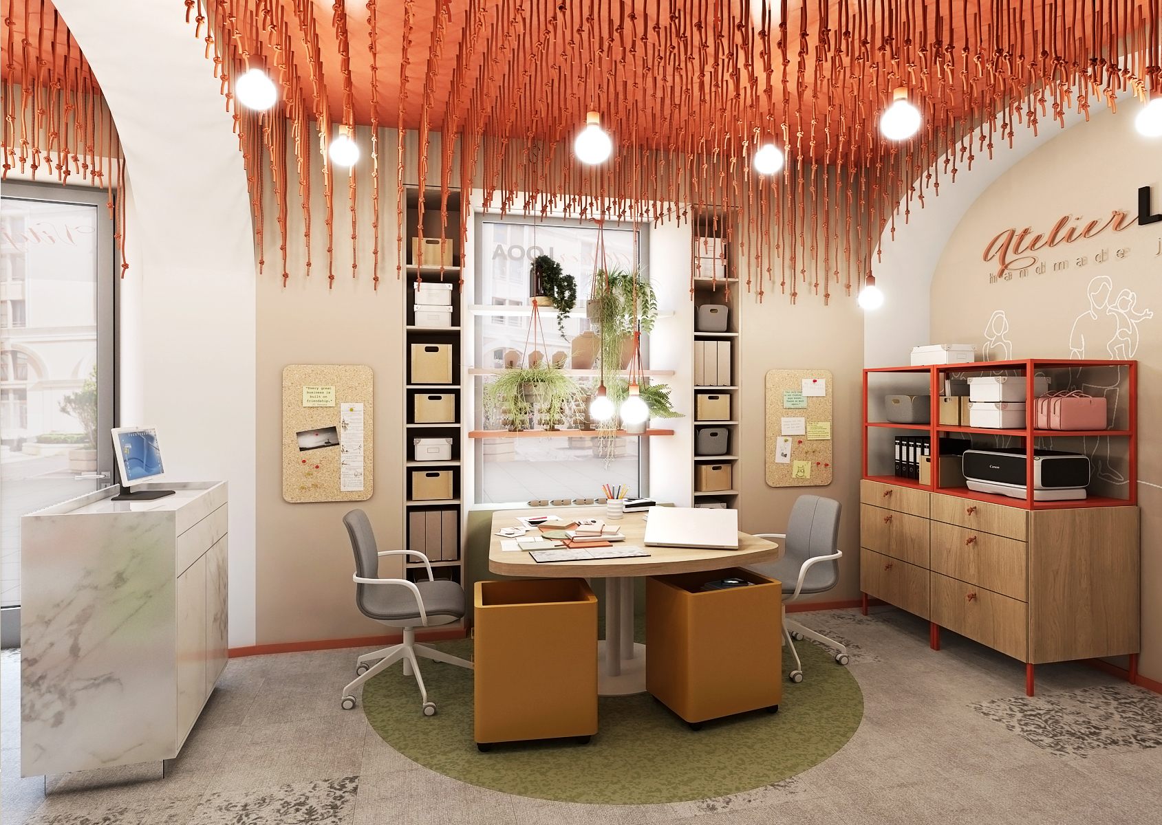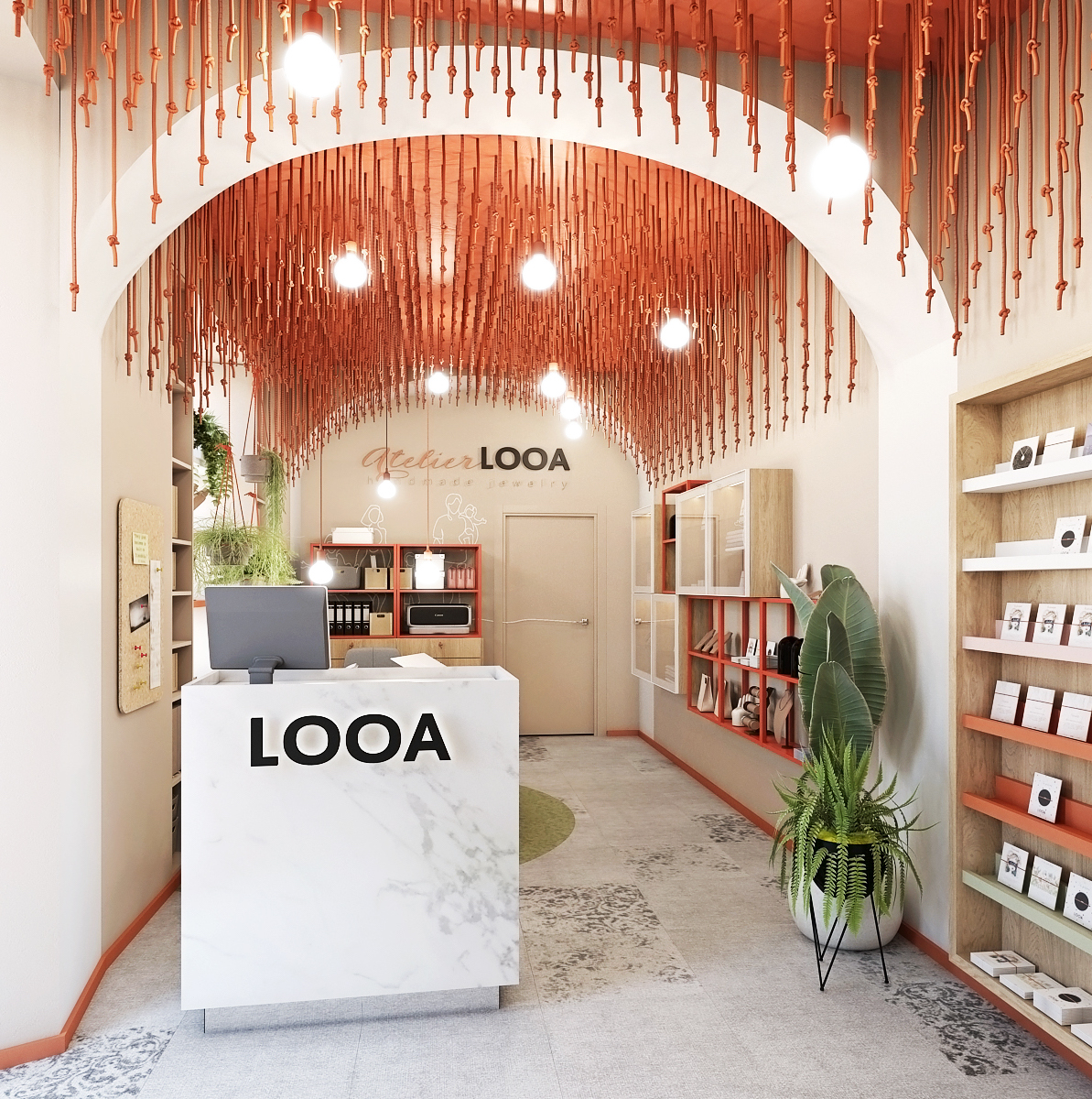 Útulný ateliér firmy LOOA je umístěn v historické budově v Brně s klenutými stropy. Ty jsou zdůrazněny zavěšenými červenými provázky s uzlíky, které kopírují tvar klenby. Mezi uzlíky se nachází i závěsná svítidla v podobě žárovek v různých délkách.