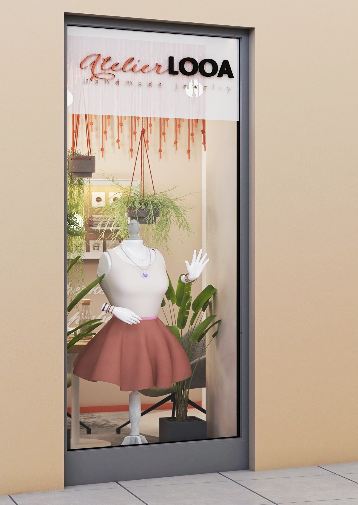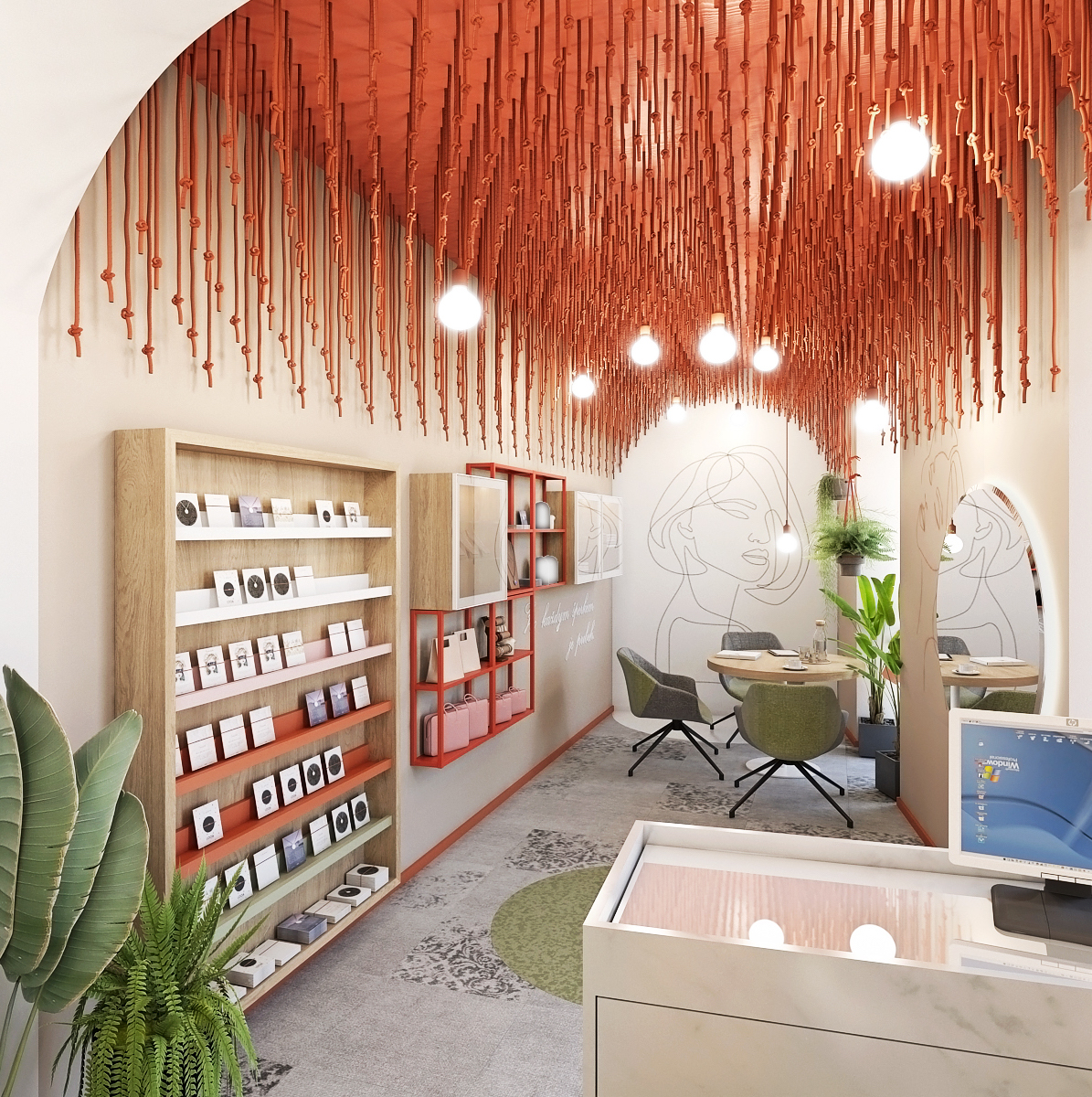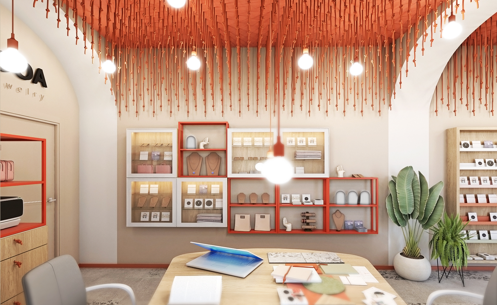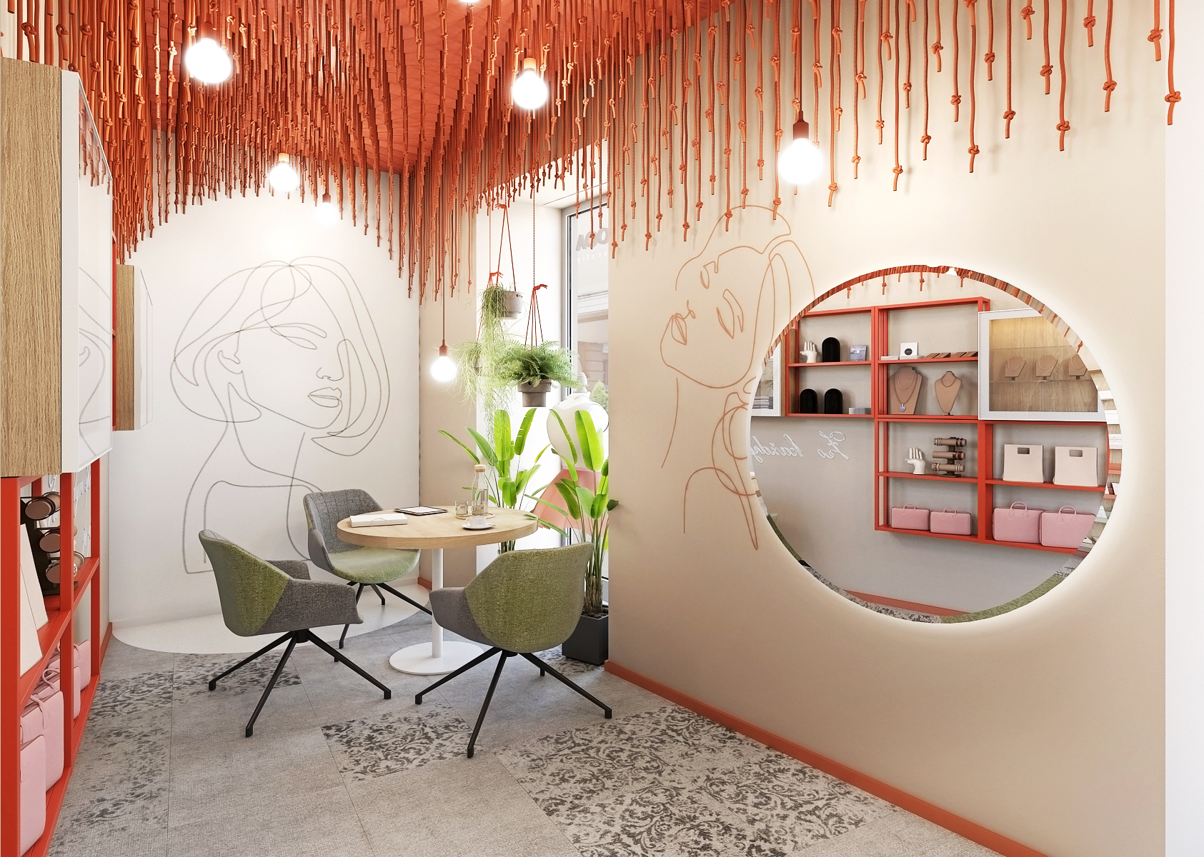 Stěny interiéru zdobí linearty dívek, zrcadlo s podsvícením či právě vitríny s ručně vyráběnými šperky. Červená barva se odráží jak v konstrukci vitrín, tak i v použitých lištách oddělujících podlahu od stěn. Šedá podlaha je sem tam doplněna o vzorované části. Barevnost prostoru je doplněna ještě o zelenou, která se zde nachází na křesílkách a v podobě rostlin.