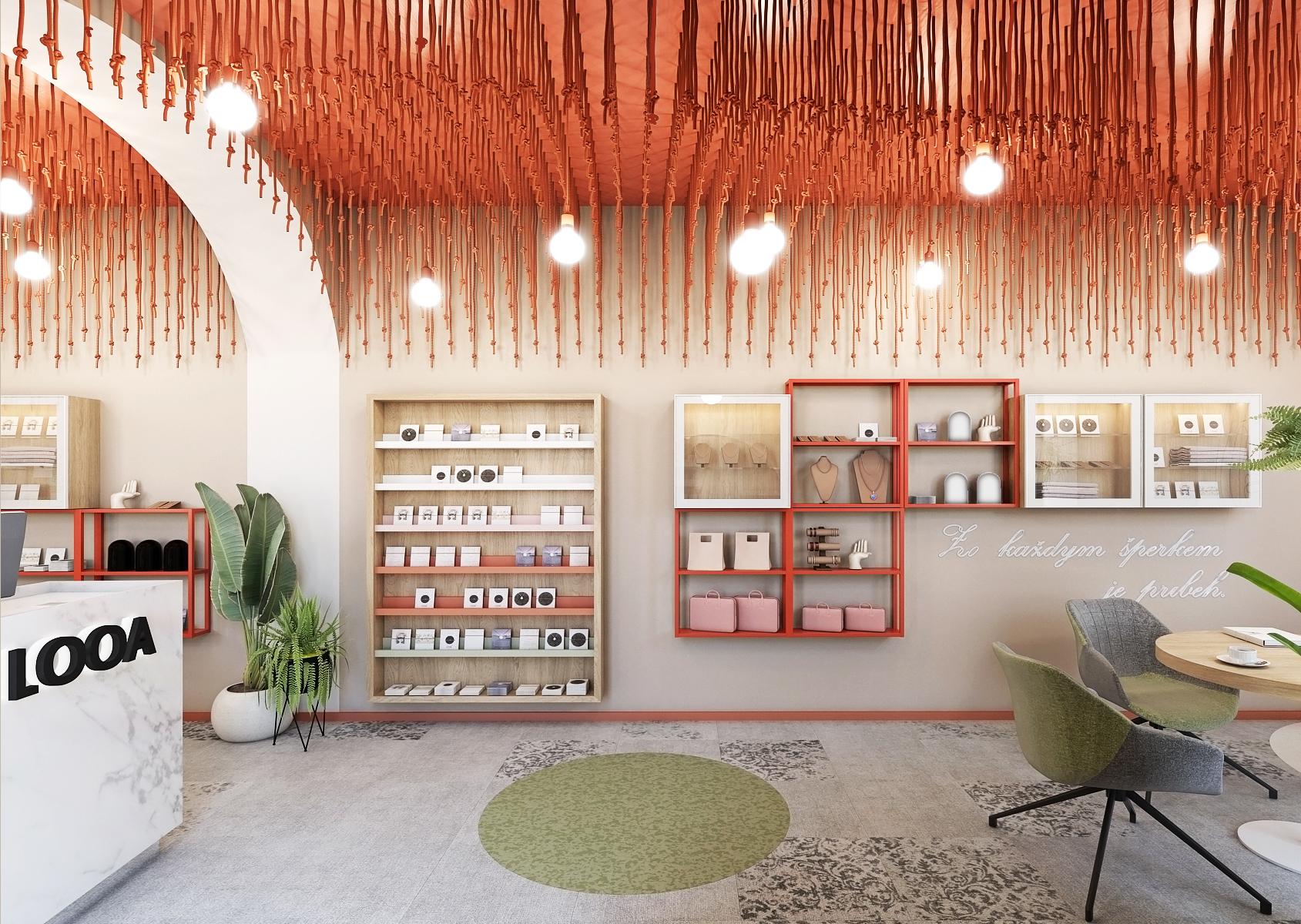 Interiér obchodu LOOA je laděn do světlých barev v kombinaci s červenou barvou, která se nachází hlavně na stropě ve velice zajímavém provedení.