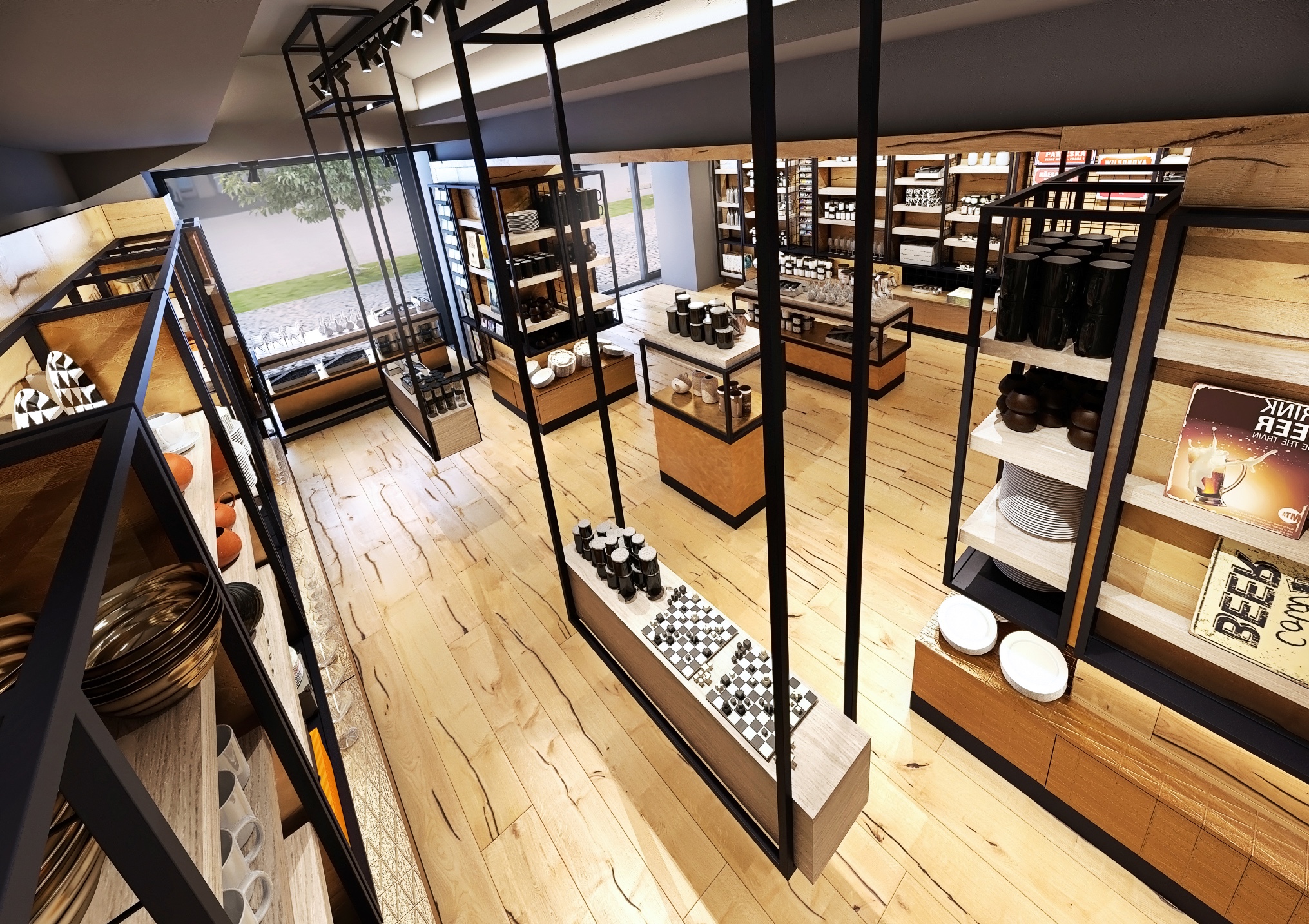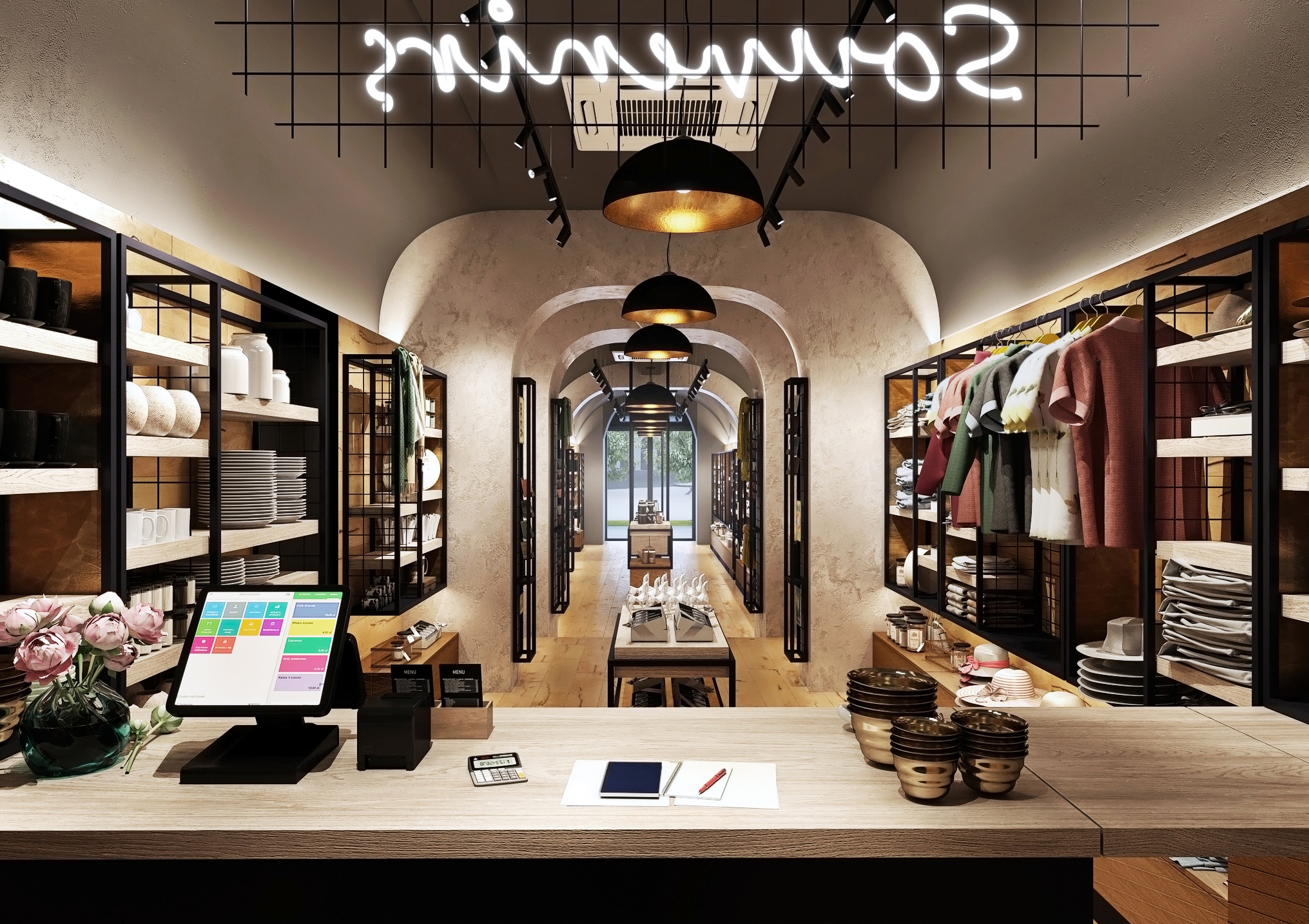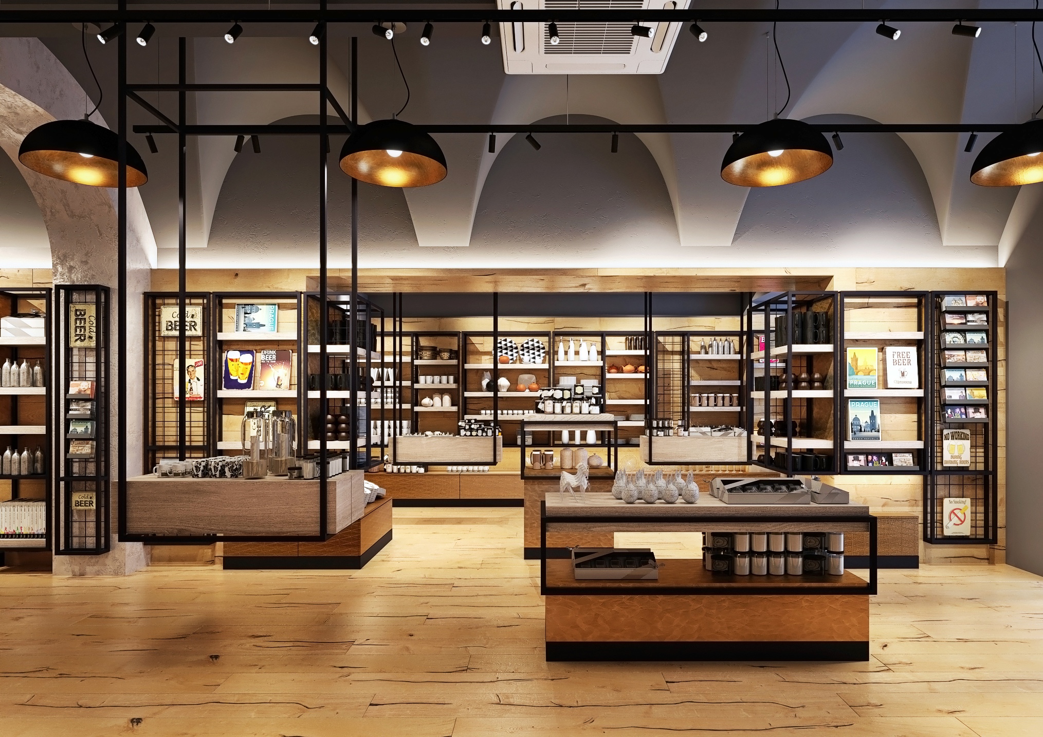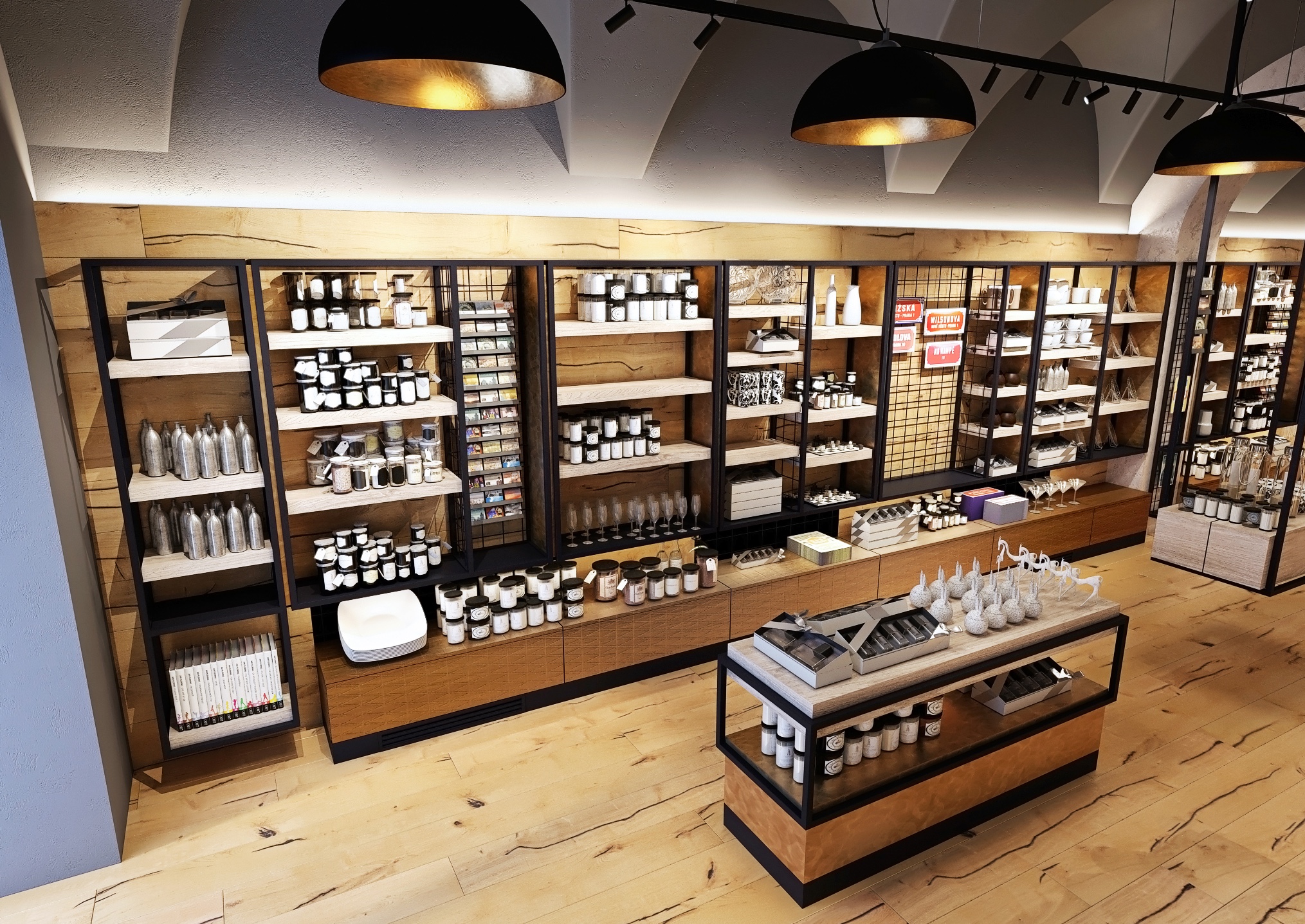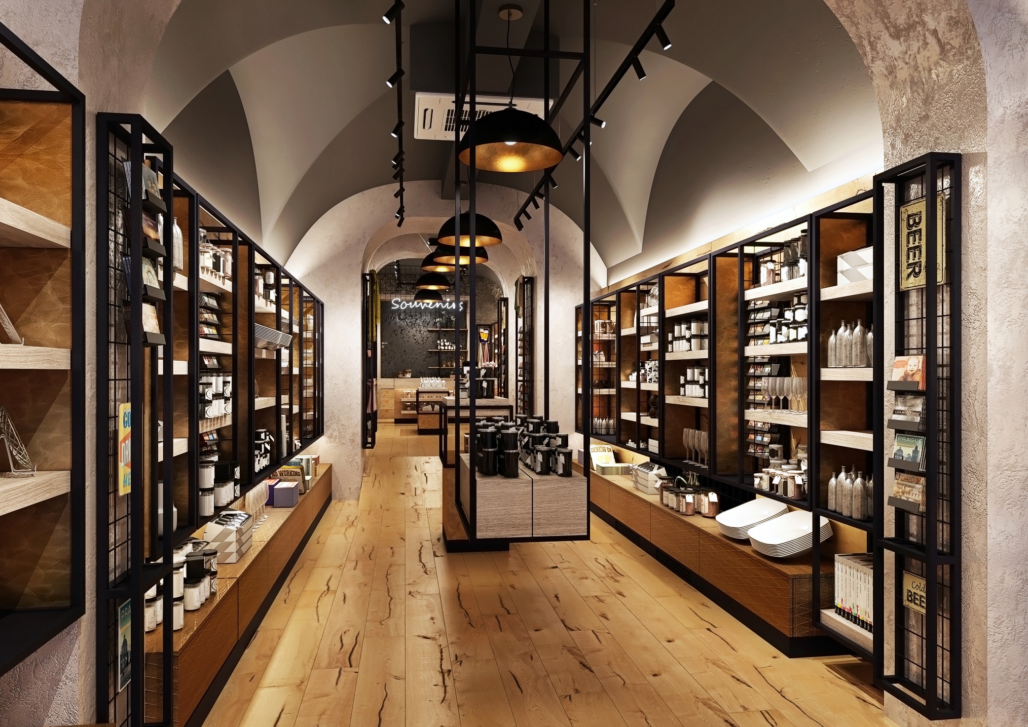 Dlouhá ulička je lemována regály s různorodým zbožím, od keramických výrobků po stylové oblečení, vše pečlivě uspořádané a snadno dostupné pro zákazníky. Stropní klenby a velká industriální svítidla dodávají prostoru historický šarm, zatímco světlé dřevěné podlahy a černé kovové rámy regálů vytvářejí moderní kontrast. Centrální umístění pokladny poskytuje přehled o celém prostoru, což usnadňuje obsluhu zákazníků.