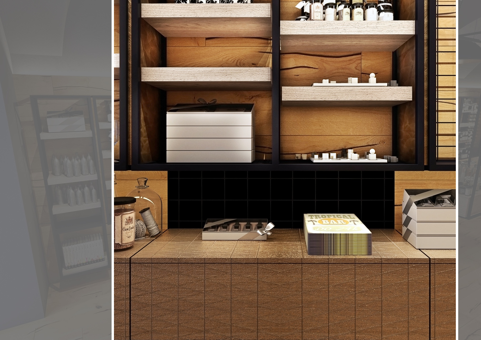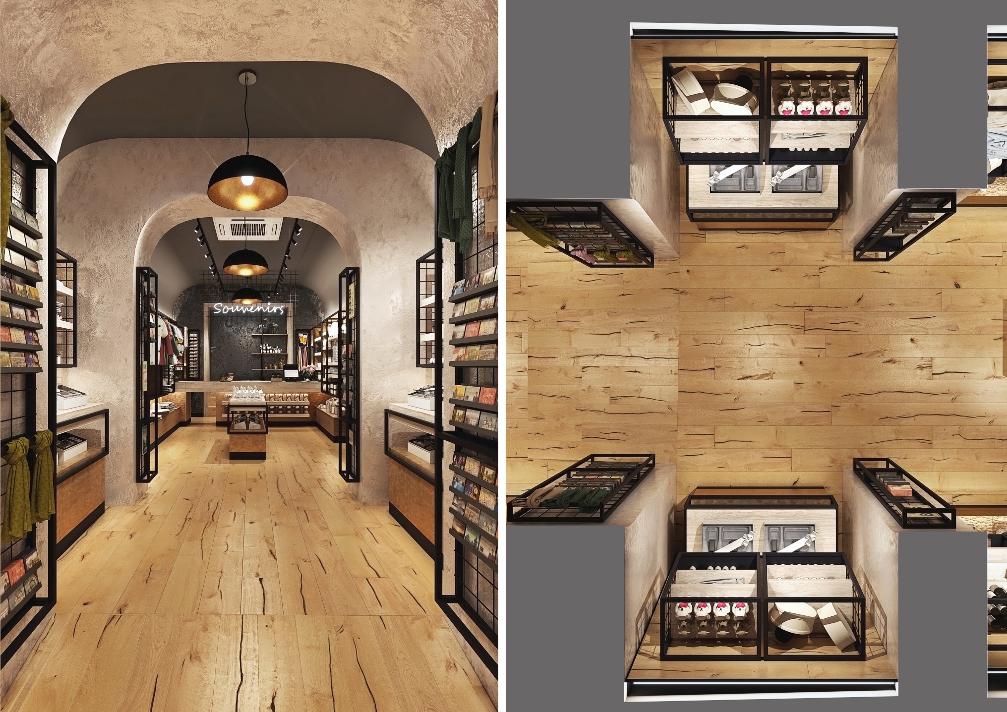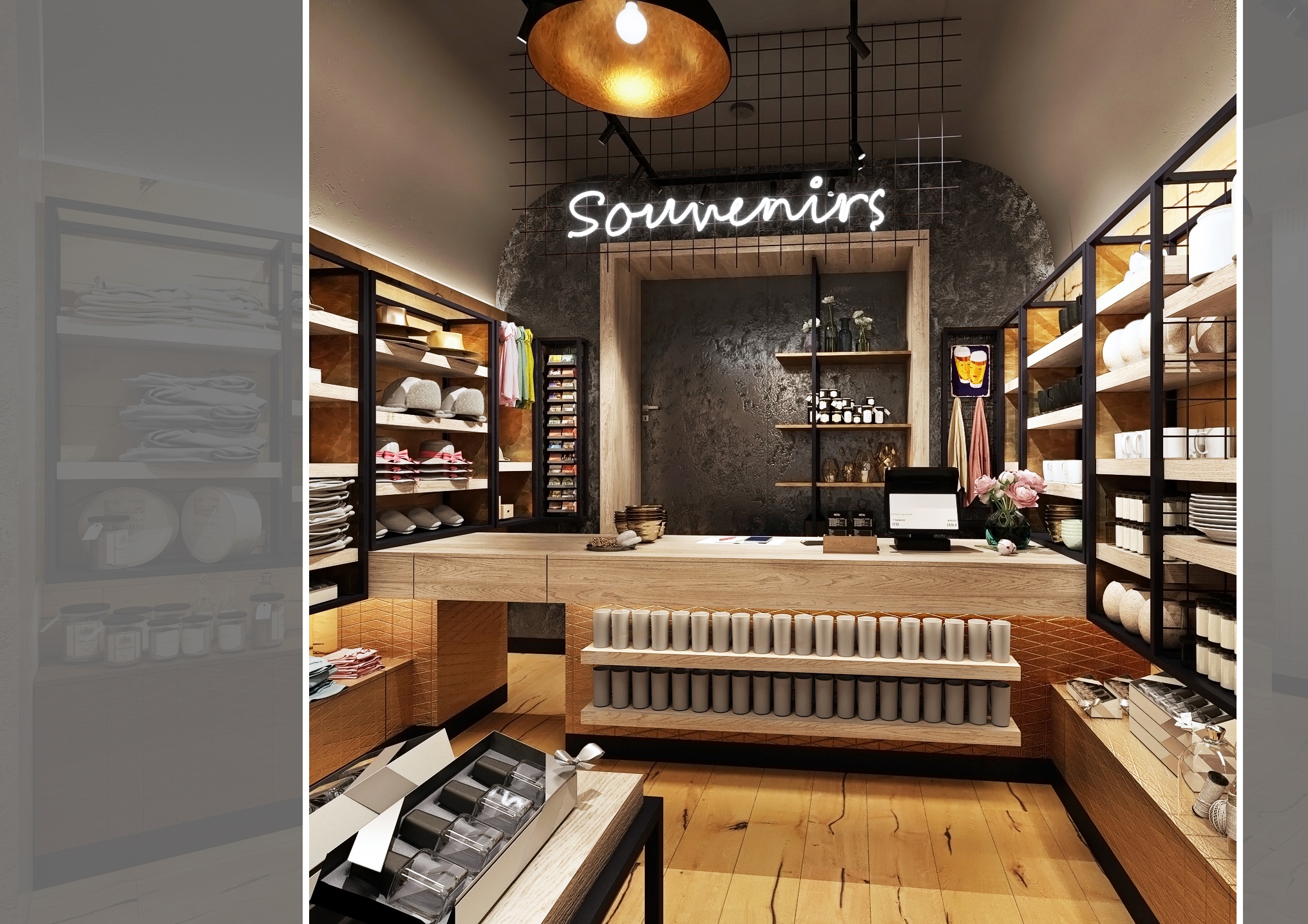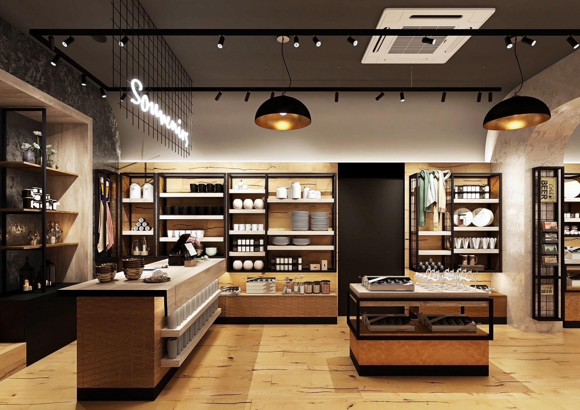 Tento interiér obchodu se suvenýry kombinuje moderní design s industriálním nádechem, vytvářejíc tak atraktivní a funkční prostor.