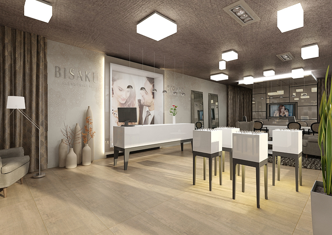 Zlatnictví Bisaku v Ostravě. Na stěně je použita velkoformátová tapeta od firmy Tres Tintas - Alandalus. Interiér je laděný do světlých zemitých barev, díky kterým působí něžně a elegantně. Čistý design podtrhují hranaté vitríny s dřevěnou podnoží. Zajímavým prvkem jsou krychlová stropní svítidla nepravidelně rozmístěna po celém stropě v místnosti. Nechybí ani elegantní posezení v čalouněných křeslech.