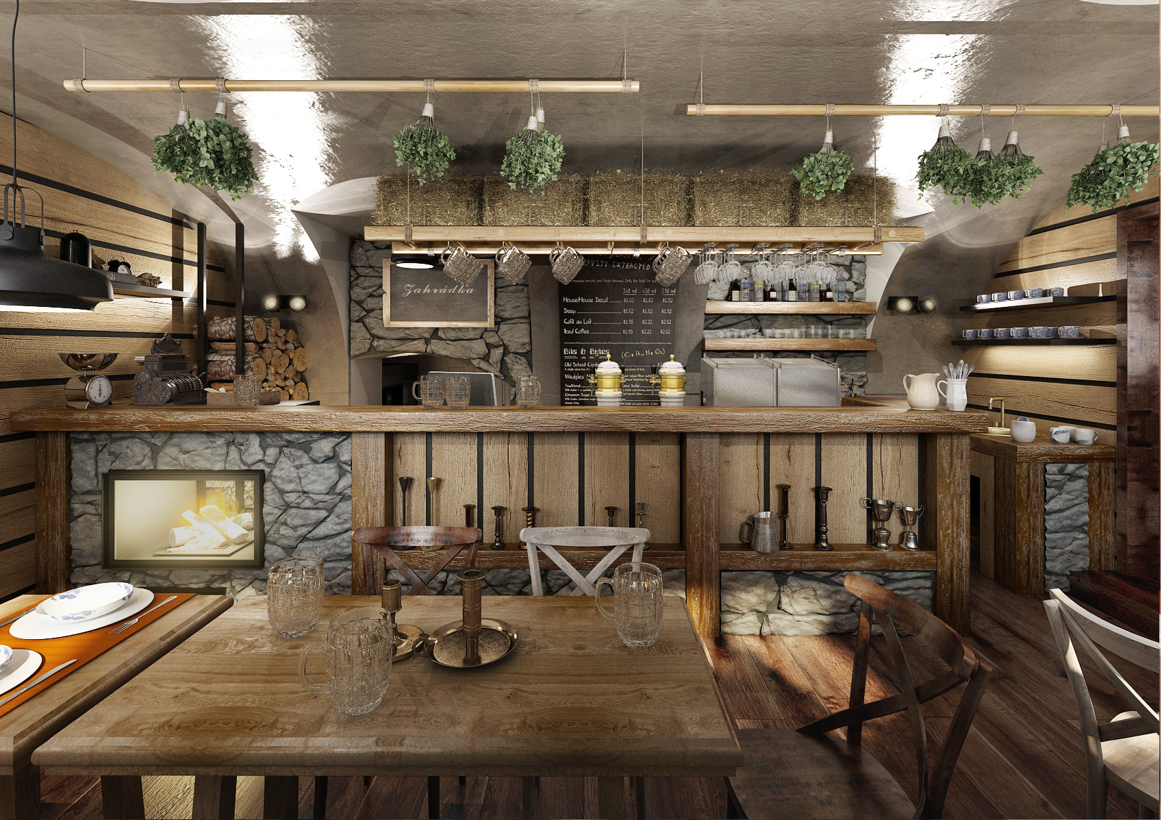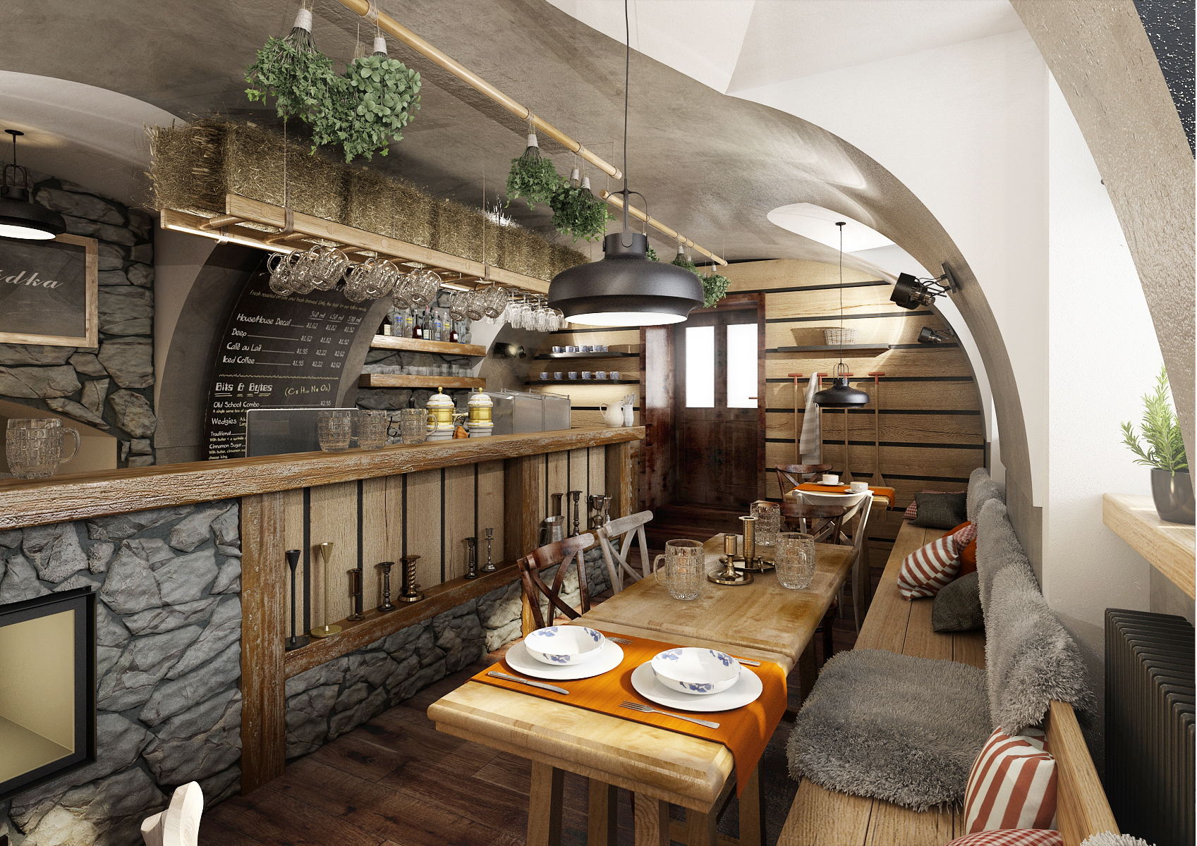 prostor s klenbovým stropem byl zařízen rustikálním stylem na téma „staré stodoly“. Interiér je doplněn dřevěným nábytkem a kamennými dekoracemi, což v nás vyvolává pocity z dob vikingů. Zajímavým prvkem v interiéru jsou svazky sena umístěny nad barem. Nechybí ani krb s kamenným obložením starající se o teplo v místnosti. Díky použití masivních prvků působí malý prostor útulně.