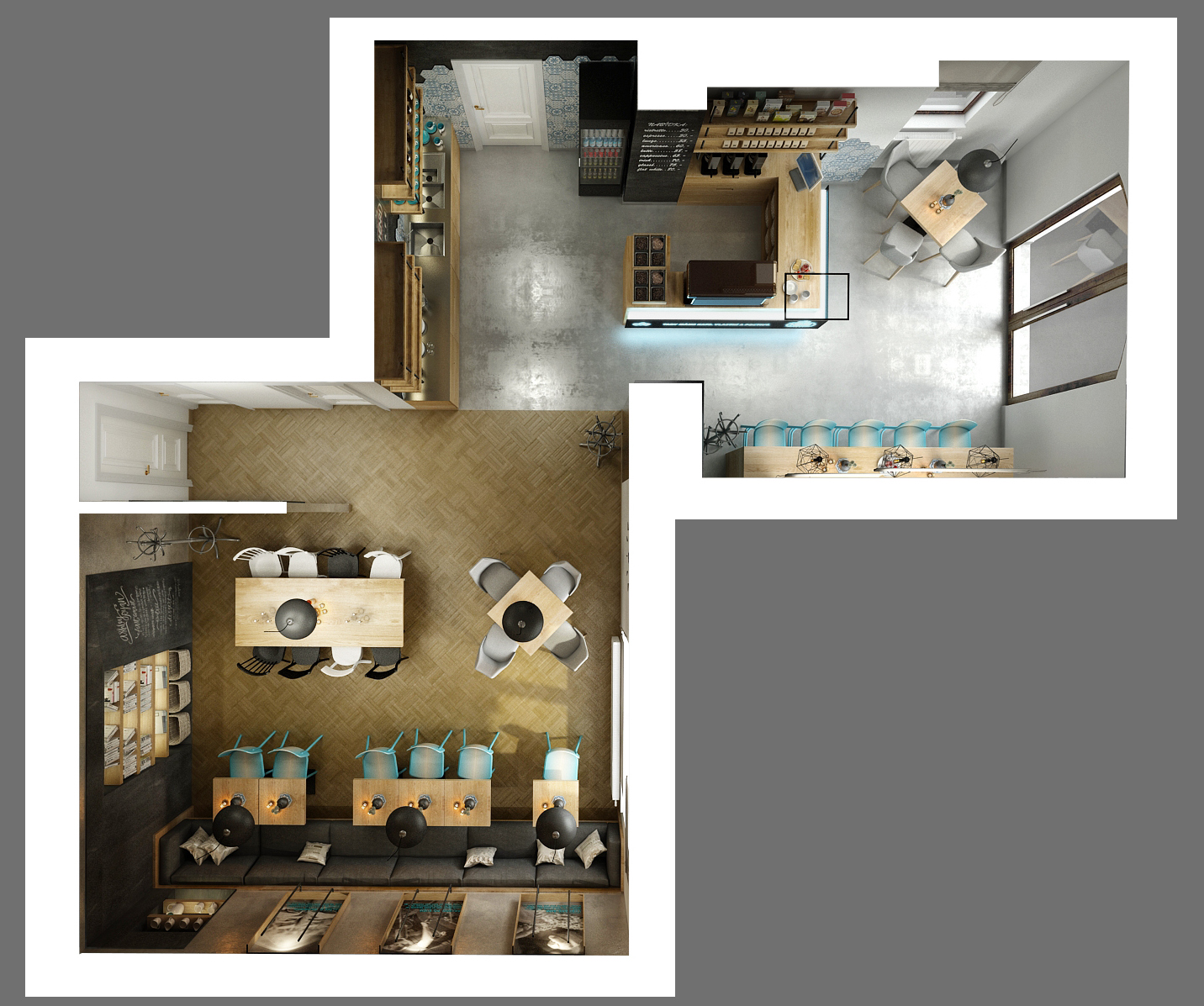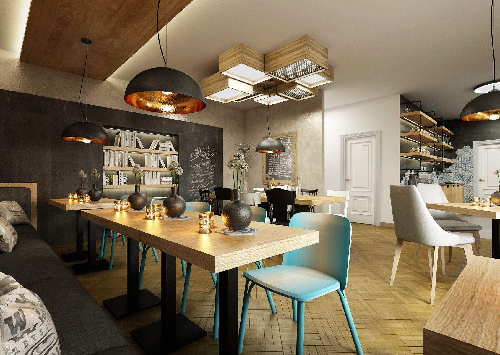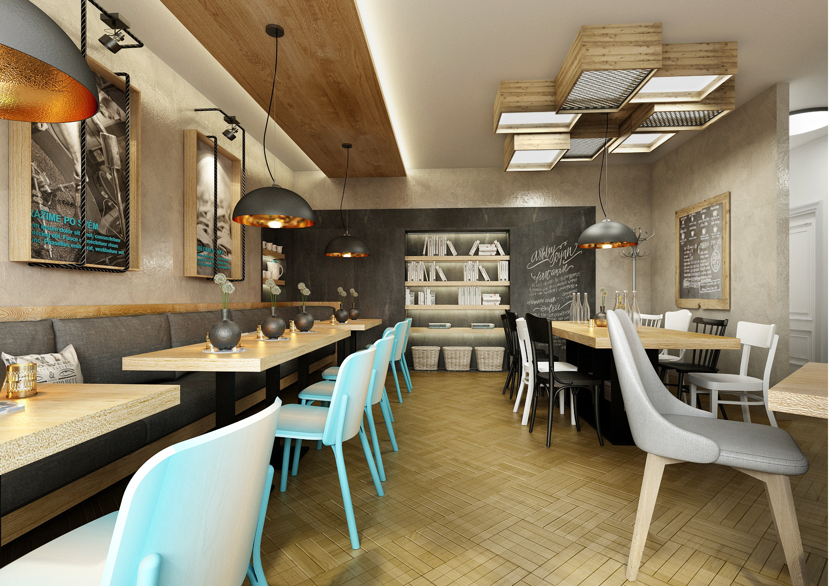 jako pobočka v Praze. Kvalitní přírodní materiál jako masivní dub, retro šestiúhelníkový obklad se vzorem majoliky, na původní parketovou podlahu navázala šedá stěrka vzhledu betonu, industriální doplňky. Stropní zářivky byly schovány do dřevěných beden připomínající přepravky. Mix židlí, stoly, křesílka a věšáky jsou od značky TON.