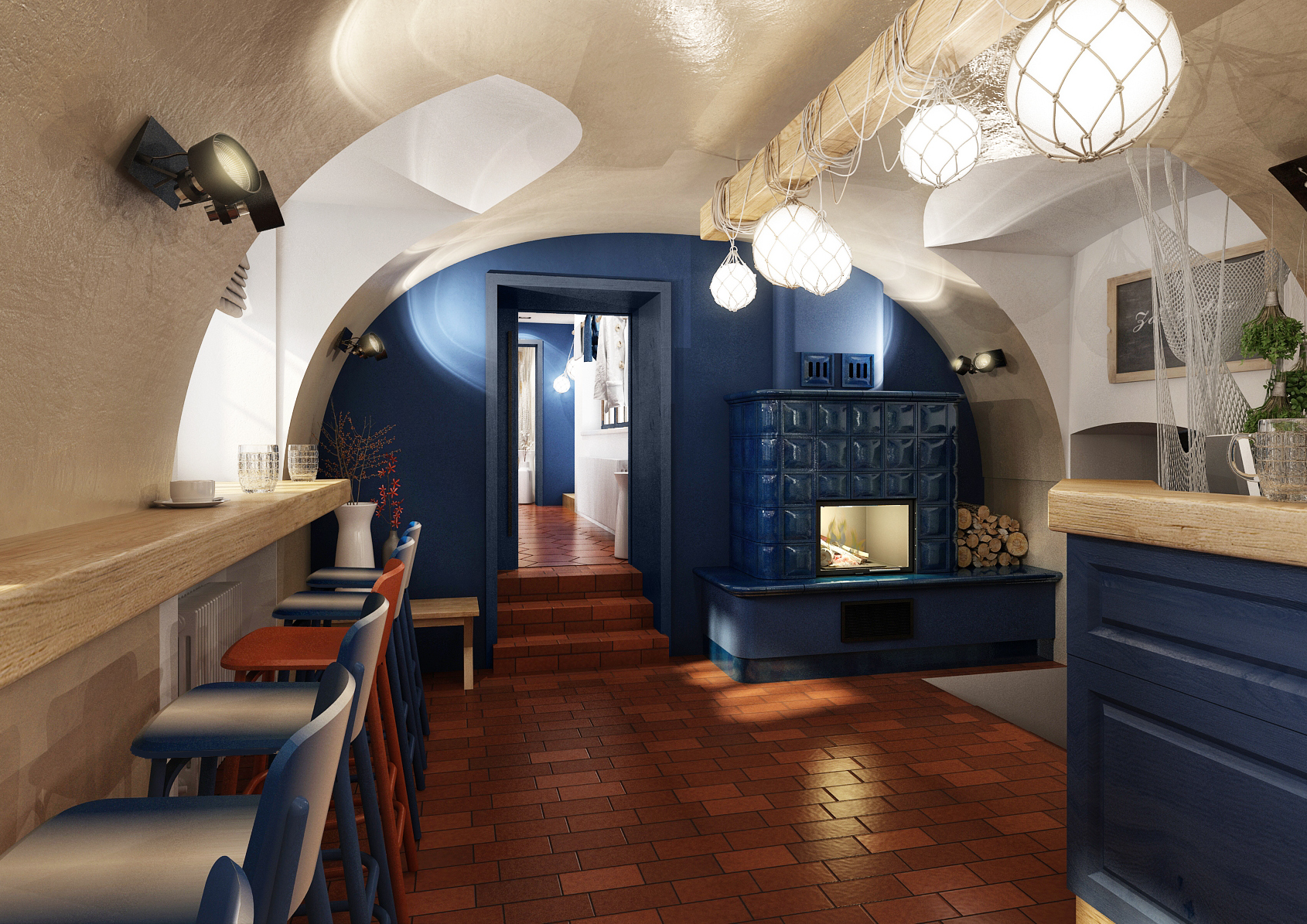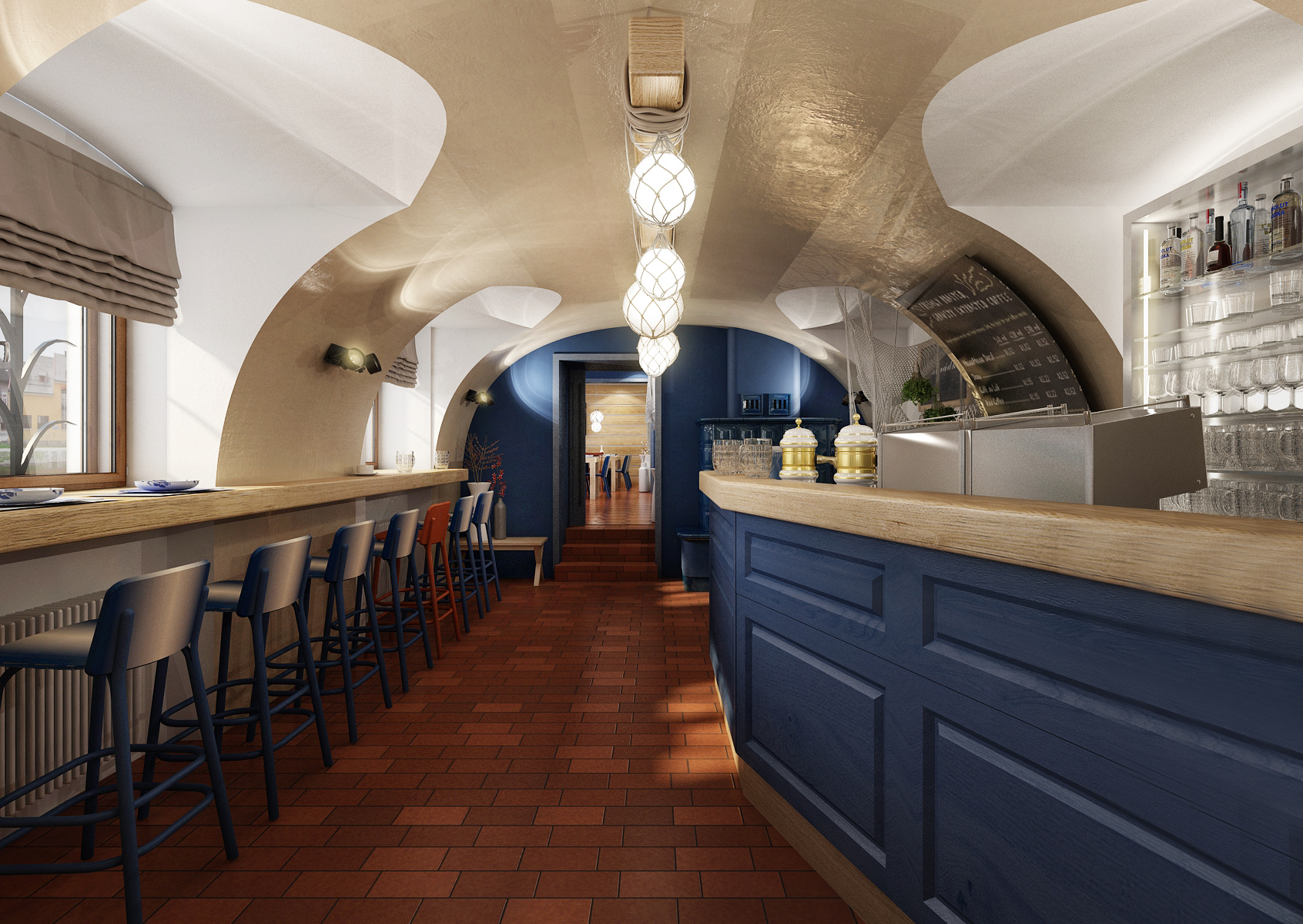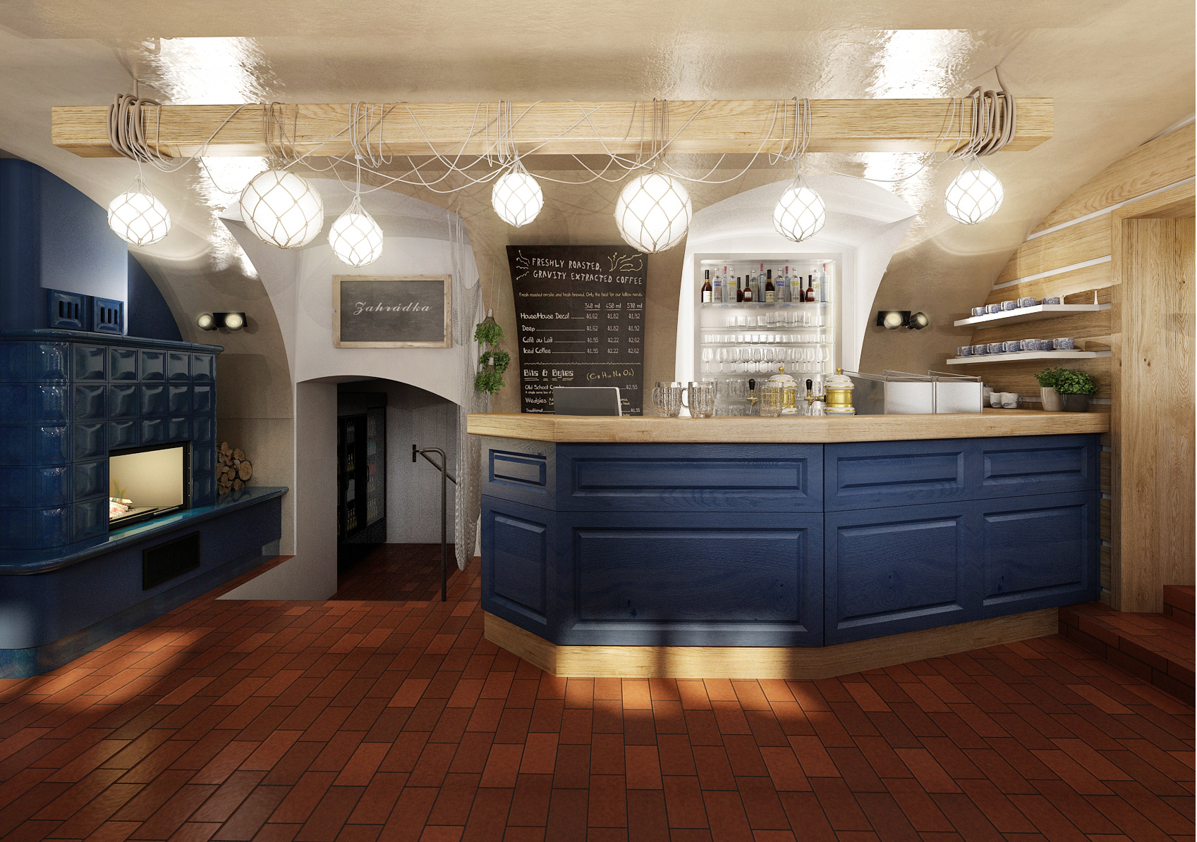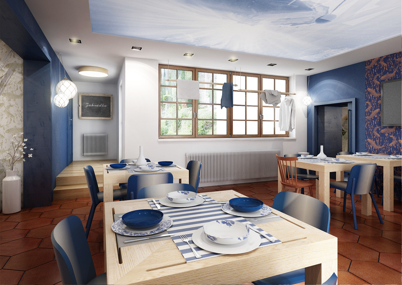 Vltavská pohádka, který prezentujeme v záložce Design hotelů, jsou koncipovány do stejné barevnosti a vodácké tématiky. Modrá barva, pruhy, sítě, rybí tapety, pádla nahrazující věšáky, to vše evokuje vodu. Cihlová dlažba se skvěle doplňuje s masivním dubovým obložením a nábytkem vyrobeným na míru. Barevné židle Ironica a kachlová kamna nalezneme i v hotelových pokojích. No nemáte chuť se ubytovat? Recepce je hned u vchodu.