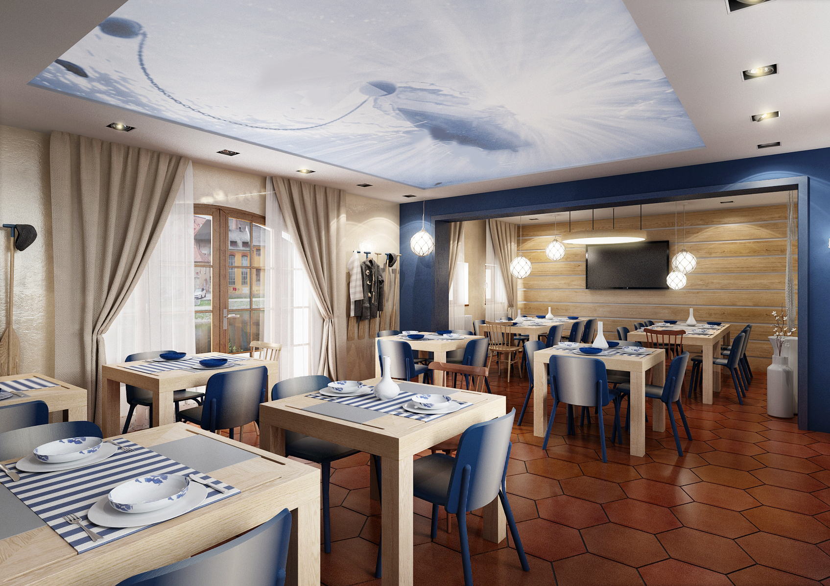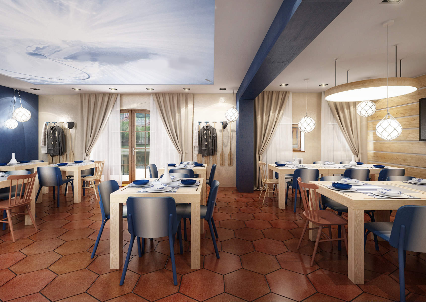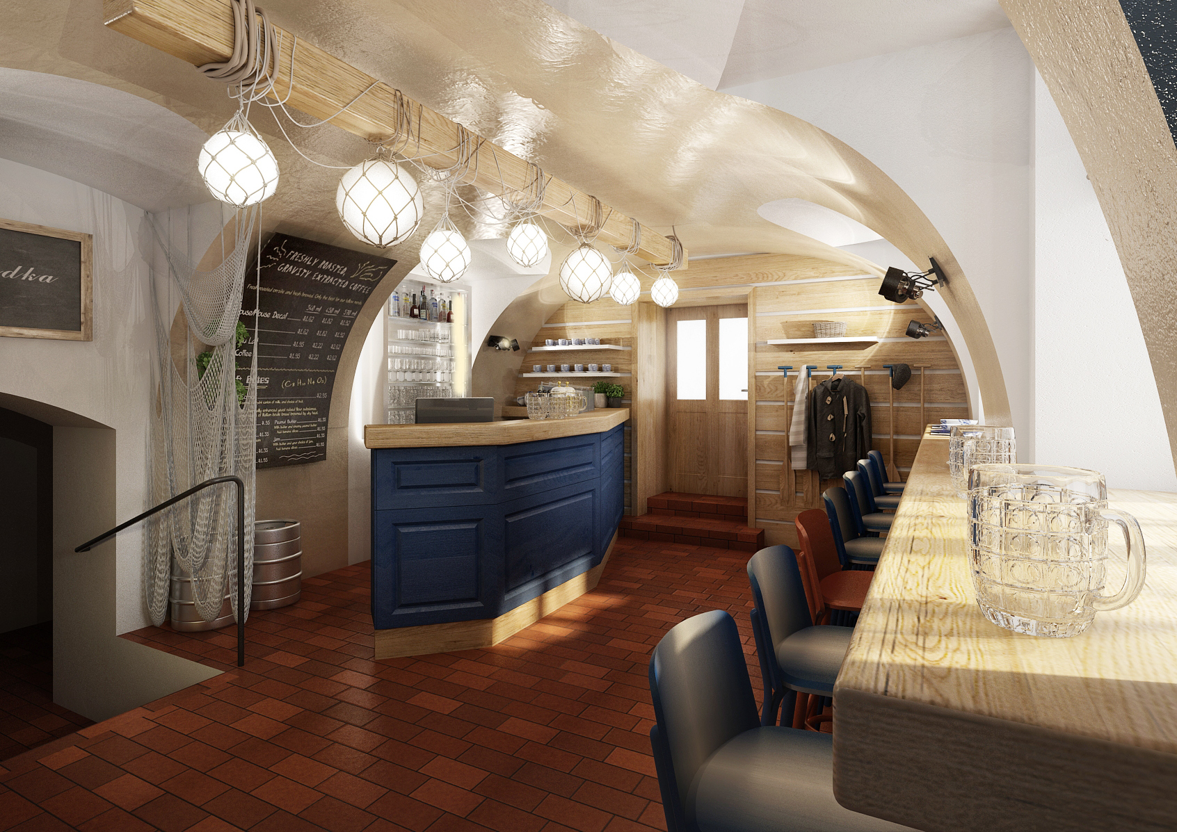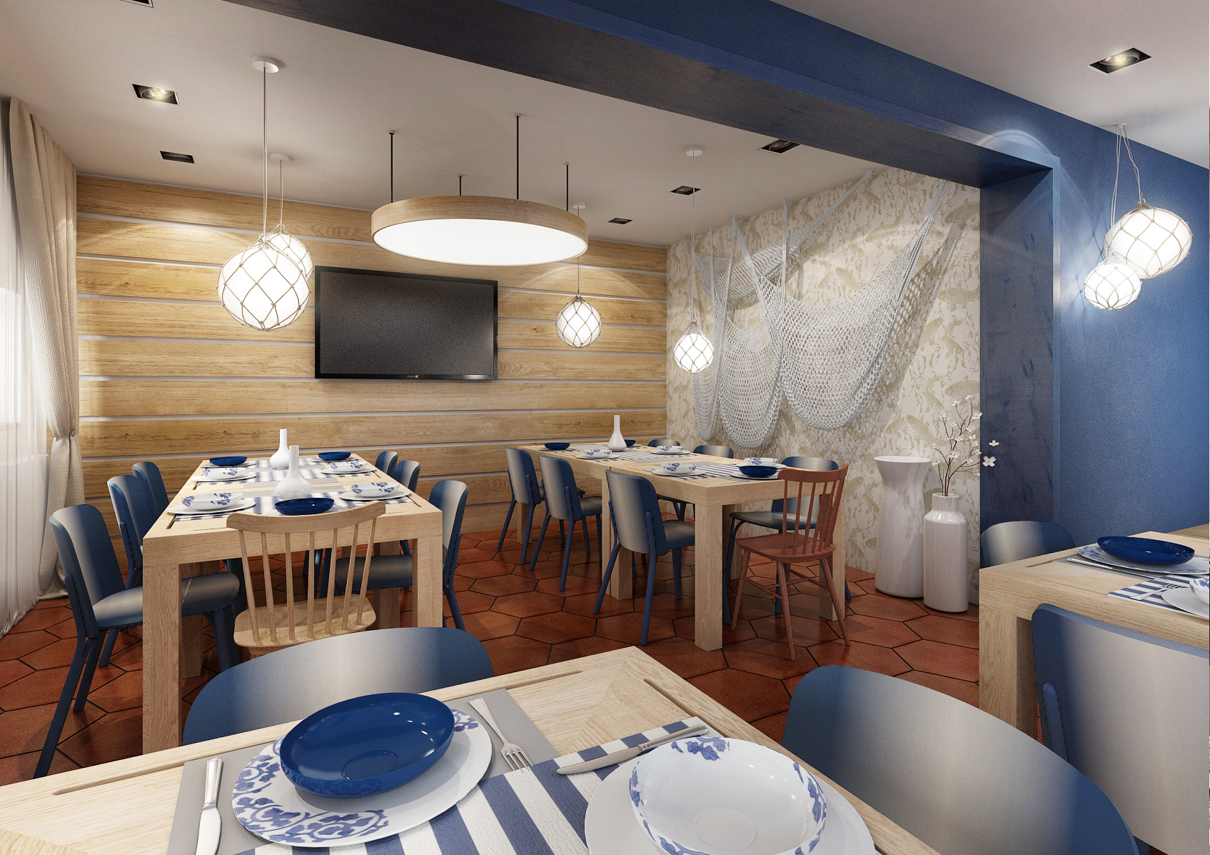 Vltavská pohádka, který prezentujeme v záložce Design hotelů, jsou koncipovány do stejné barevnosti a vodácké tématiky. Modrá barva, pruhy, sítě, rybí tapety, pádla nahrazující věšáky, to vše evokuje vodu. Cihlová dlažba se skvěle doplňuje s masivním dubovým obložením a nábytkem vyrobeným na míru. Barevné židle Ironica a kachlová kamna nalezneme i v hotelových pokojích. No nemáte chuť se ubytovat? Recepce je hned u vchodu.