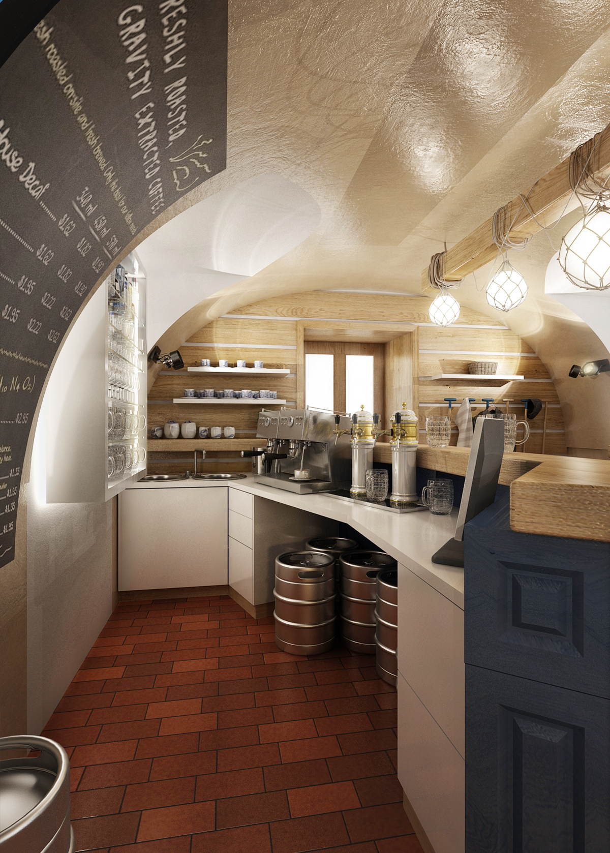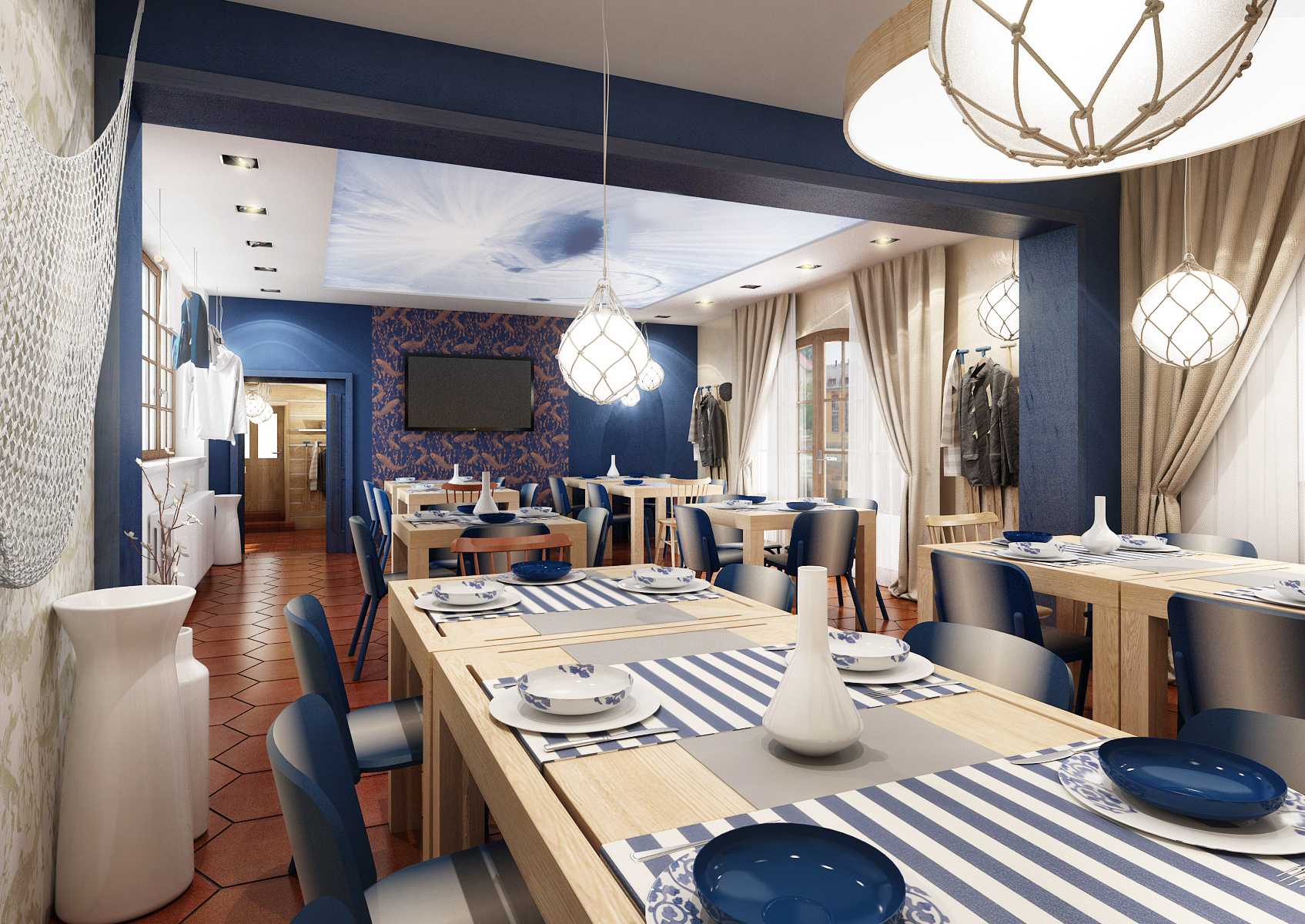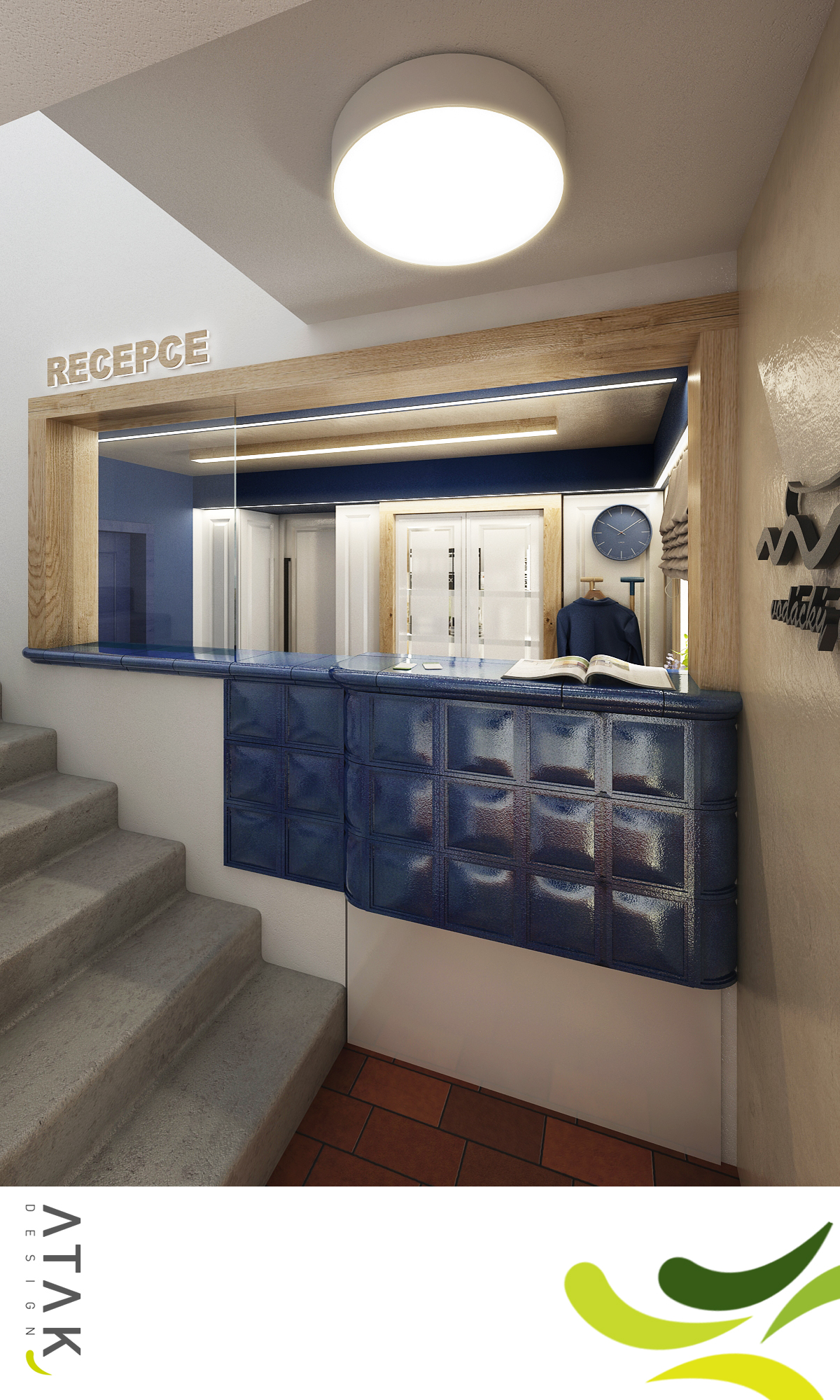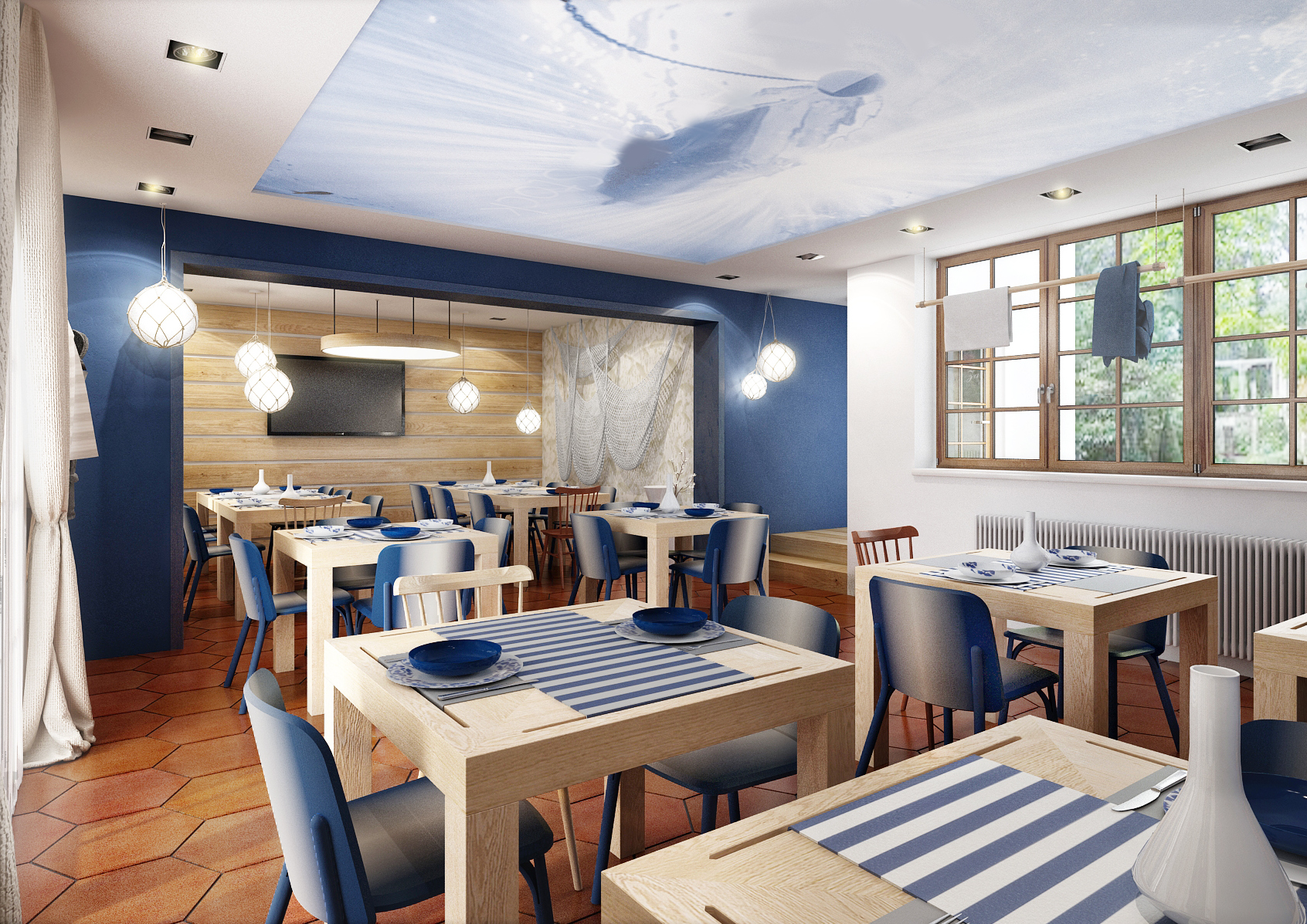 Vltavská pohádka, který prezentujeme v záložce Design hotelů, jsou koncipovány do stejné barevnosti a vodácké tématiky. Modrá barva, pruhy, sítě, rybí tapety, pádla nahrazující věšáky, to vše evokuje vodu. Cihlová dlažba se skvěle doplňuje s masivním dubovým obložením a nábytkem vyrobeným na míru. Barevné židle Ironica a kachlová kamna nalezneme i v hotelových pokojích. No nemáte chuť se ubytovat? Recepce je hned u vchodu.