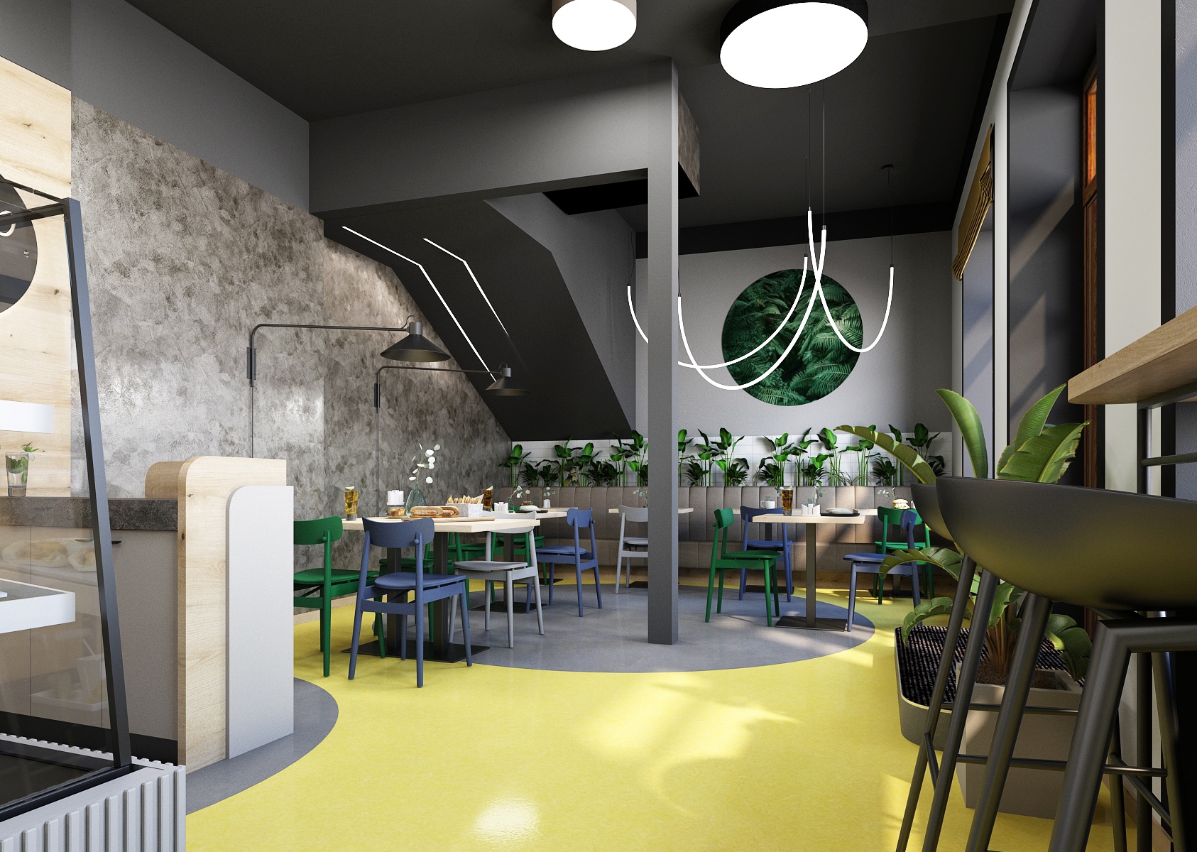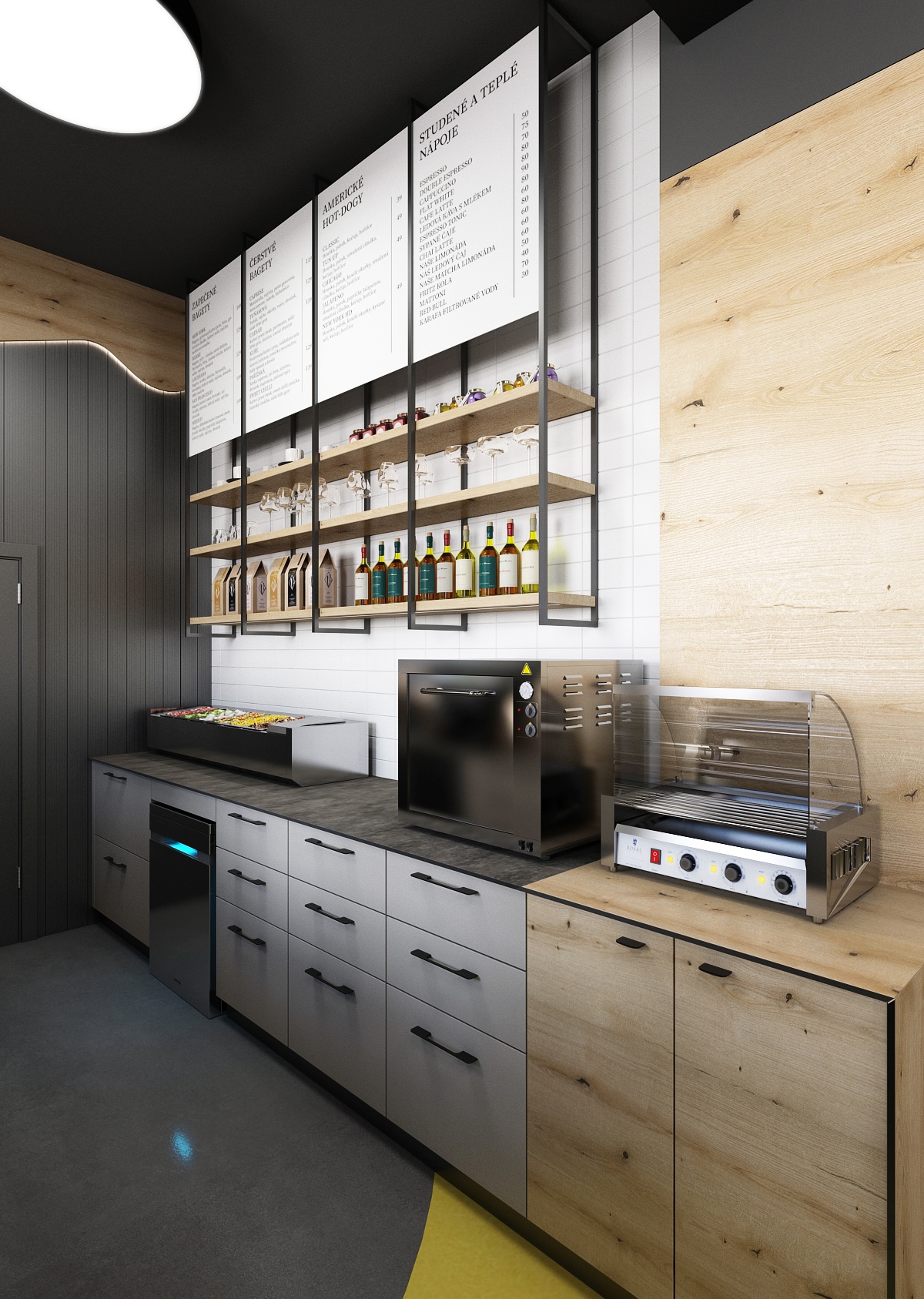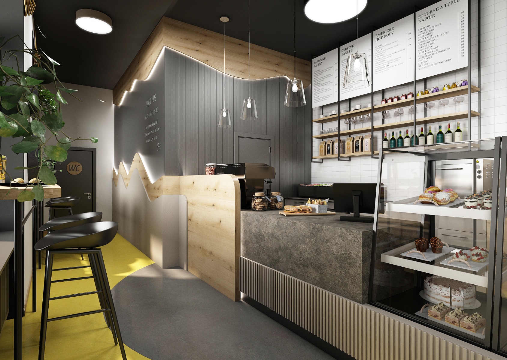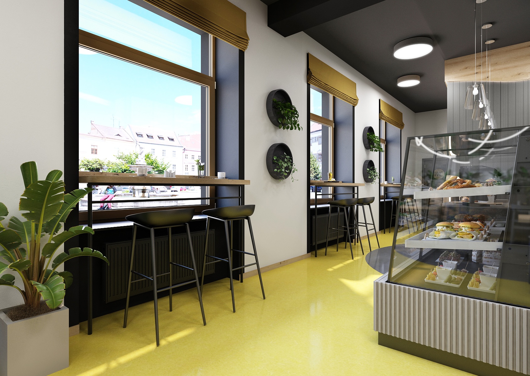 Černý strop je doplněn asymetricky rozmístěnými stropními svítidly a stěny jsou opatřeny šedou dekorativní stěrkou. Spolu dohromady tak dodávají bistru nádech elegance.