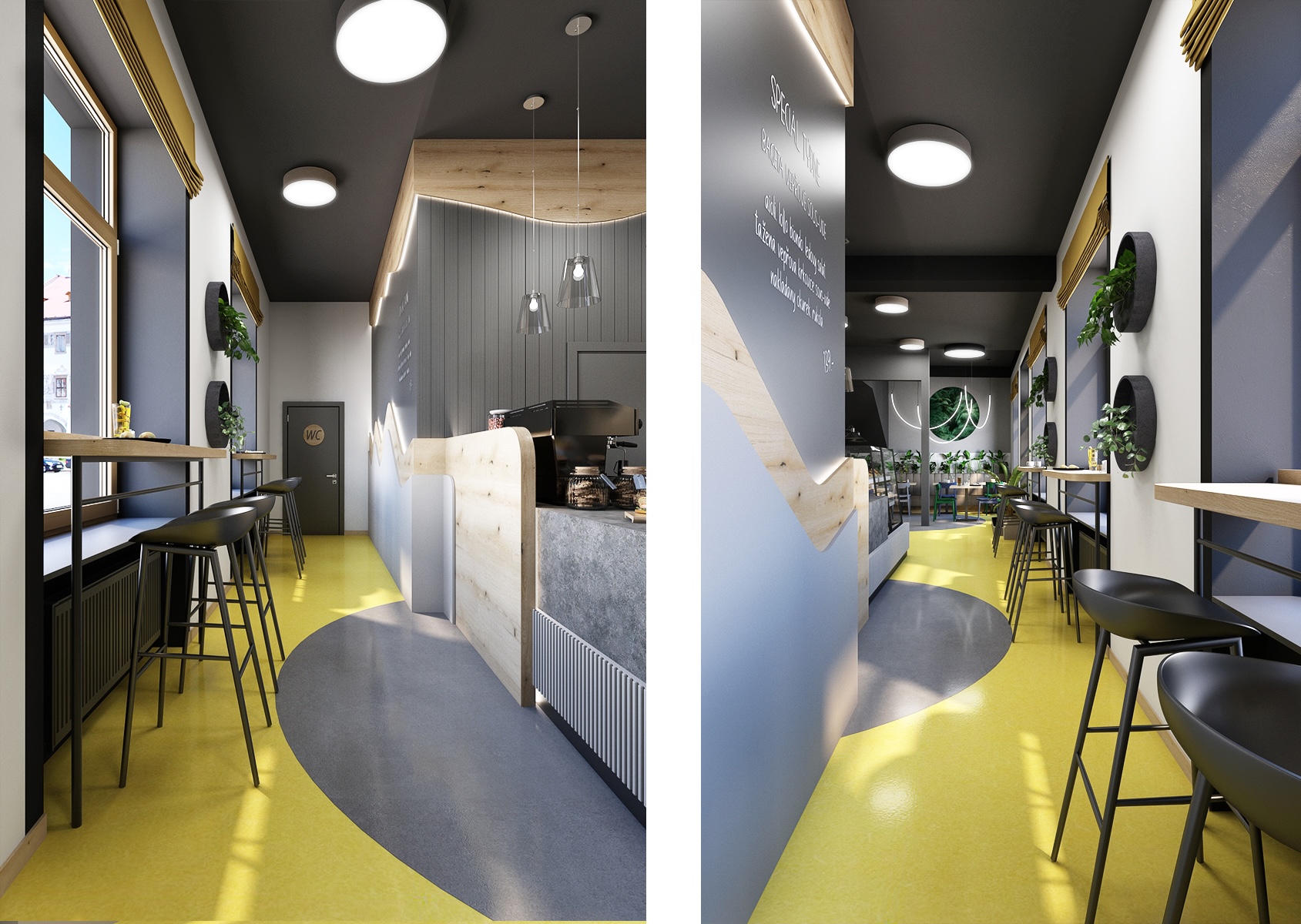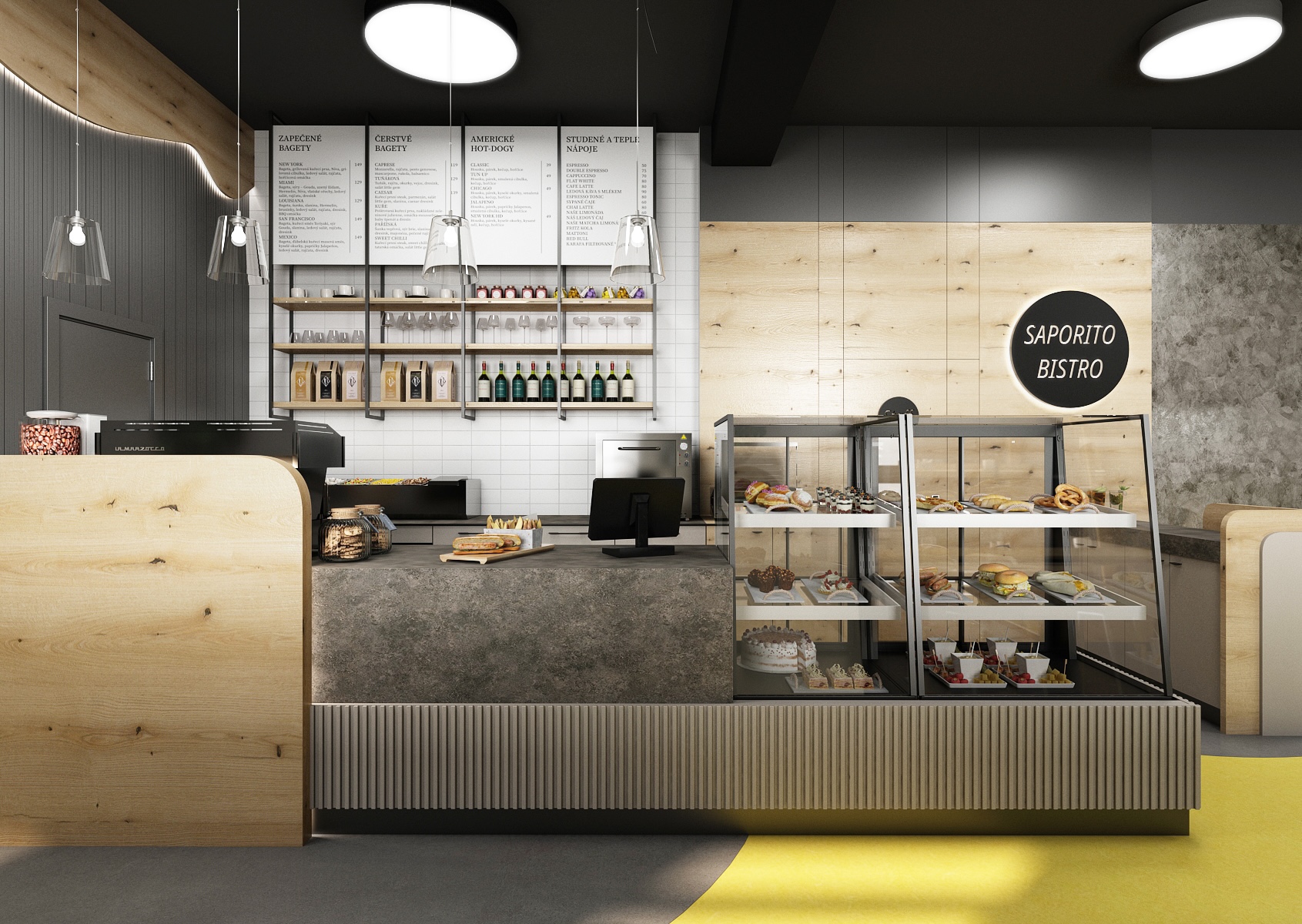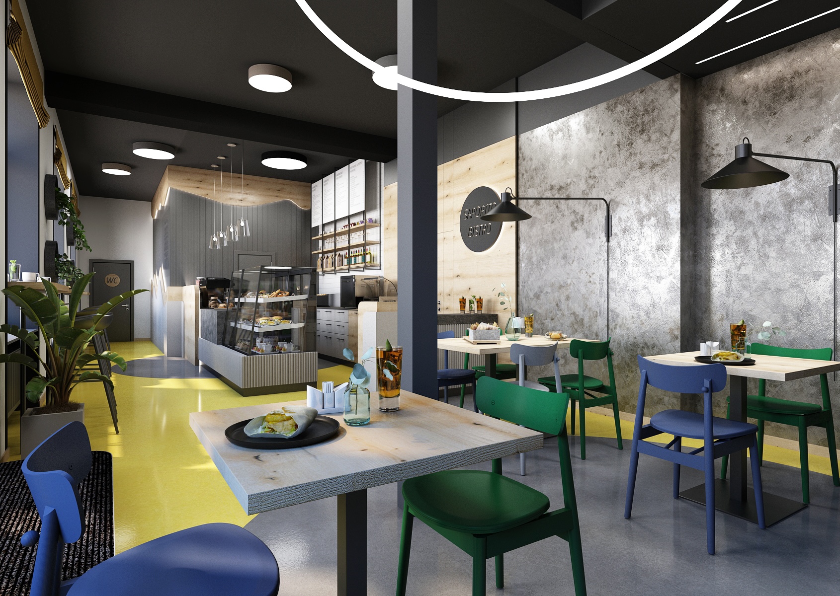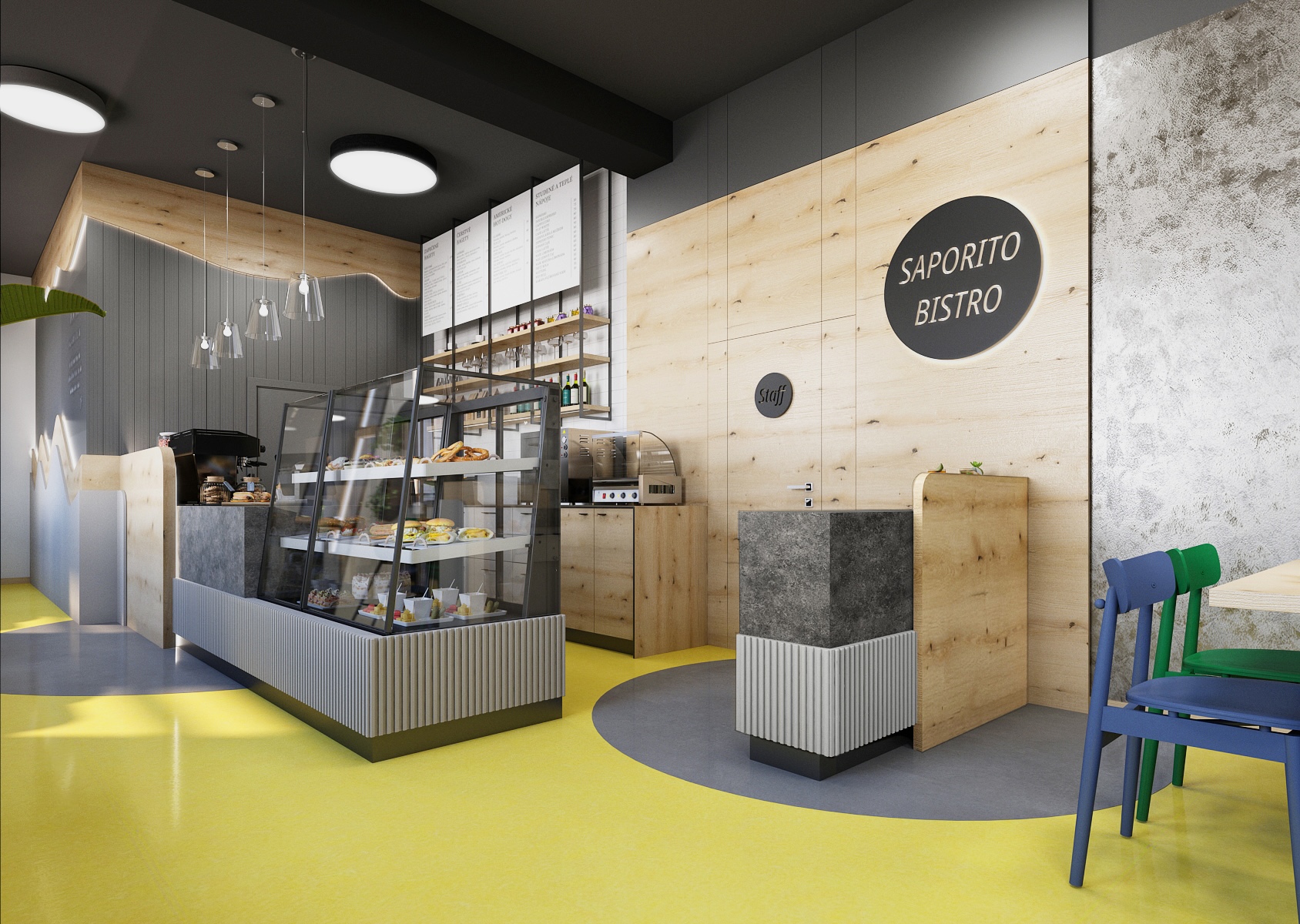 Bistro Saporito je laděno do tmavých odstínů barev, které jsou kombinovány s dubovým dřevodekorem a akcentem žluté, modré a zelené.