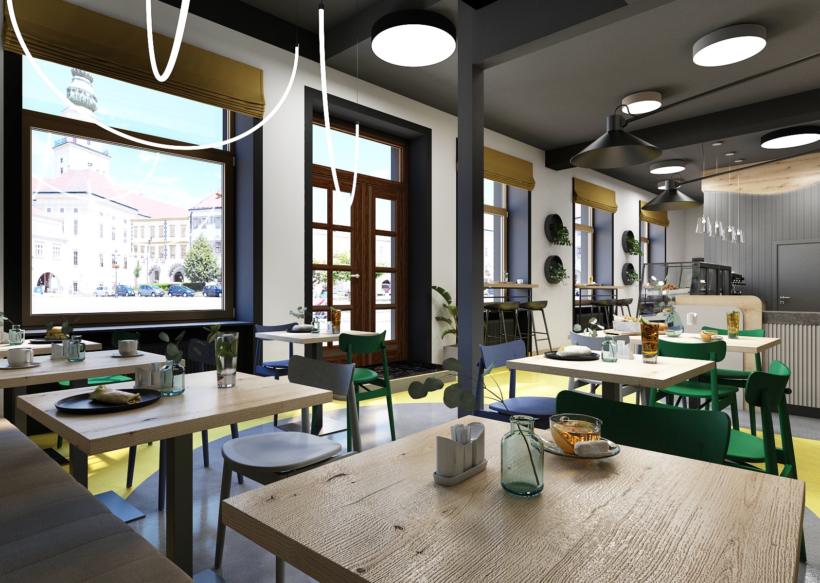 Při vstupu do interiéru vás uvítá otevřený prostor bistra, kdy se na každém rohu nachází něco, co stojí za kousek pozornosti. Spojení s přírodou je zde promítnuto i ve volbě dekorací a barevných akcentů. Prostory jsou doplněné zelení, ať už v podání rostlin, volby barev vybavení či grafiky na stěně.