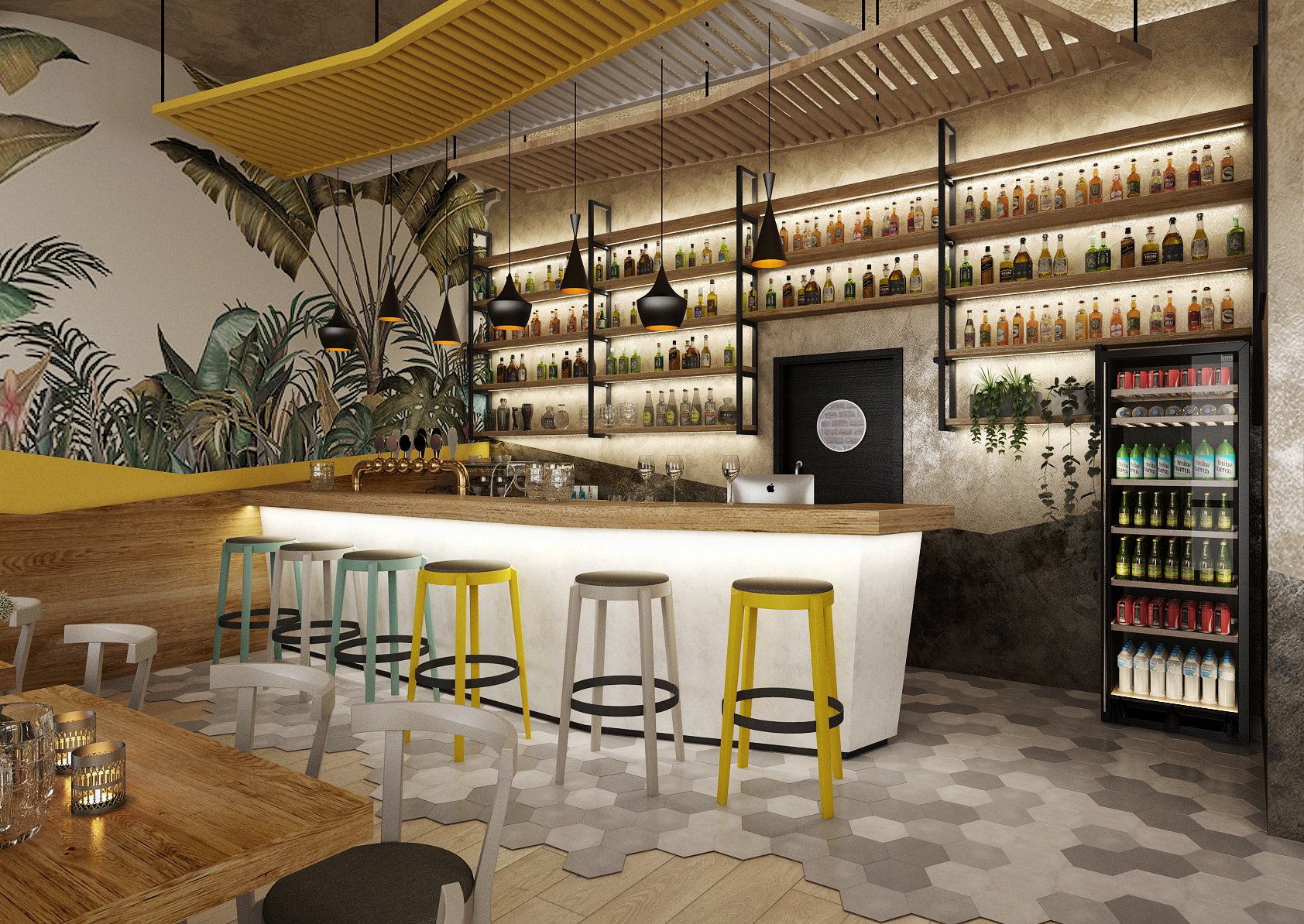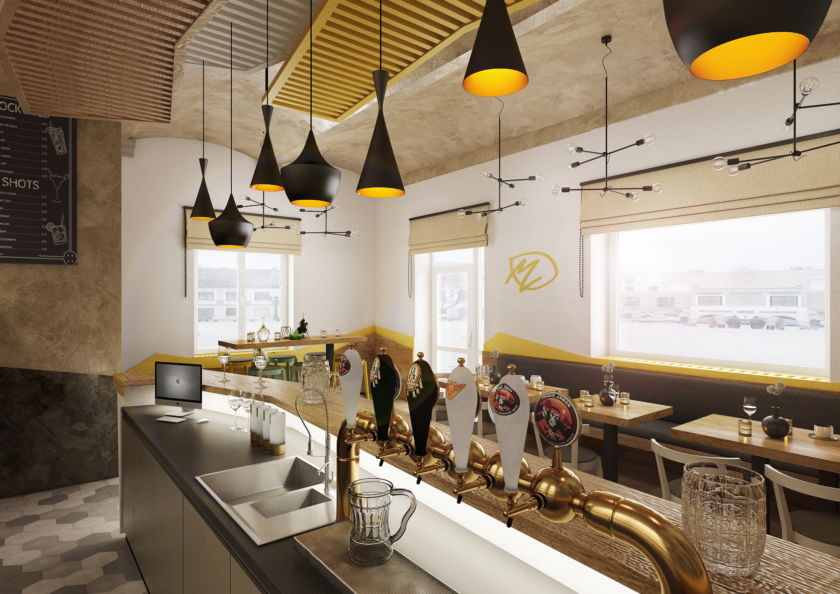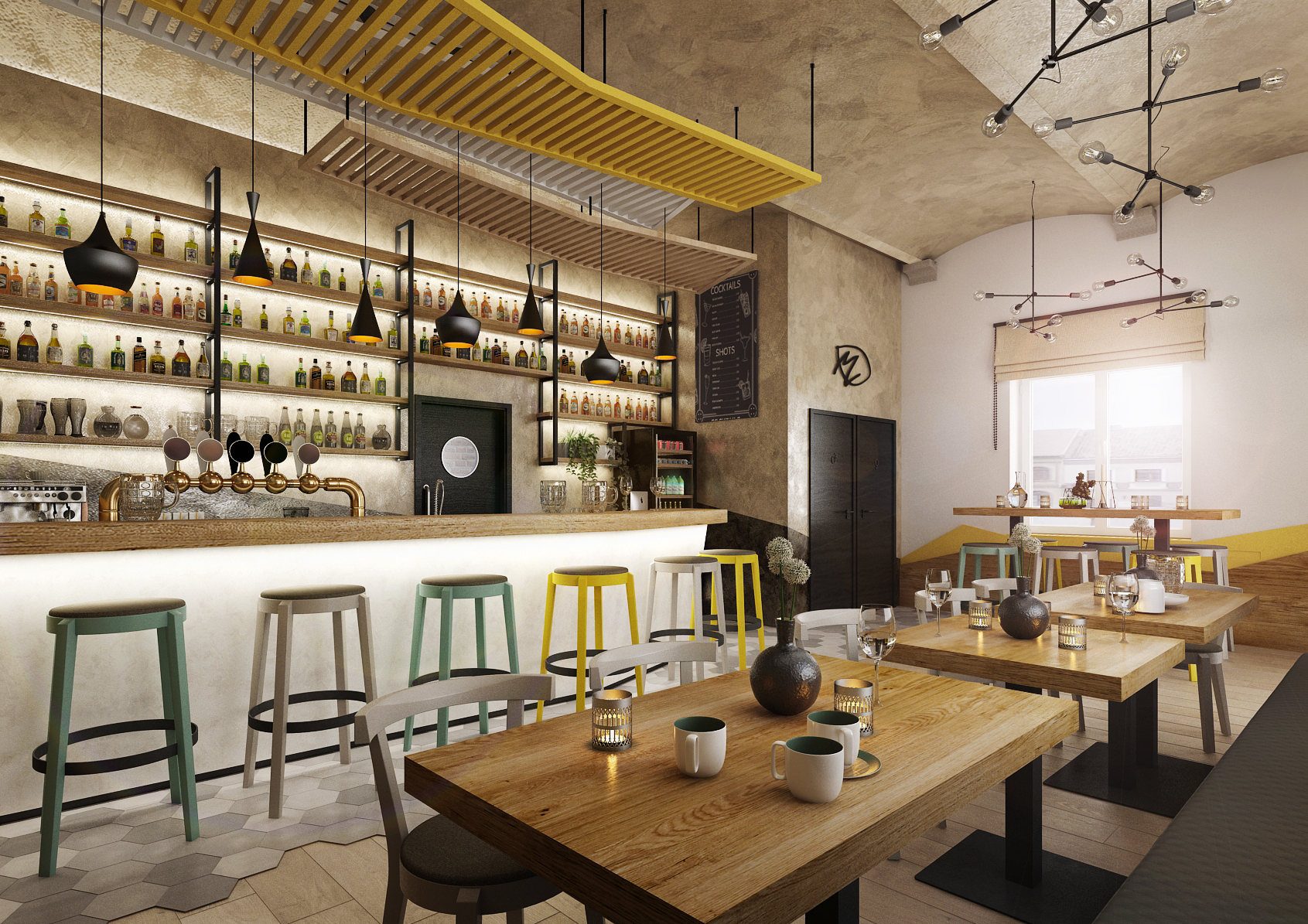 Restaurace/bar je situovaná v historické zástavbě města, o čemž svědčí i vkusné vysoké půlklenuté stropy. Ten je vizuálně snížen pomocí laťových podhledů, které zároveň interiér doplňují a zpestřují.