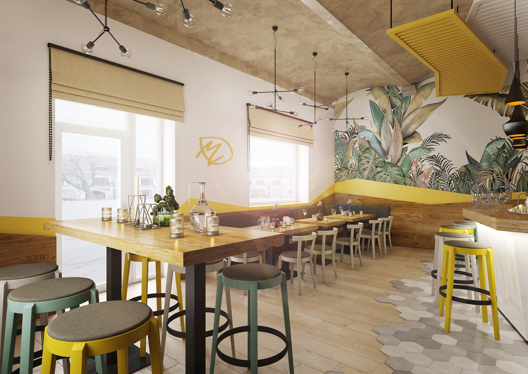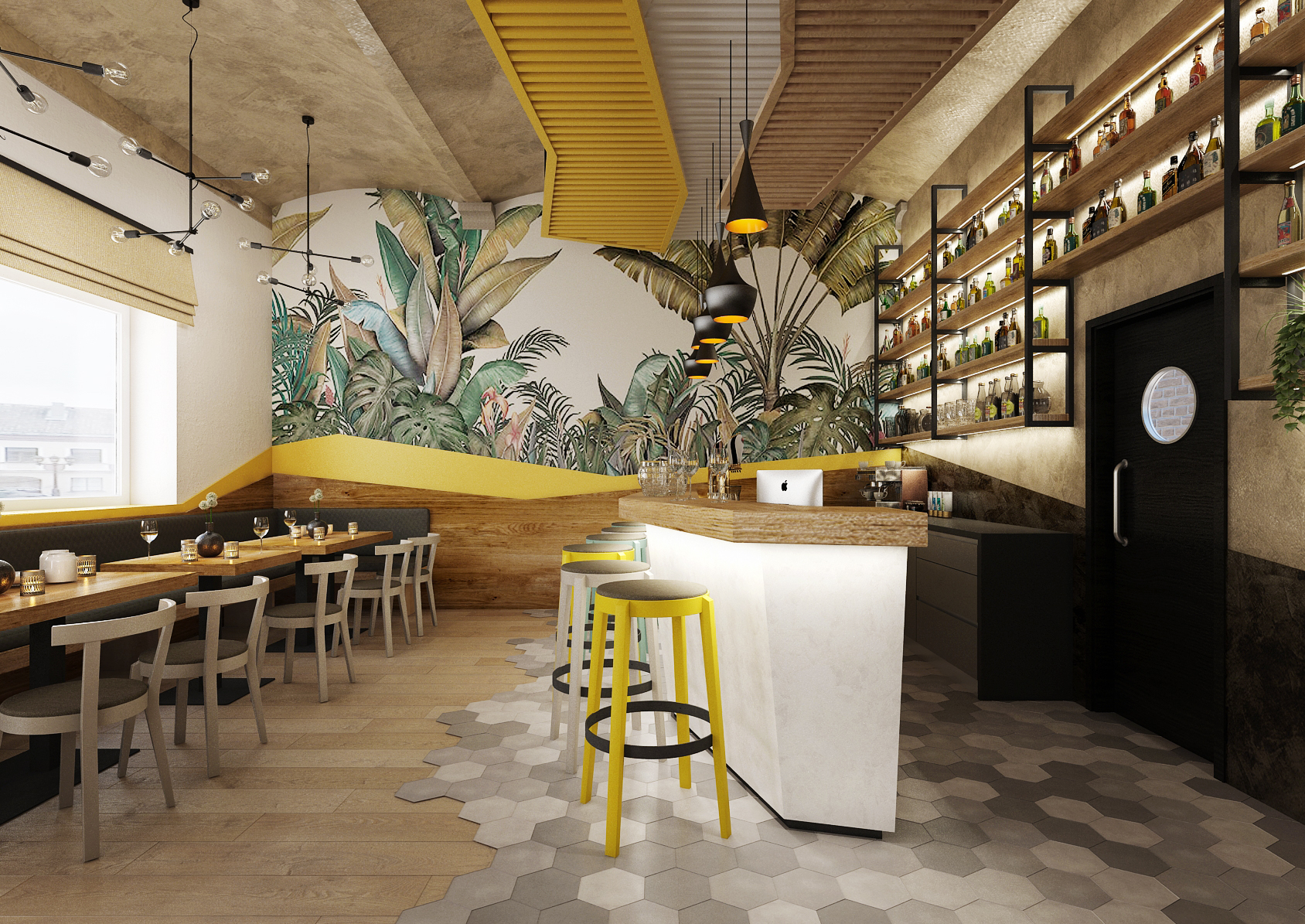 Prostory restaurace v Karlových Varech se nesou v jungle stylu, který disponuje hlavně florálními prvky na tapetách.