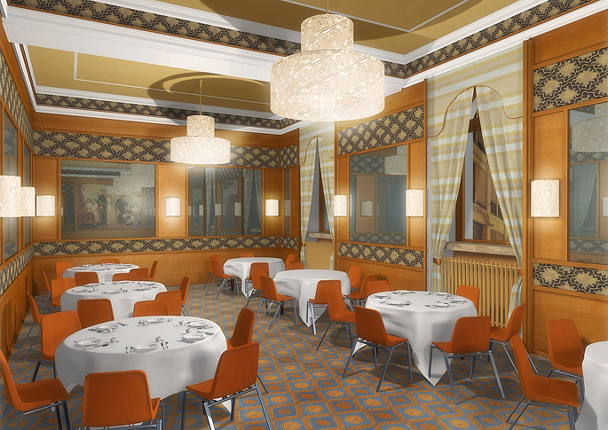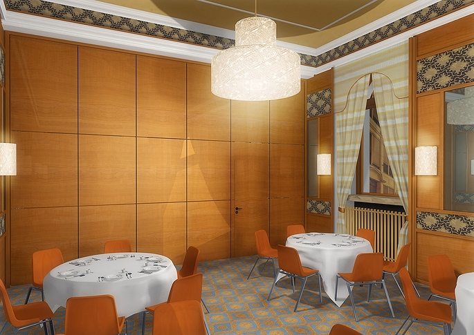 Návrh tanečního sálu a restaurace v secesním stylu. Sál je řešen multifunkčně a je jej možno rozdělit skládacím předělem. Zajímavým prvkem je vzorovaná podlaha, která v kombinaci s obkladem v bukové dýze působí pestře a vesele. Tmavší barvy jsou sladěny se světlým stropem. Nechybí ani honosné lustry kotveny ve stropě a svítidla na stěnách ve stejném designu. Místnost opticky zvětšují nástěnná zrcadla.