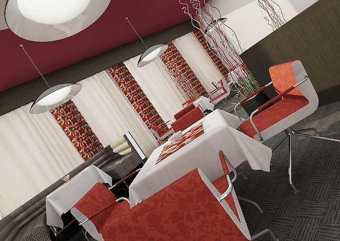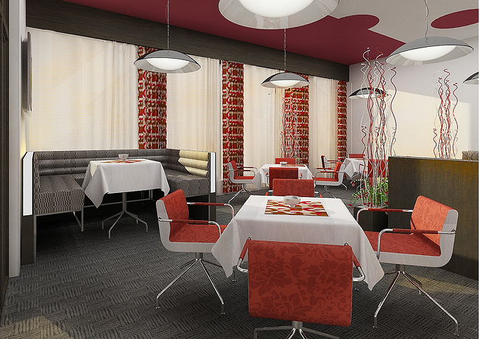 Prostor hotelové restaurace je laděn do červeno-šeda. Čalounění a koberec jsou sladěny do jednoho vzoru. Chromové nohy stolů a židlí dotváří čistý a moderní interiér restaurace. Zajímavým prvkem jsou storpní svítidla a pestře vzorovaná tapeta na sloupech mezi okny. Do červena jsou laděny i dekorace a výmalba na stropě.