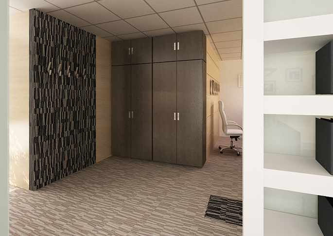 Pomáháme moderním firmám vytvořit kanceláře respektující firemní identitu a vizuální styl. Tato advokátní kancelář je laděna do světlých barev, které zvýrazňuje černá vzorovaná podlaha, která přechází do světlé barvy za předělem, který je tvořen bílou knihovnou. Za ní se schovává dlouhý stůl v tmavé barvě. Zbytek místnosti je navržen ve stejném stylu s tmavým nábytkem a světlým obkladem na stěnách. Neschází ani vzorovaná tapeta.